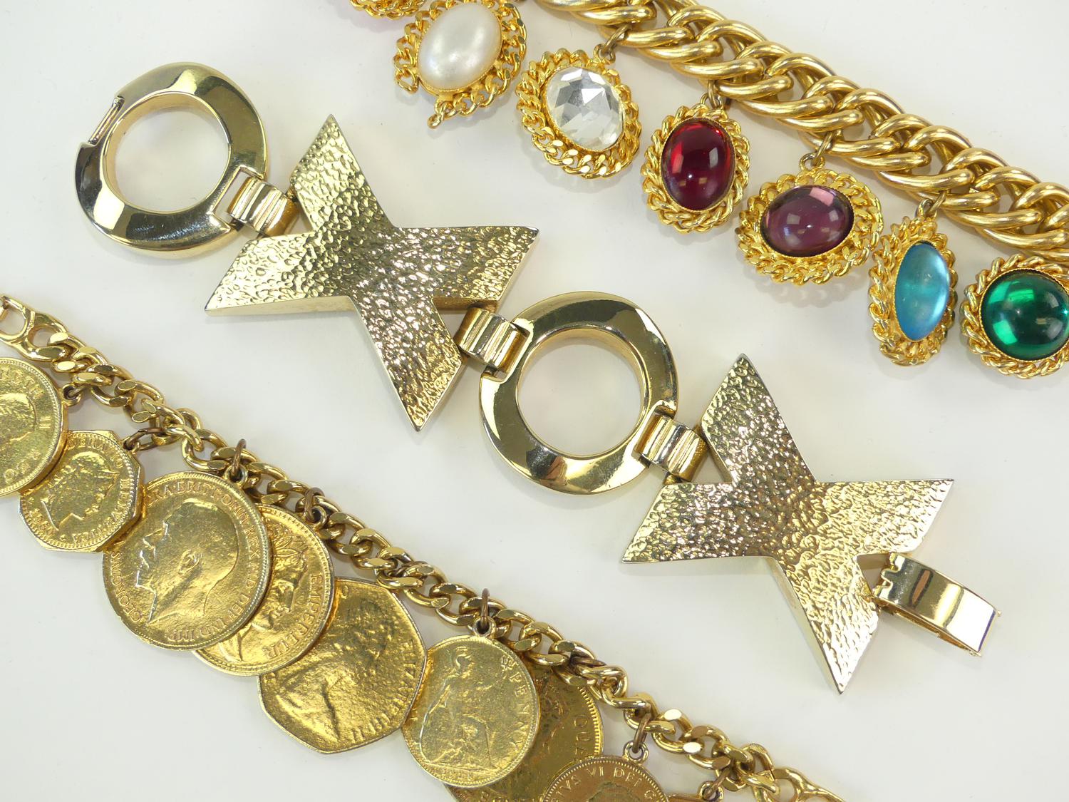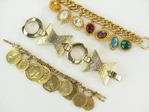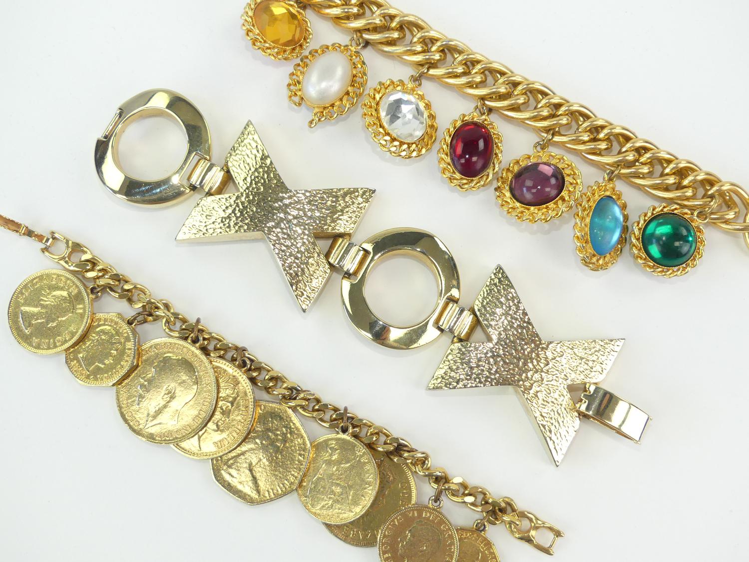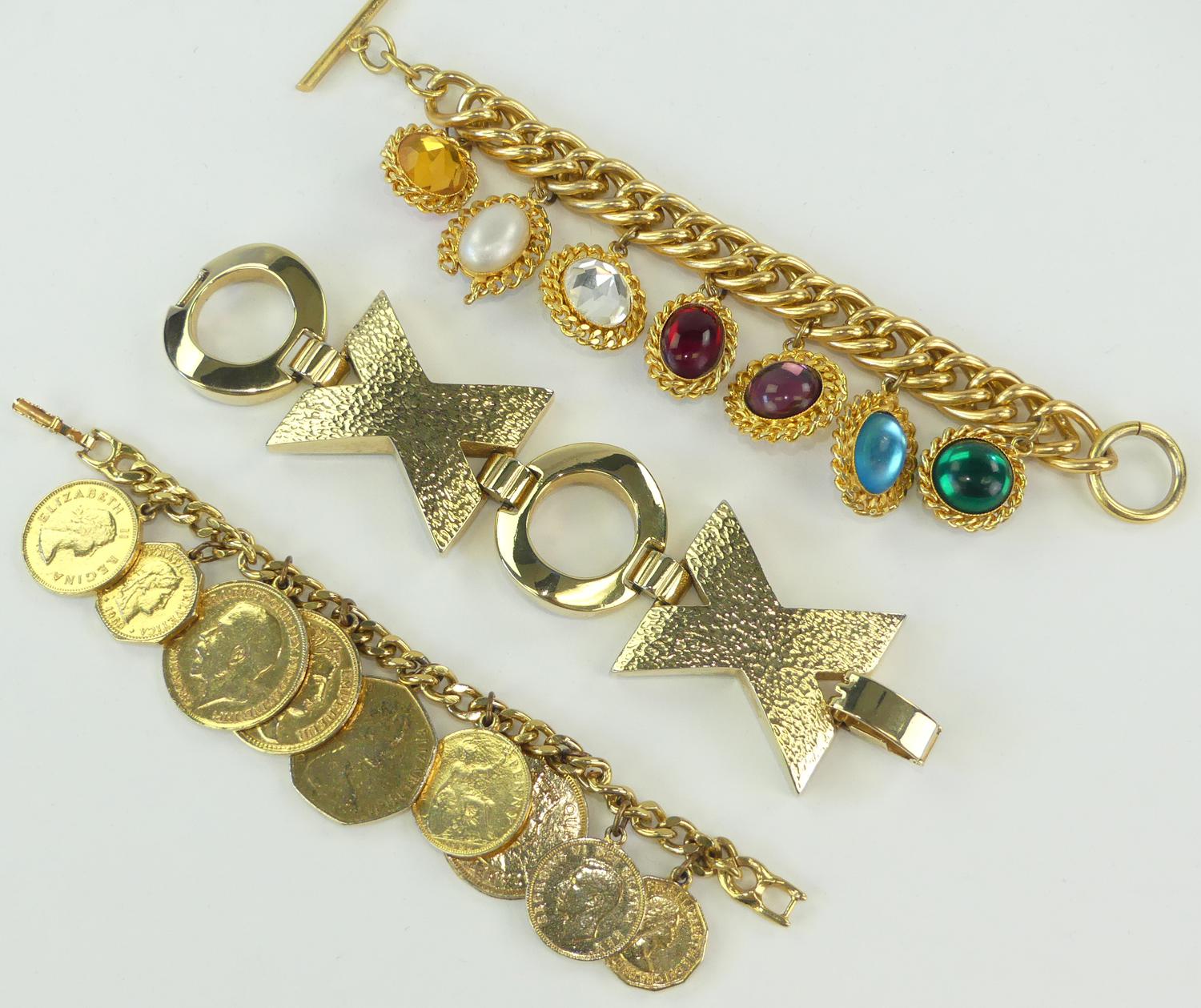 signed j. deegan xoxo bracelet, coin bracelet, gold plated charm bracelet, 1980s