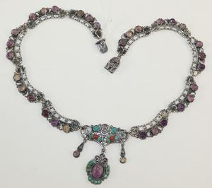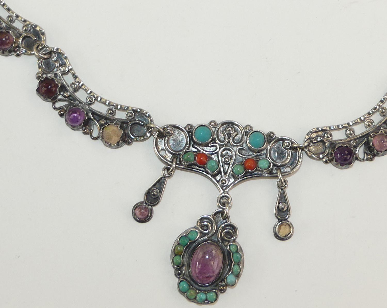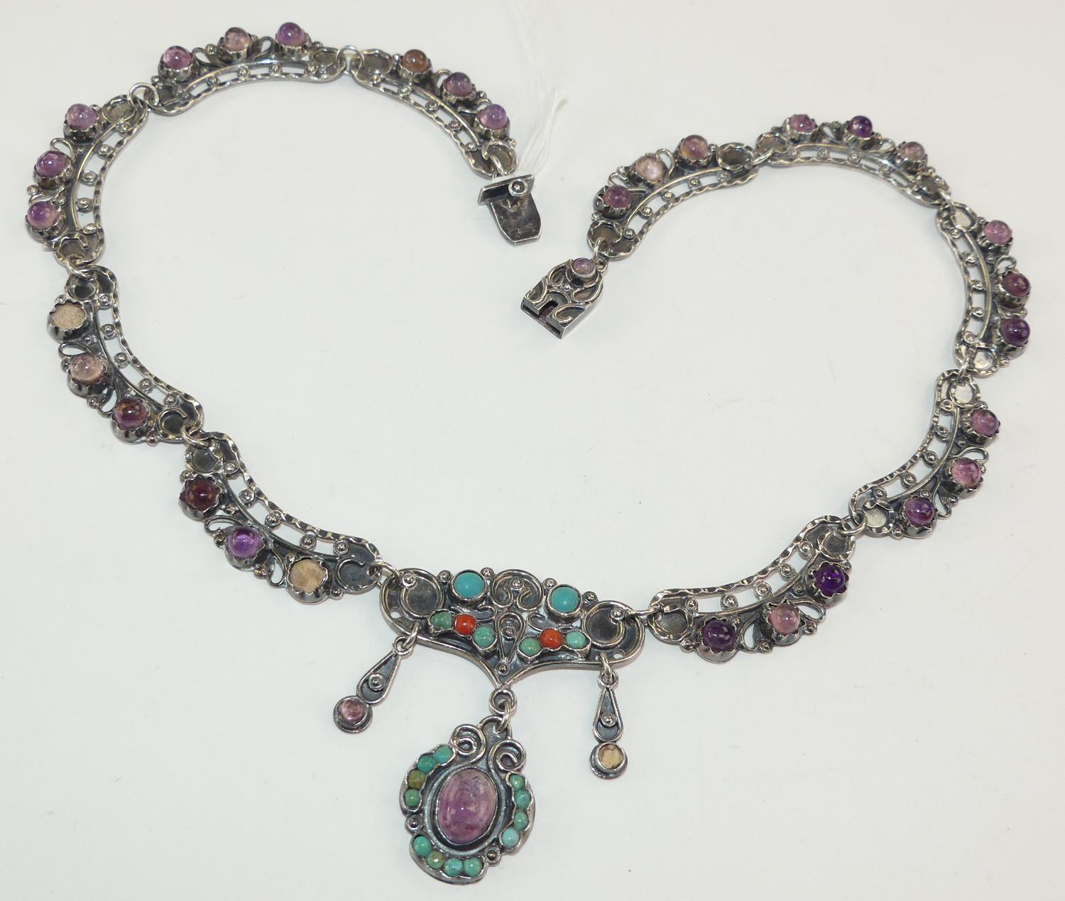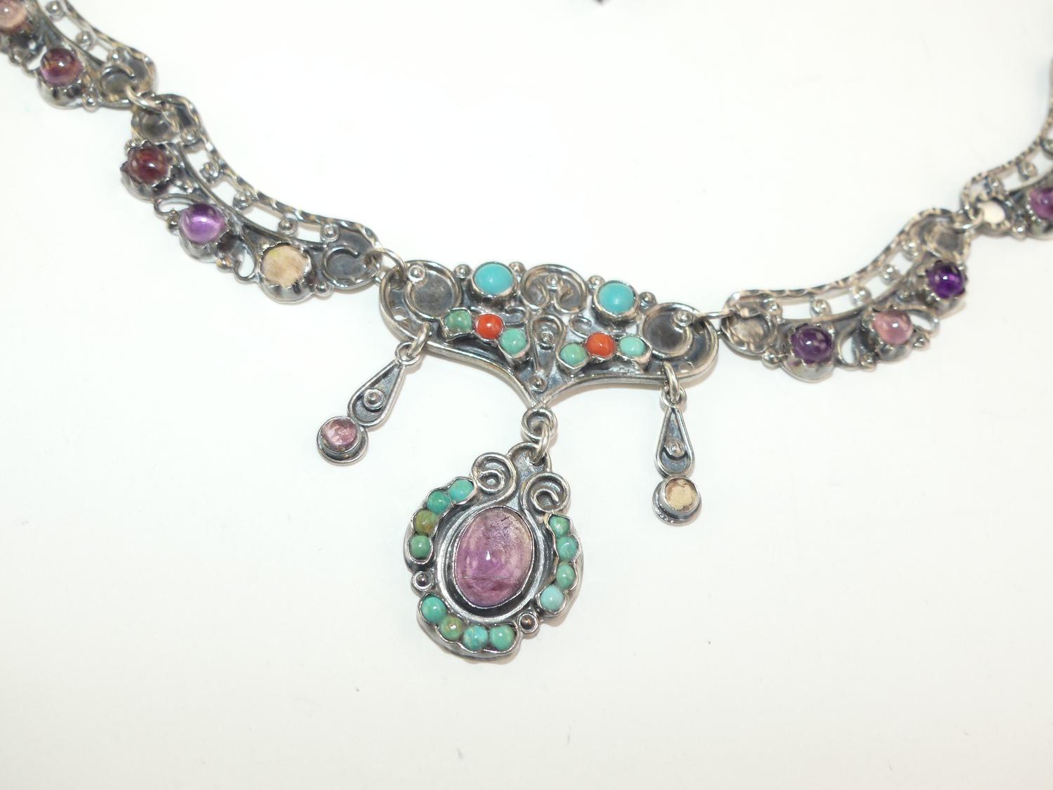 vintage mexican sterling silver amethyst turquoise coral collar necklace, weighing approx 49 grams, length 18"