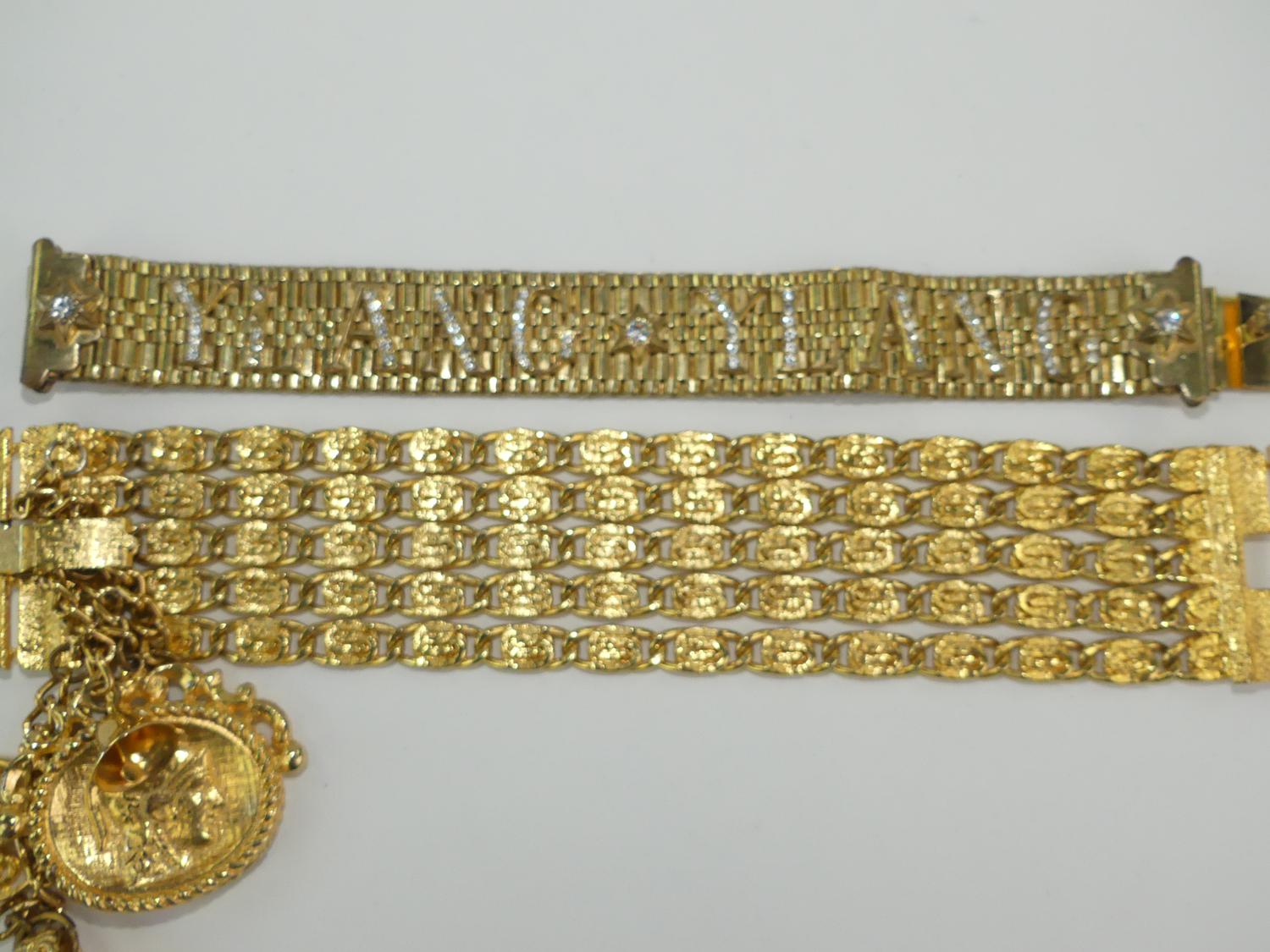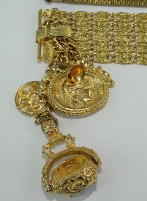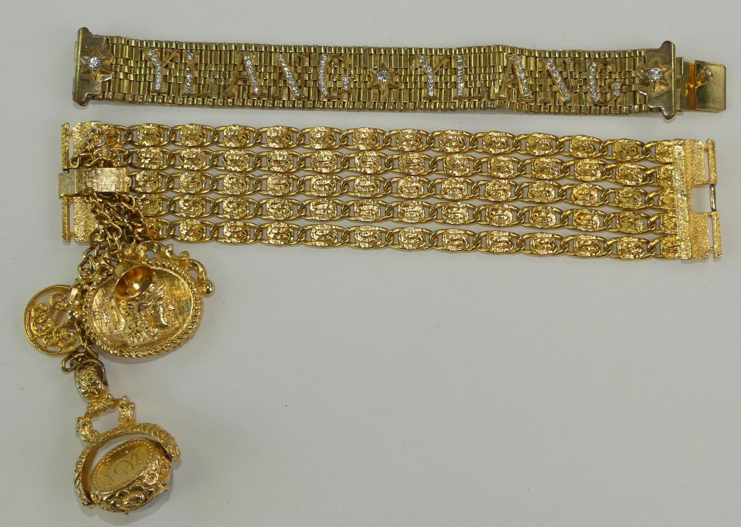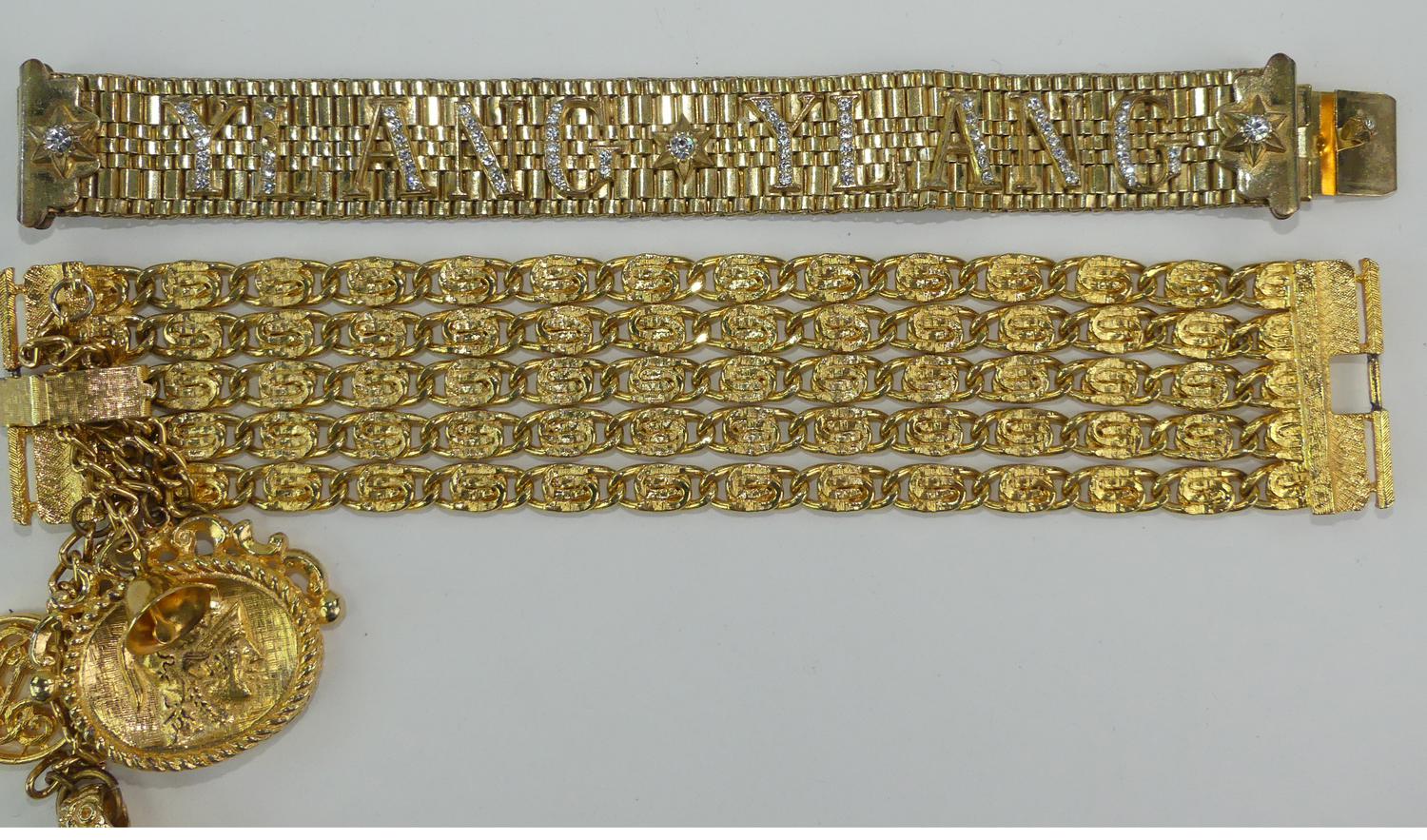 wide goldplated fob milti charm bracelet with ylang ylang bracelet, 1980s