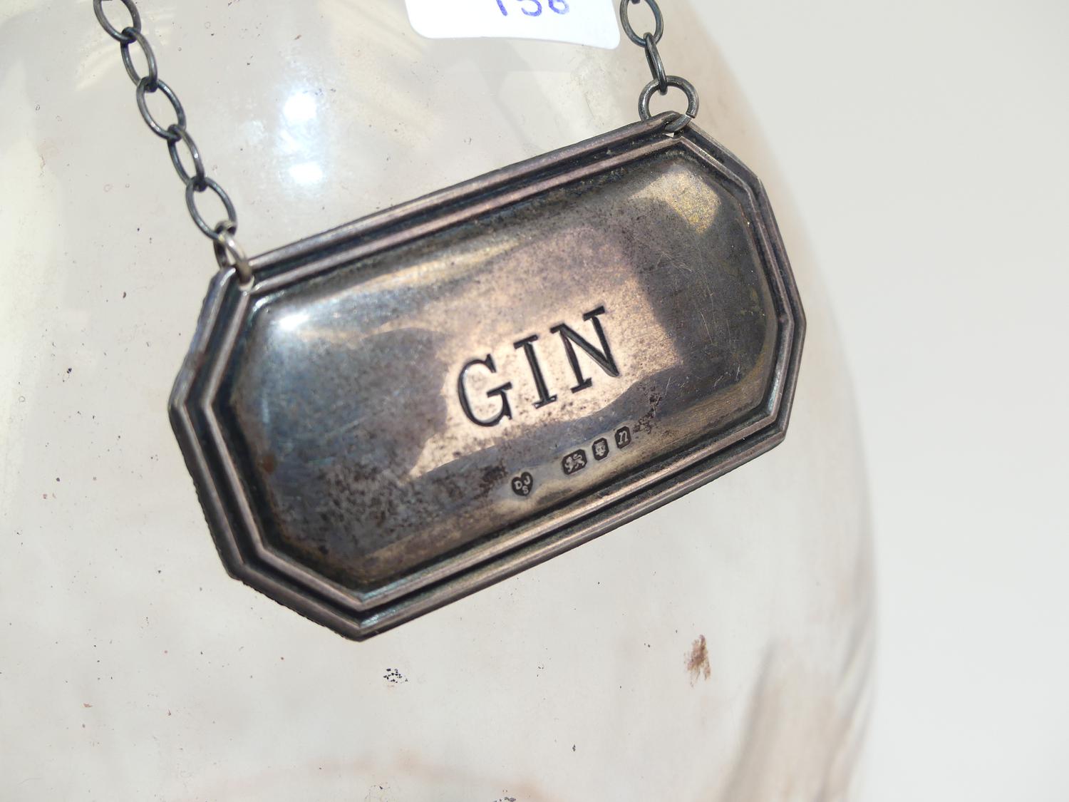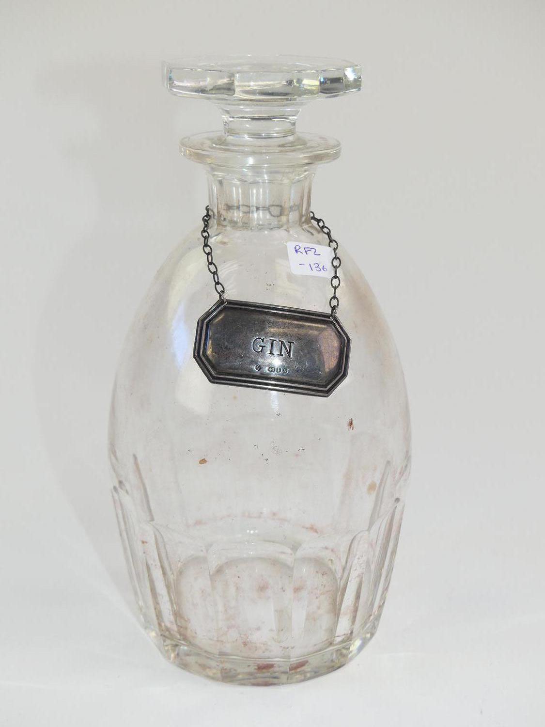 antique crystal decanter with hallmarked sterling silver "gin" bottle label, weighable 9 grams