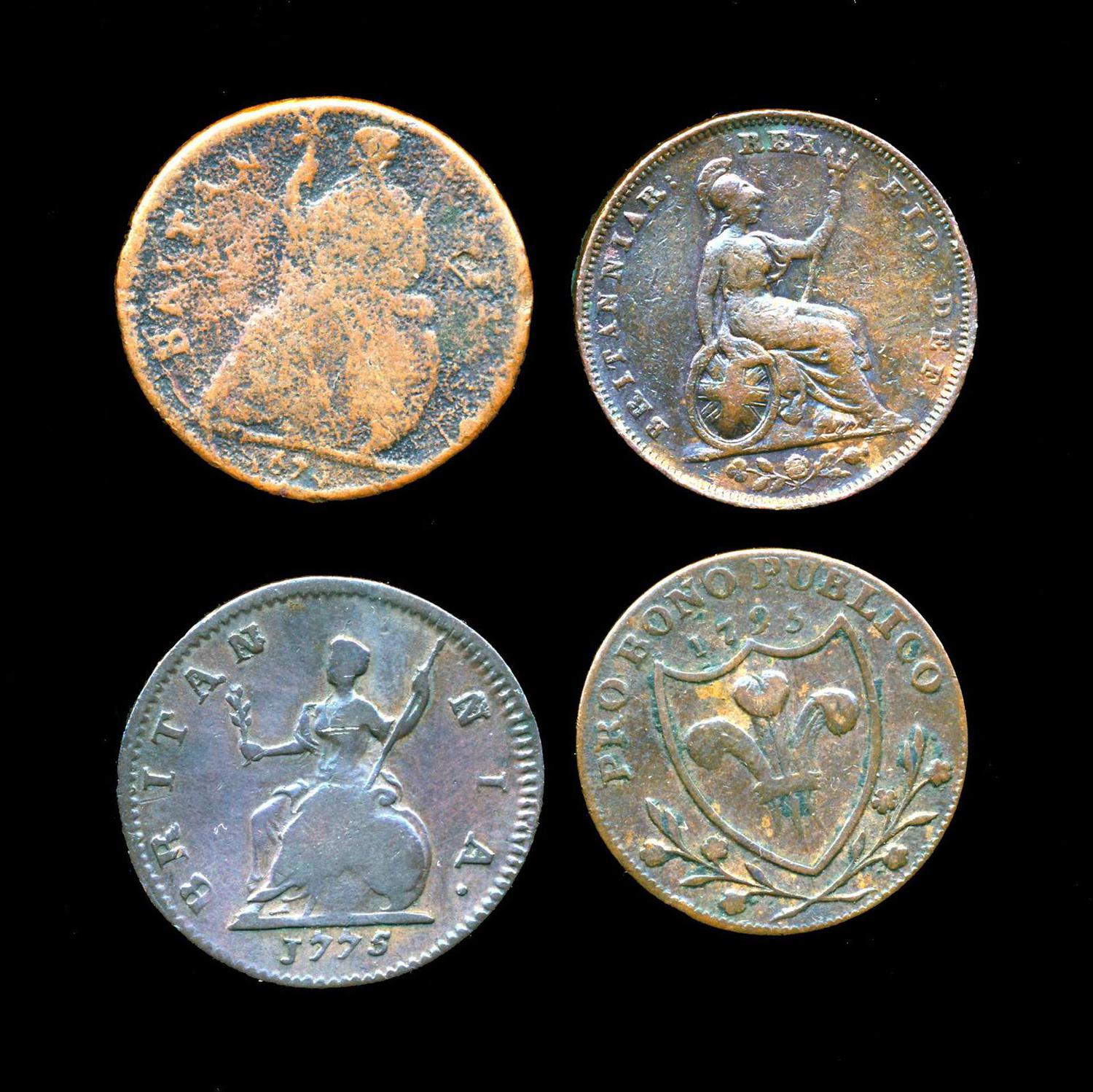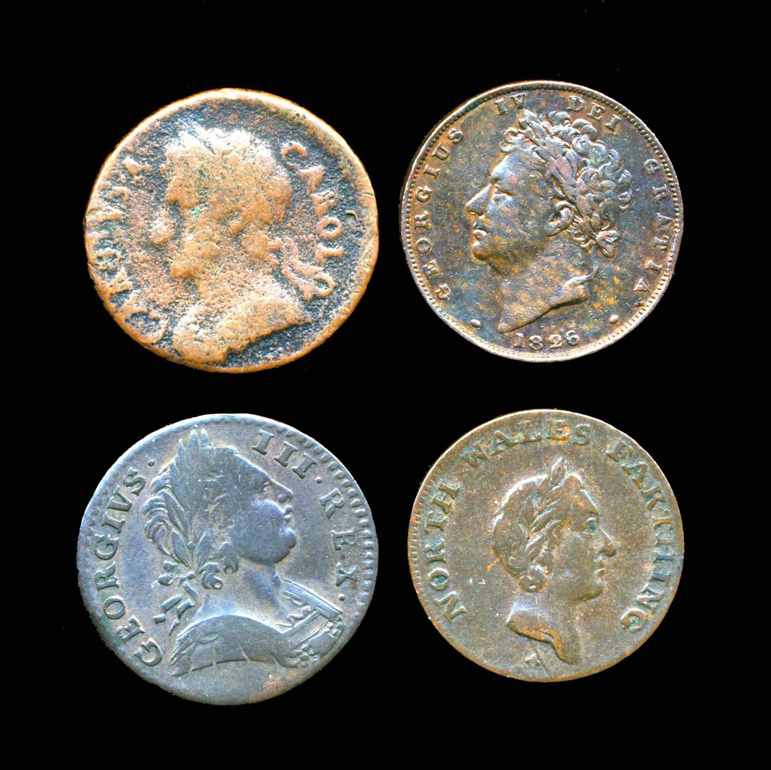 1674 KM# 436.1 Charles II F, 1775 KM# 602 George III VF, 1795 North Wales Farthing Pro Bono Publico w/trifoil beneath truncation VF and 1826 KM#697 Georges IV VF.?