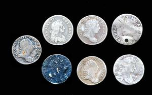 1625 Charles I 3 Pence KM# 86 S-2877 VG holed, 1679 Charles II 4 Pence KM# 434 S-3384 VG, 1681 3 Pence KM# 433 S-3386 F, 1689 William & Mary 3 Pence KM# 470.1 S-3441 F,1762-1766 George III KM# 591 S-3753 1762 F+, 1763 VG & 1766 F+ bent.