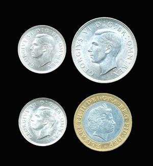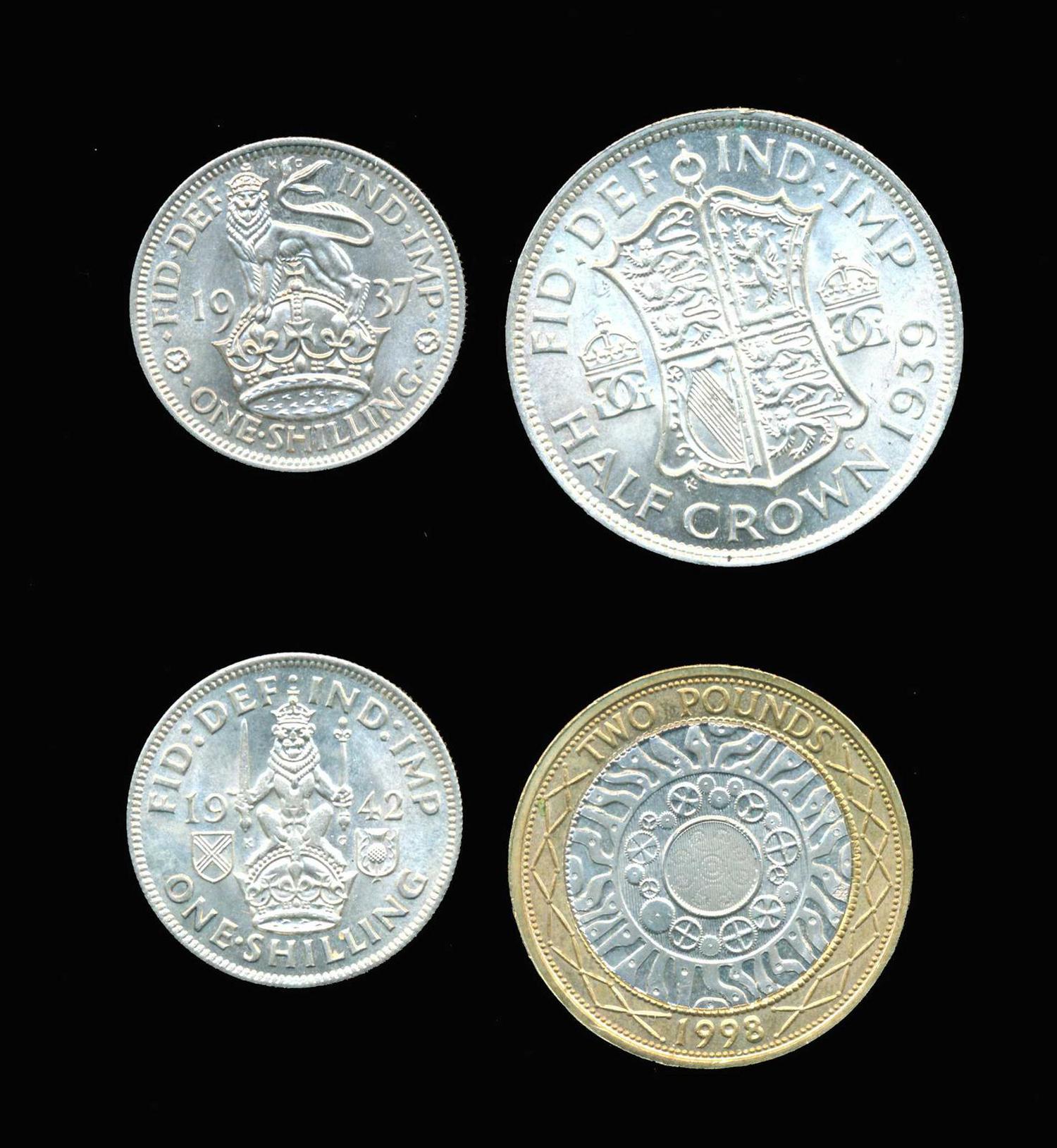 .925 AG 2 x KM# 854 Shilling 1937 MS-65 & 1942 MS-65, 1 x KM# 856 Half Crown MS-64 and 1 x KM# 994 1998 2 Pounds Technology Commemorative Unc