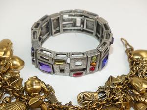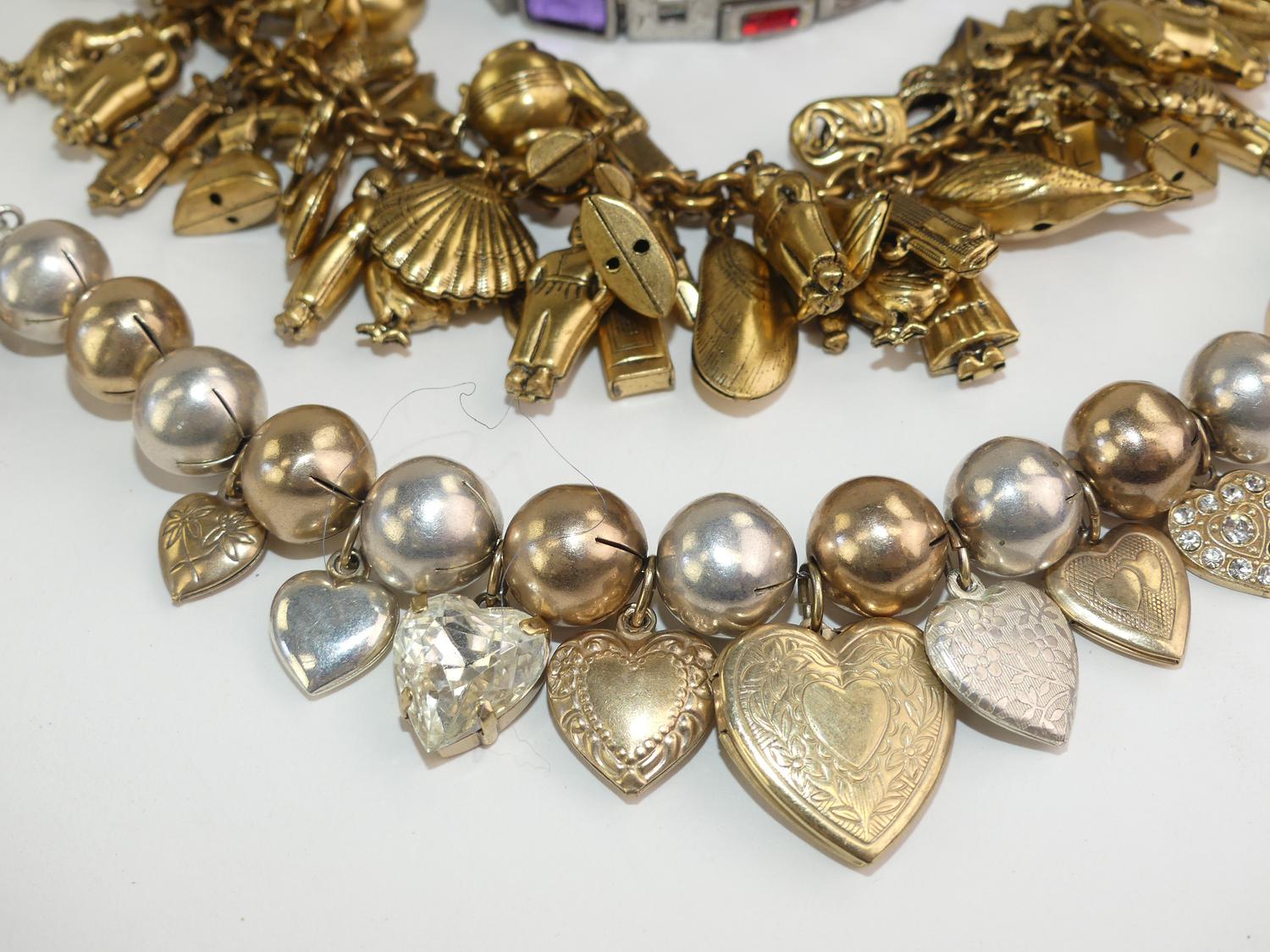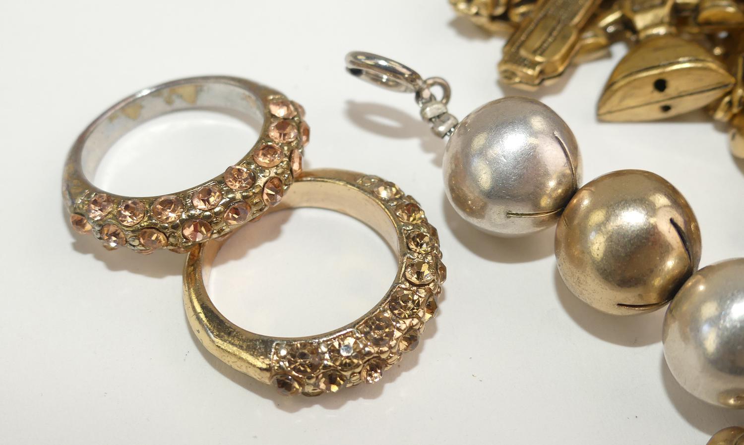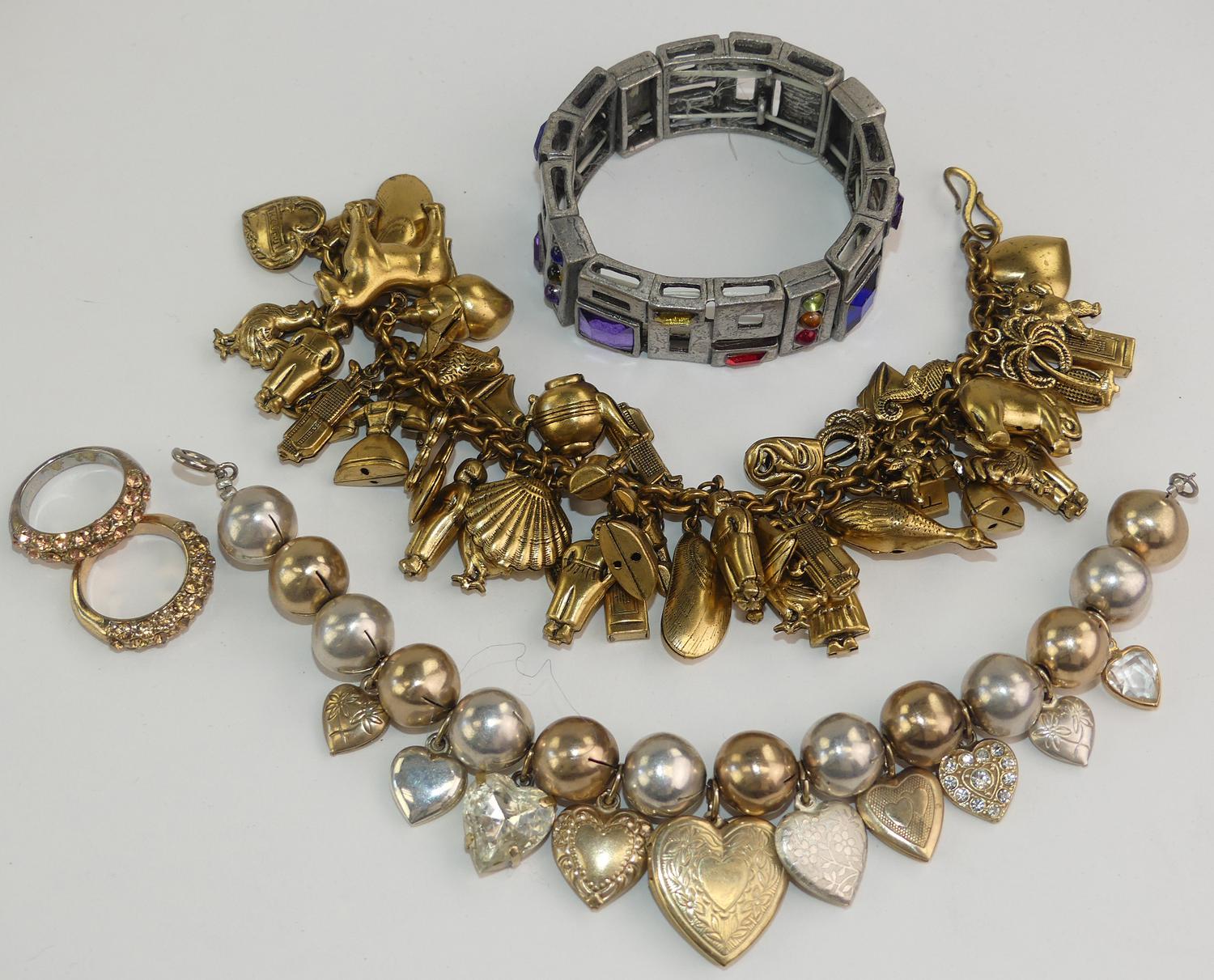 2 costume charm bracelets, 2 rhinestone rings, 1980s