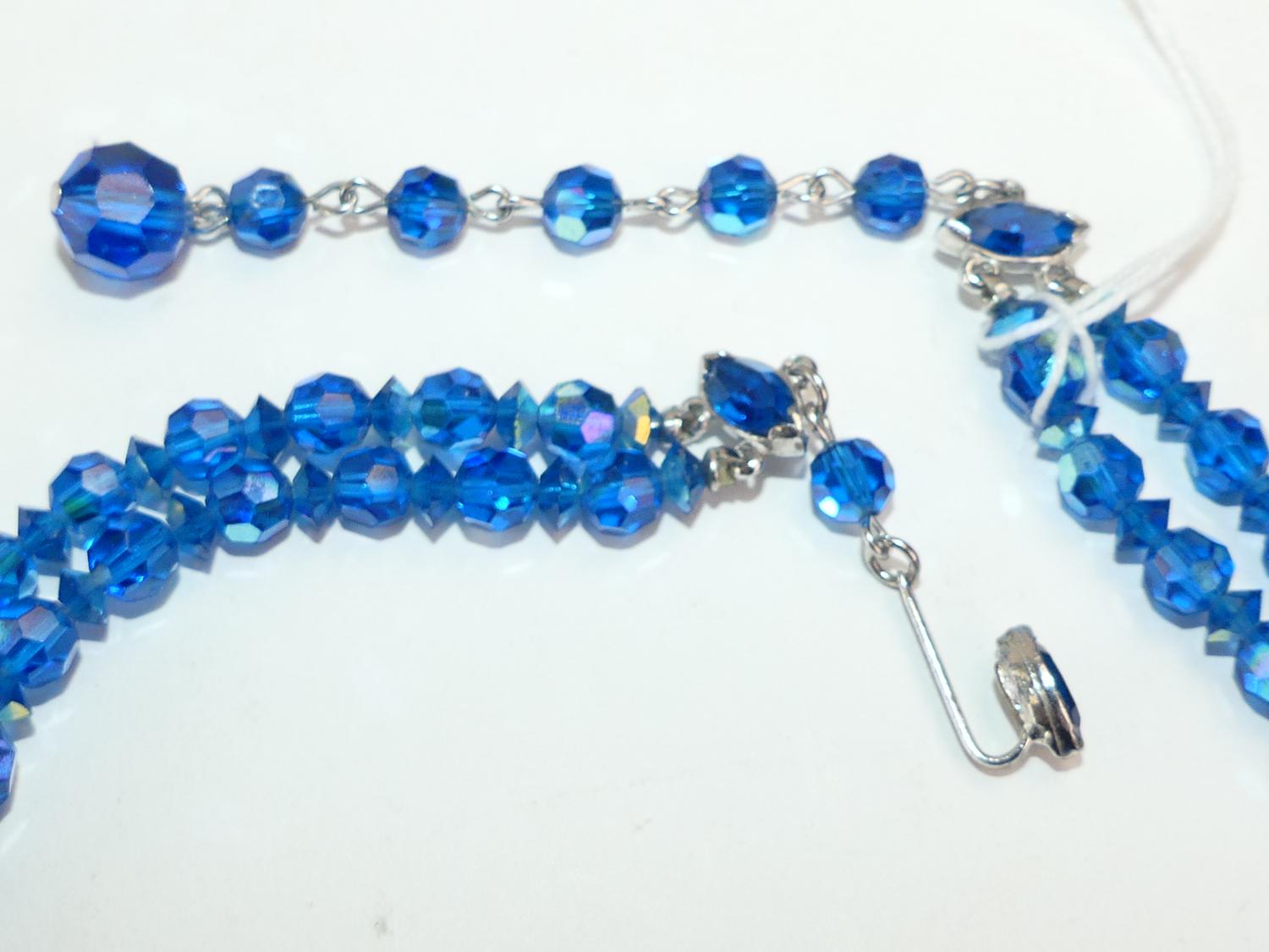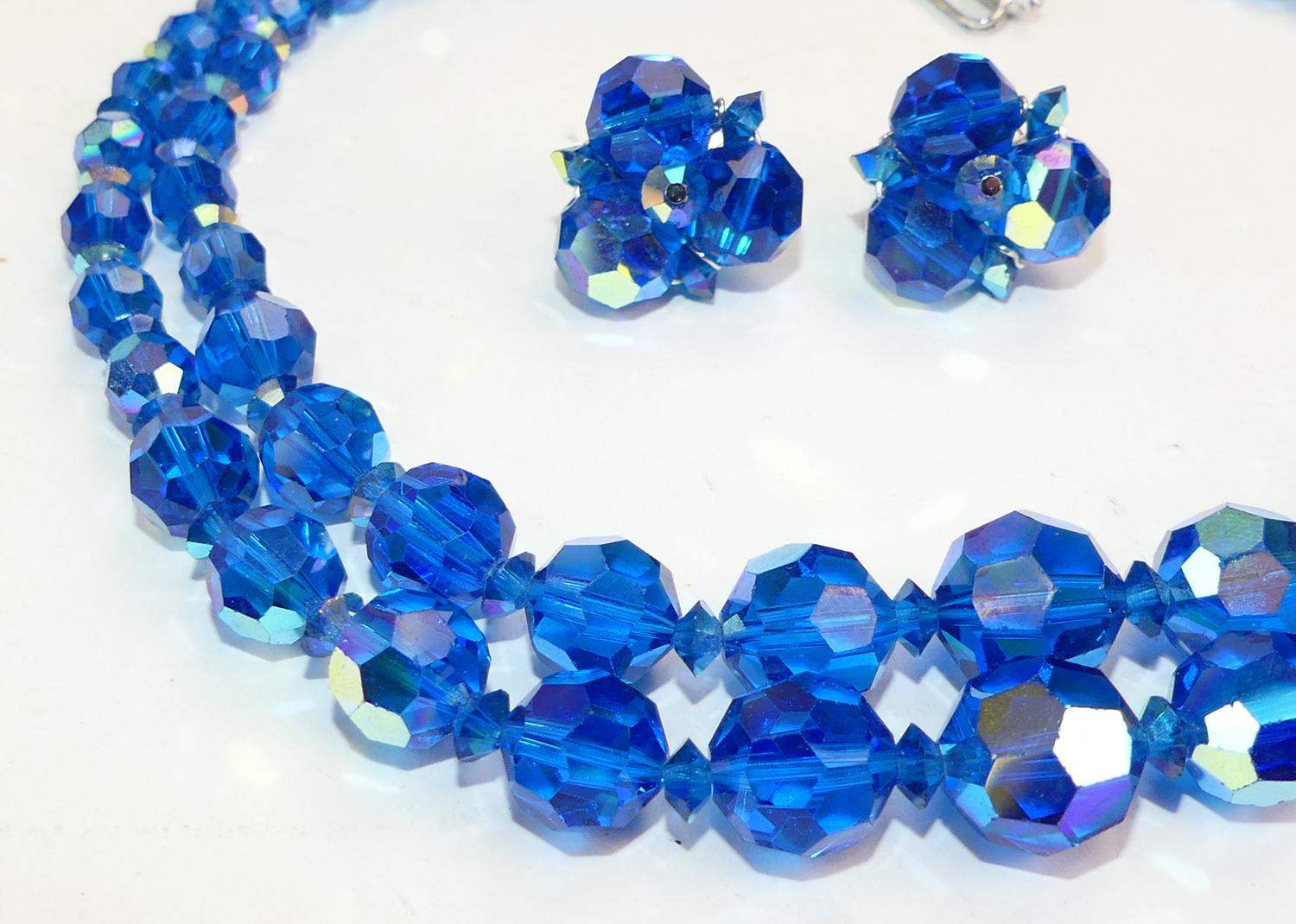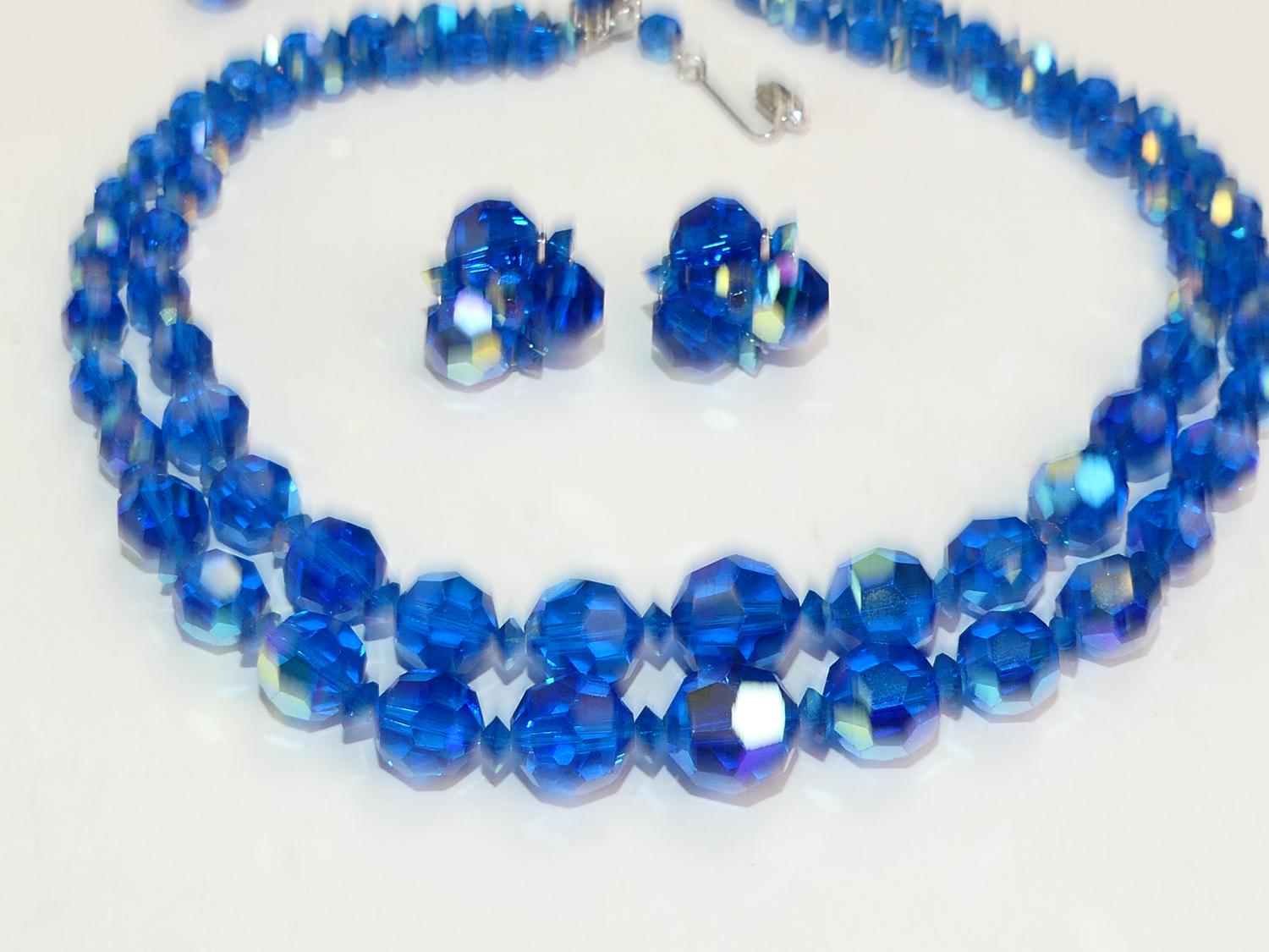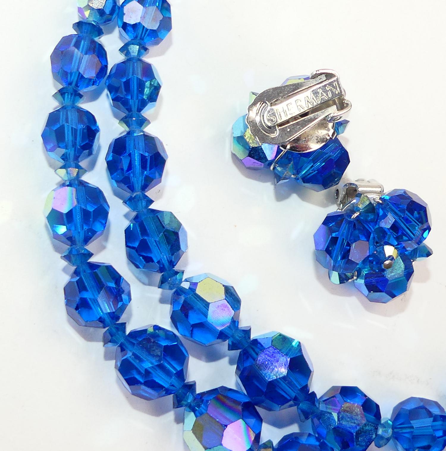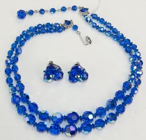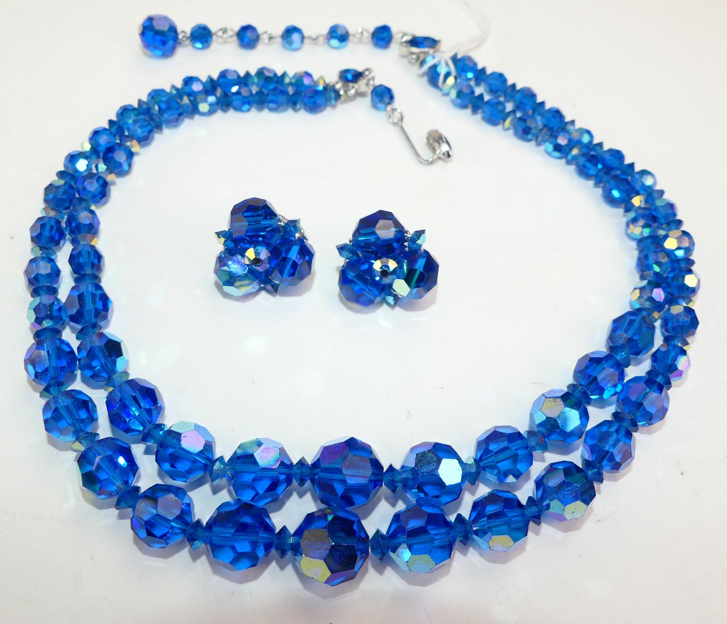 vintage sherman blue facetted crystal two strand necklace and earrings, earrings signed 17 3/4"