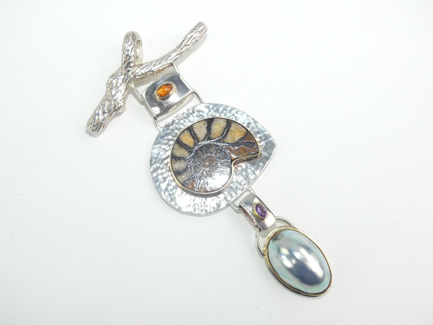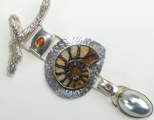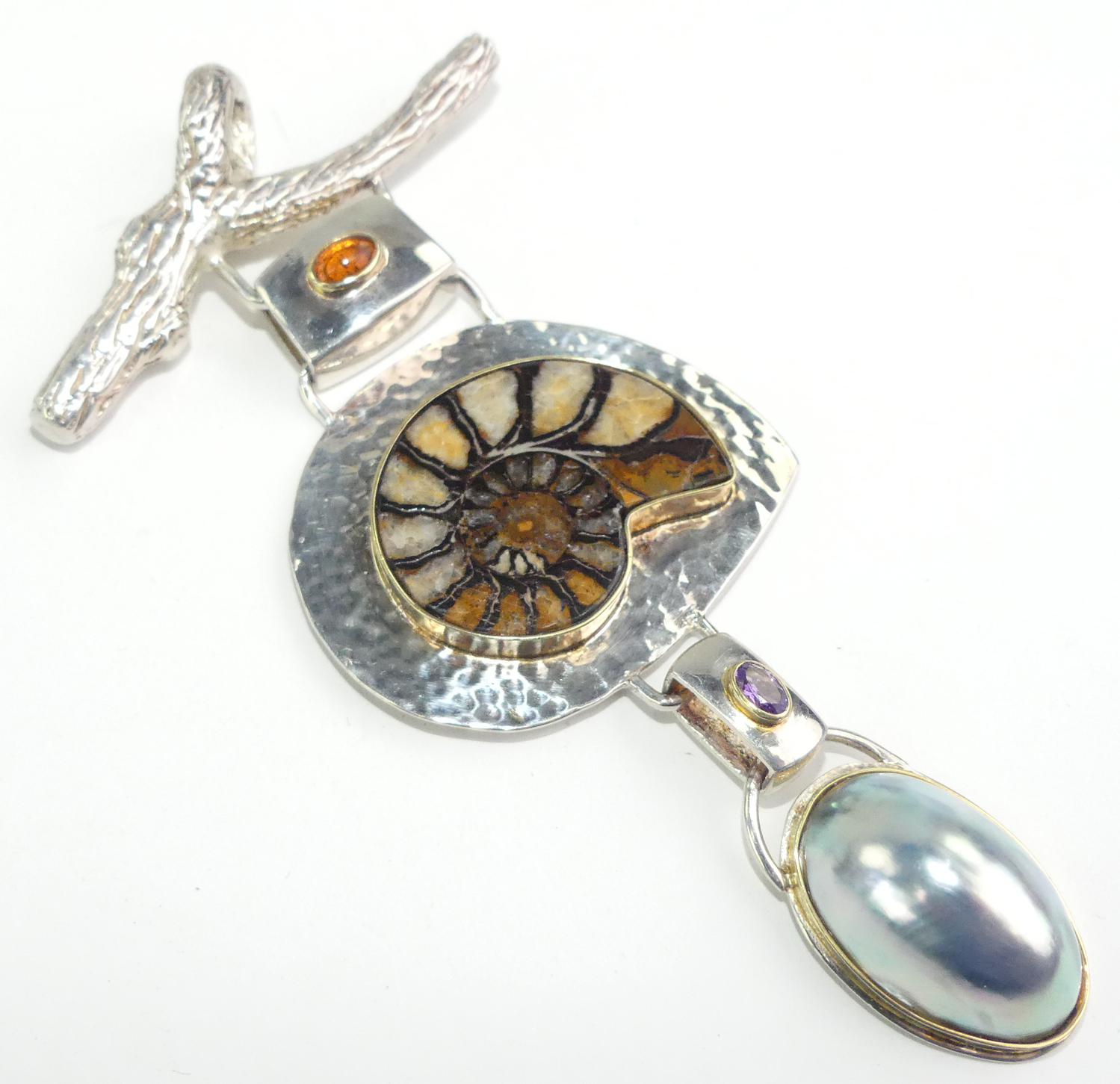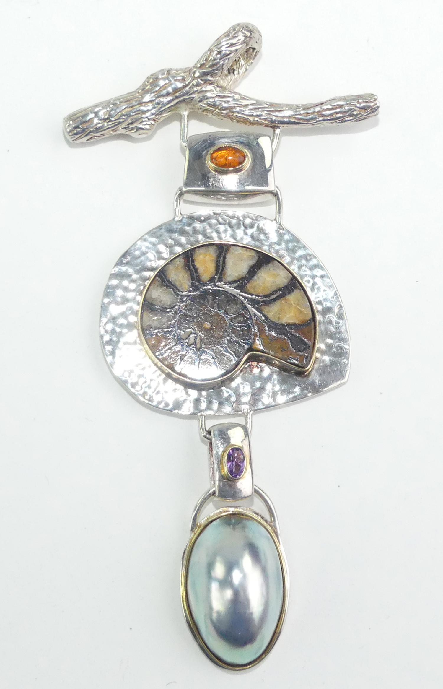 artist signed 30ma sterling silver ammolite, pearl pendant, 4 1/4" in height