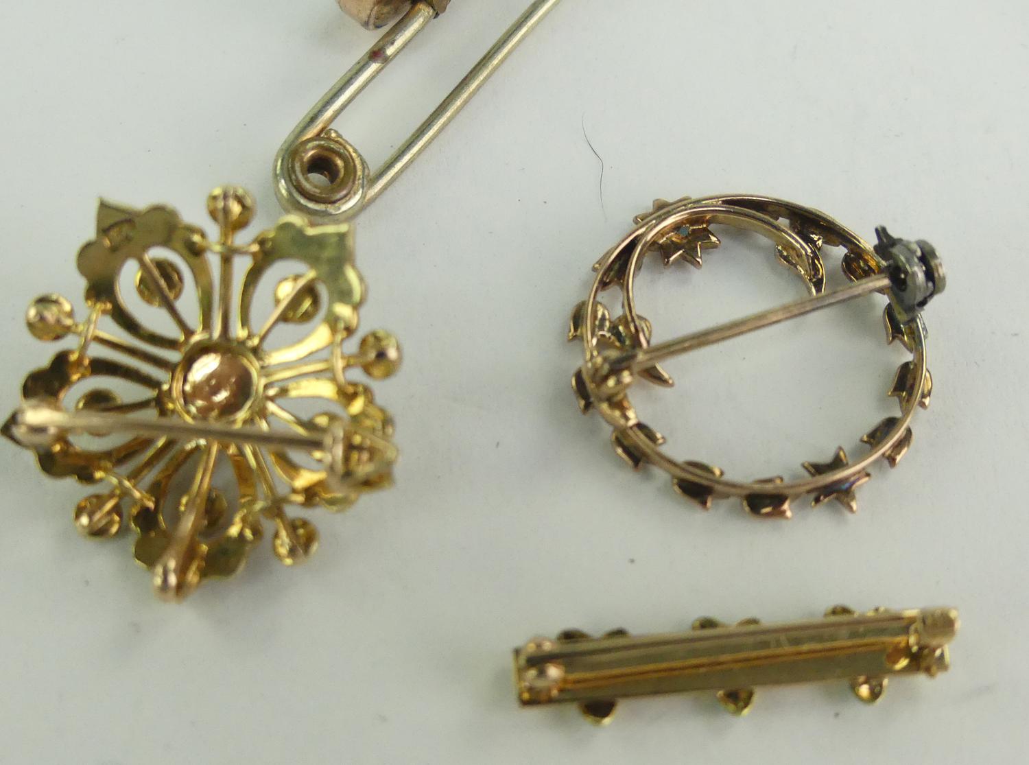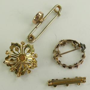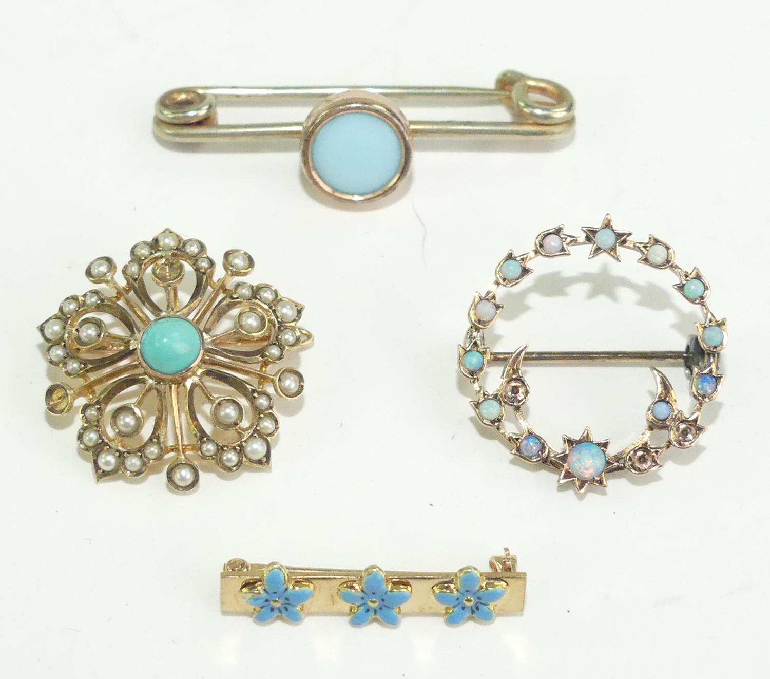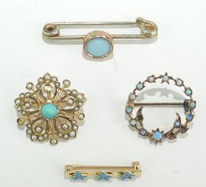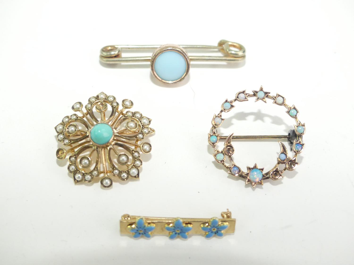 2 victorian 9ct opal seed pearl turquoise brooches with a gold filled pin and 14k enamel pin