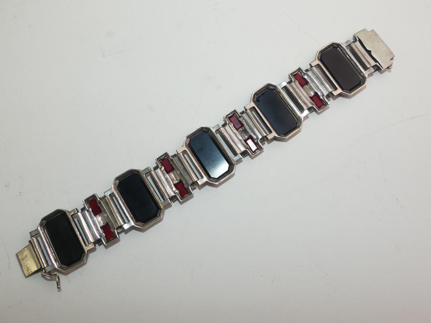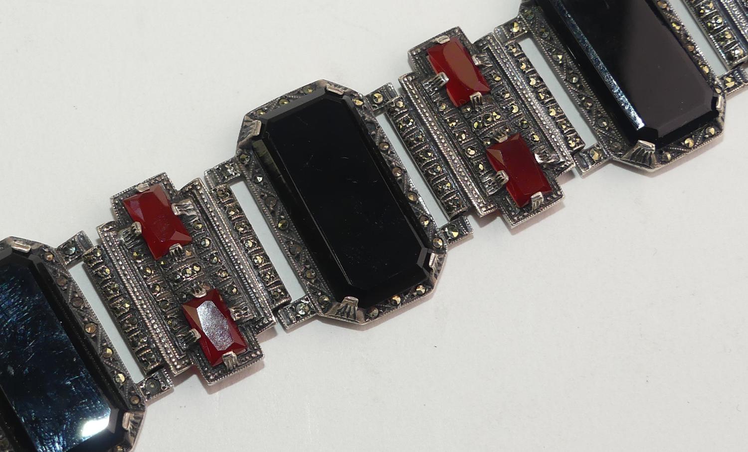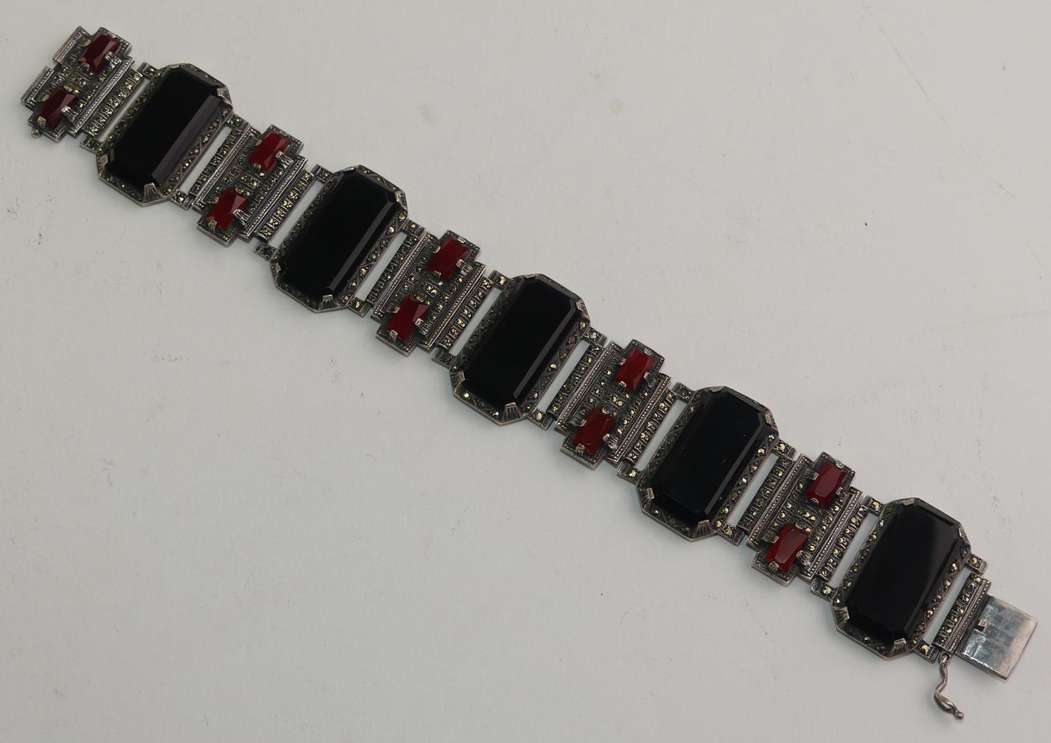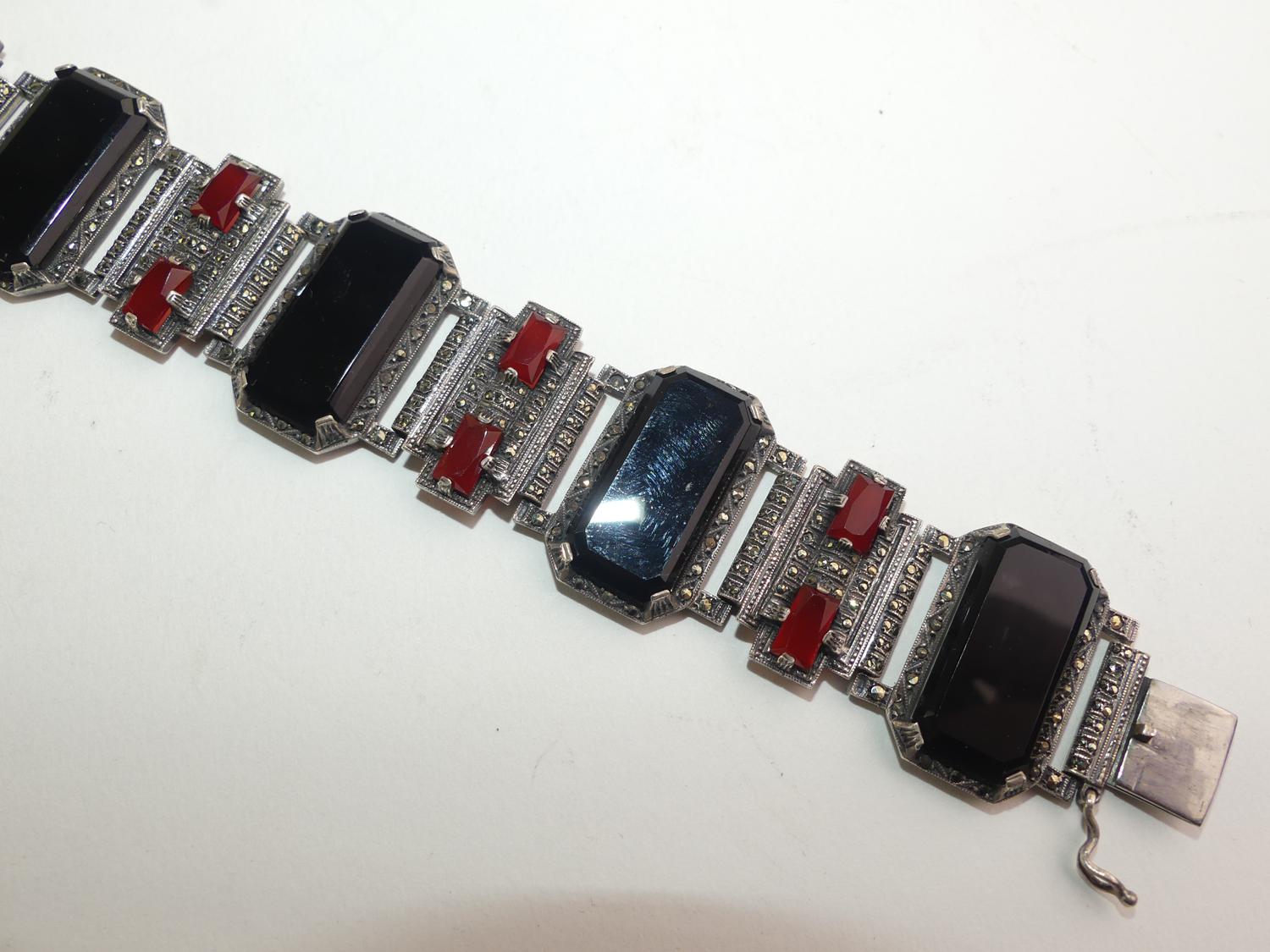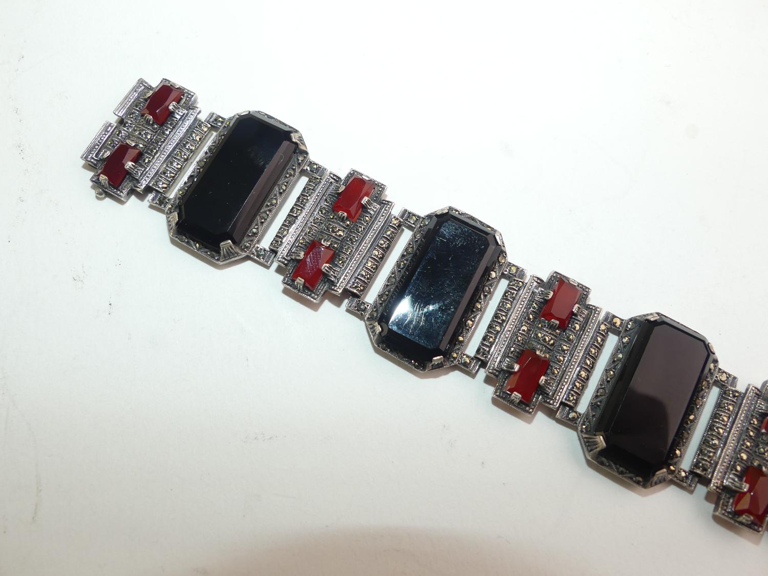 art deco onyx, carnelian, marcasite bracelet, length 7"