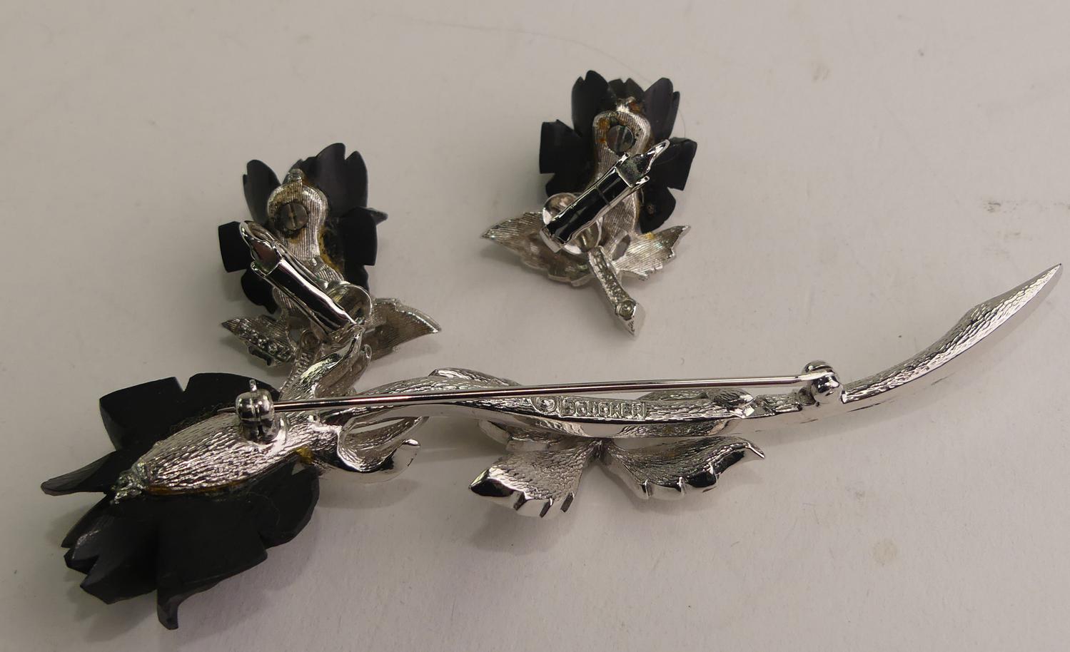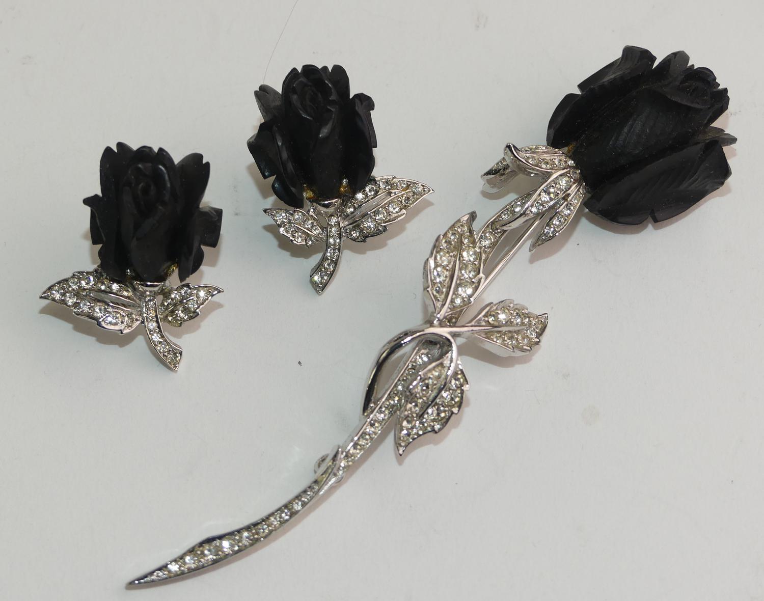 vintage signed boucher black rose rhinestone demi parure