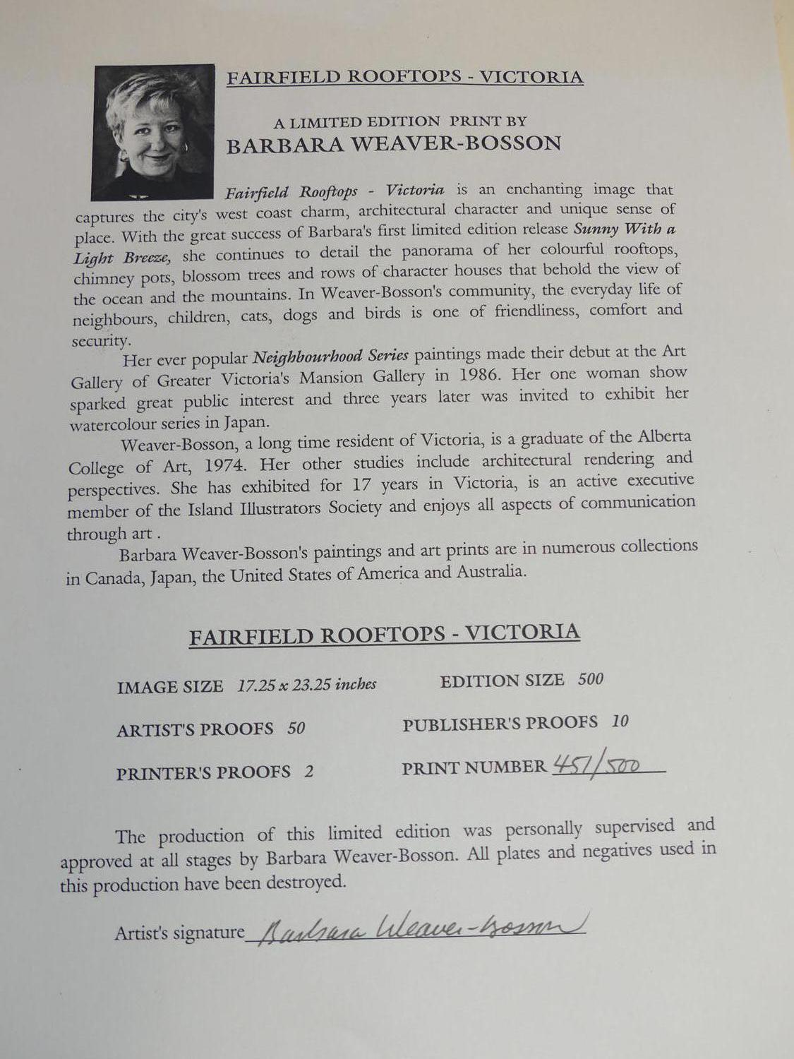 barbara weaver-bosson, limited edition print #451/500, 18" x 24", "fairfield rooftops, victoria"