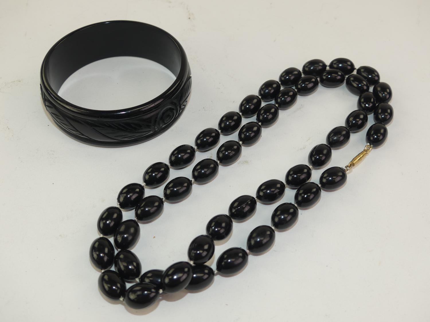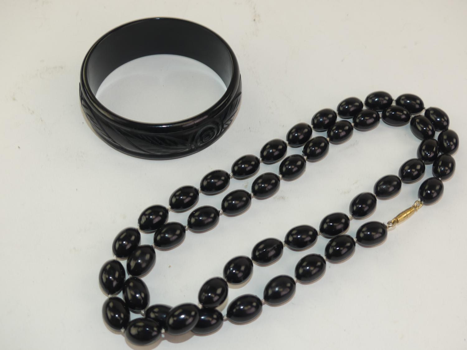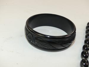 art deco carved bakelite bangle, with plastic necklace, 2 1/2" diameter, 28"