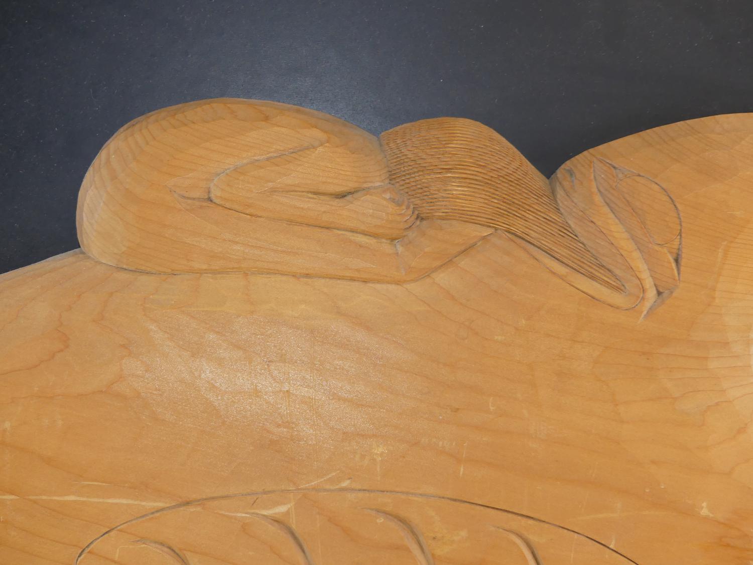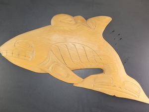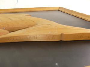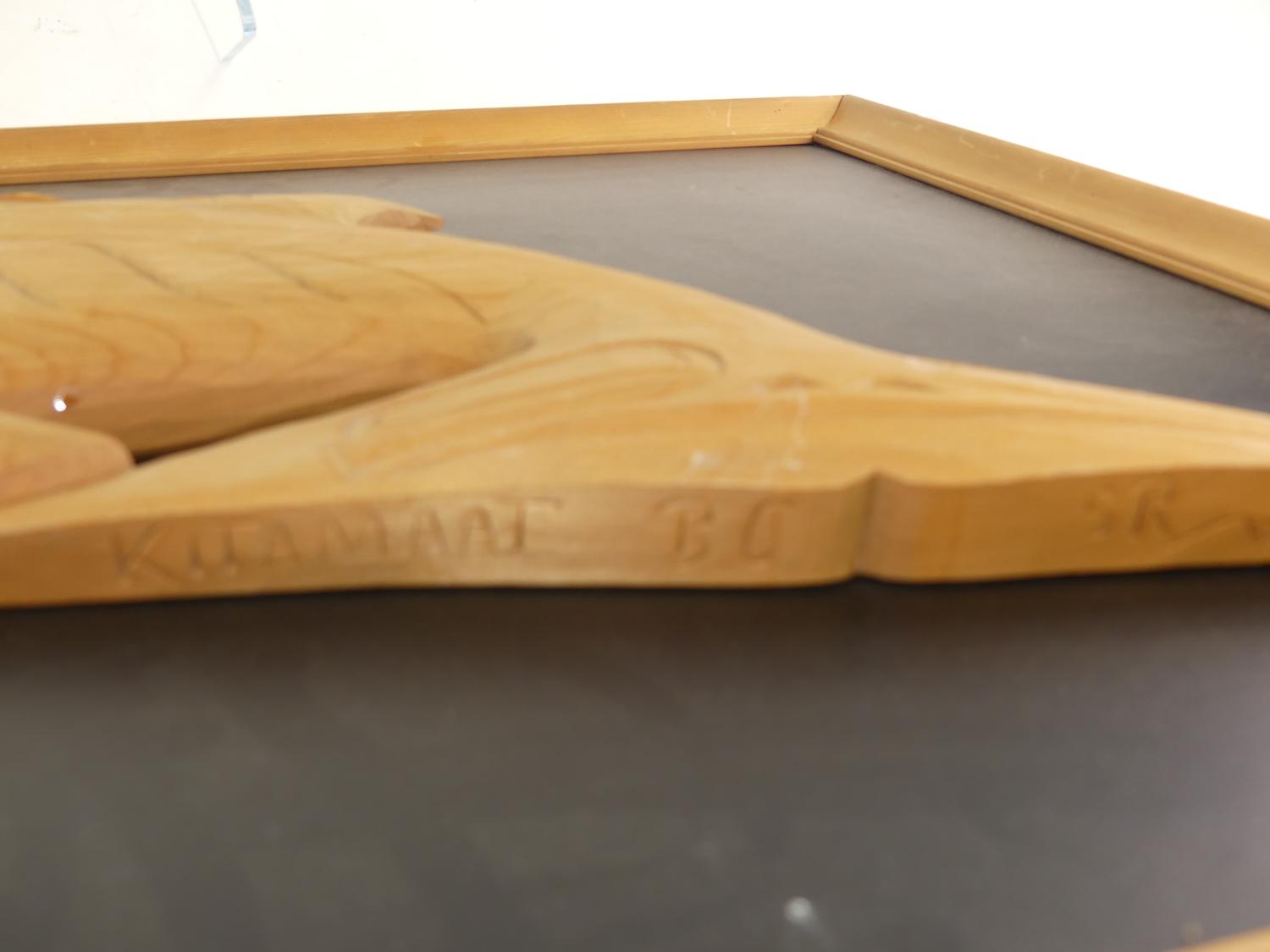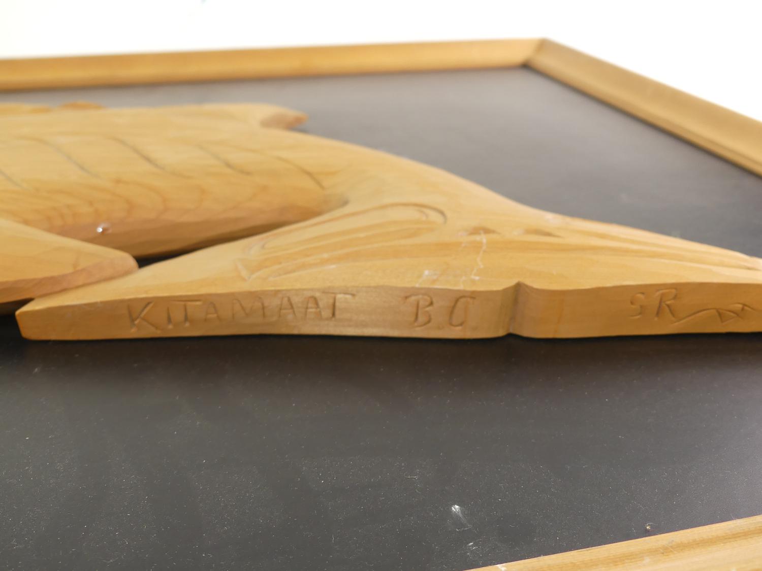 framed carved yellow cedar killer whale signed s.r., kitimat bc