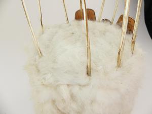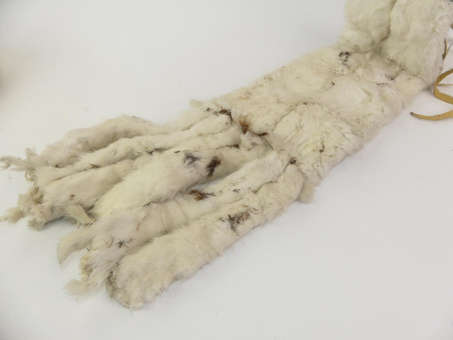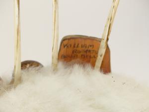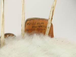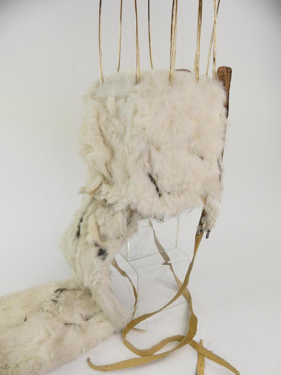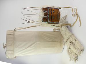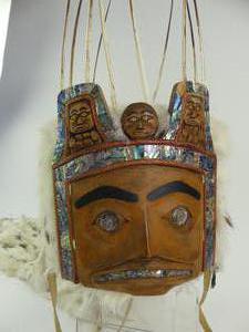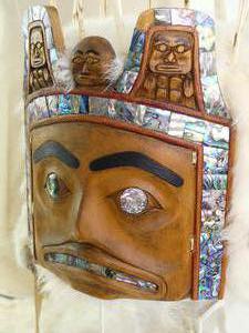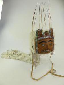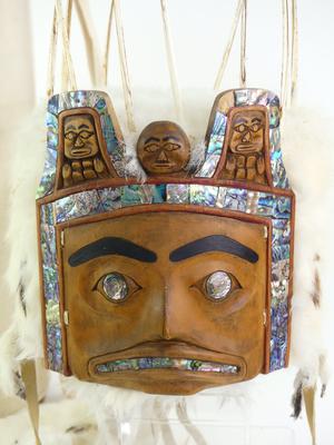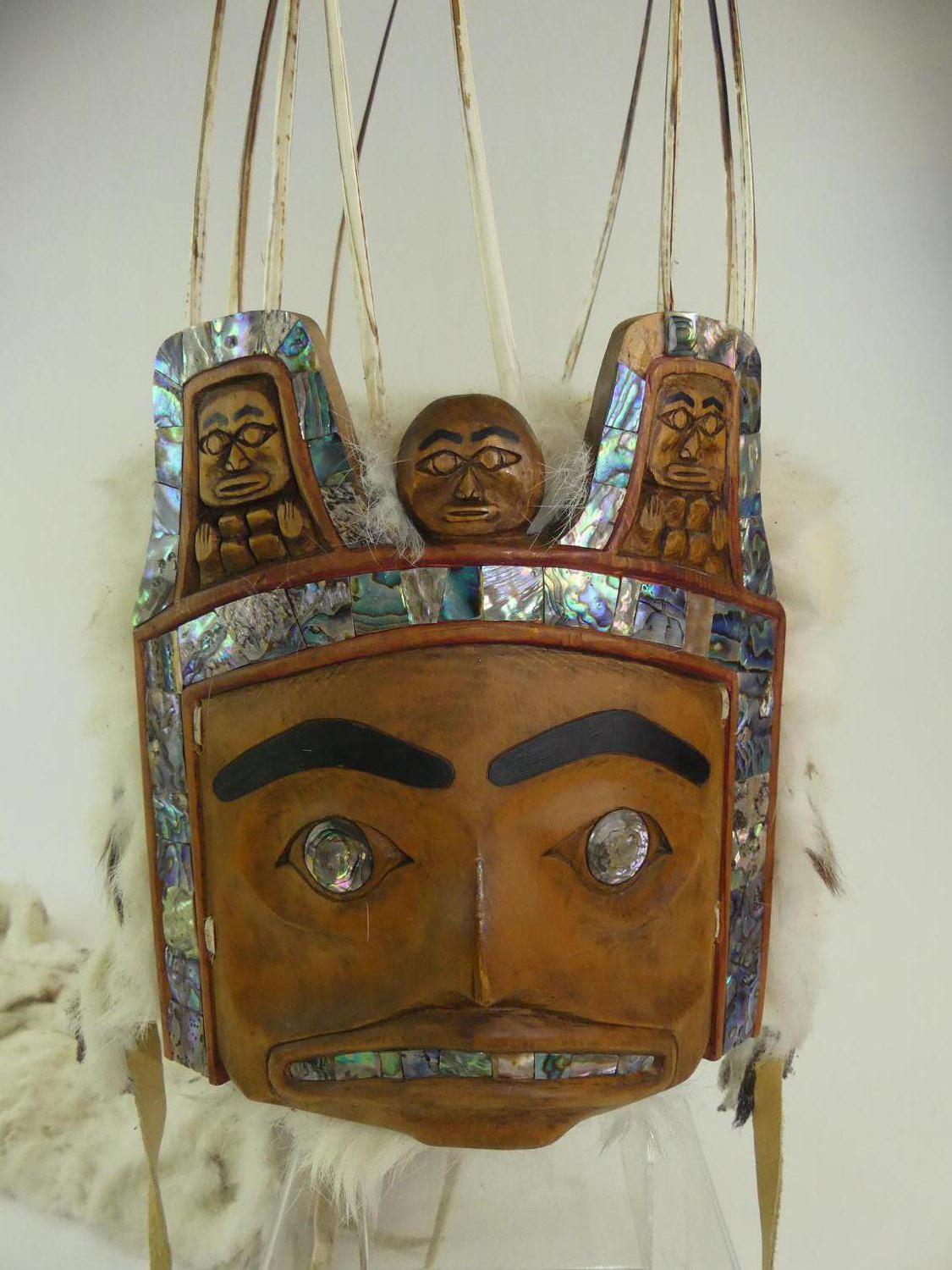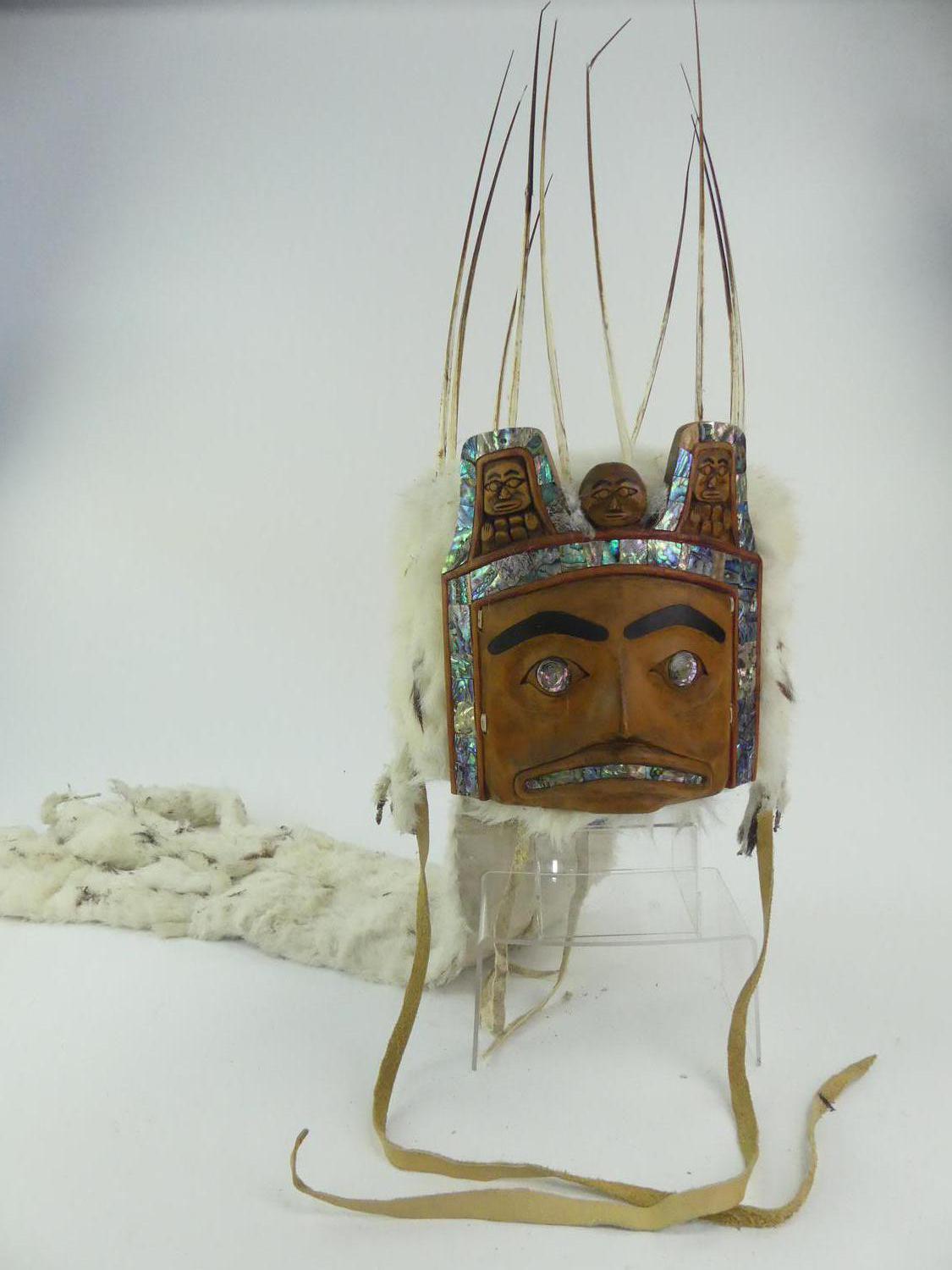Abalone inlaid carved and painted mask mounted on ermine fur with sea mammal whiskers, with storage/traveling case