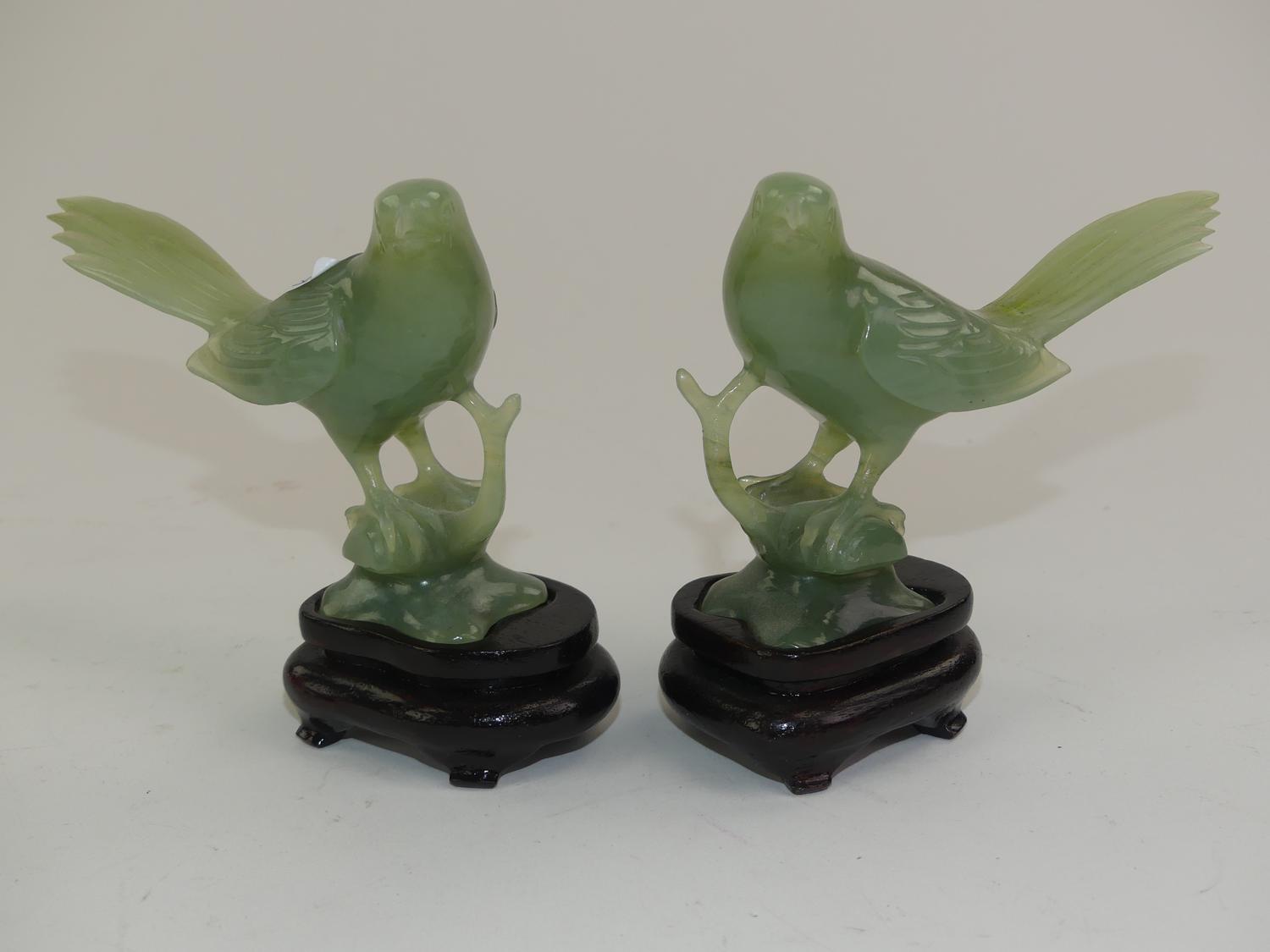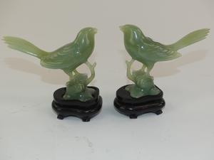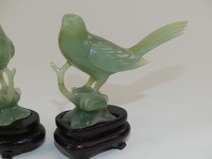 chinese pair of carved jade birds on stands, chips