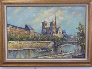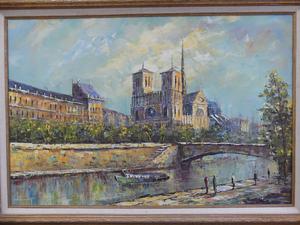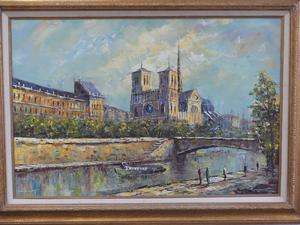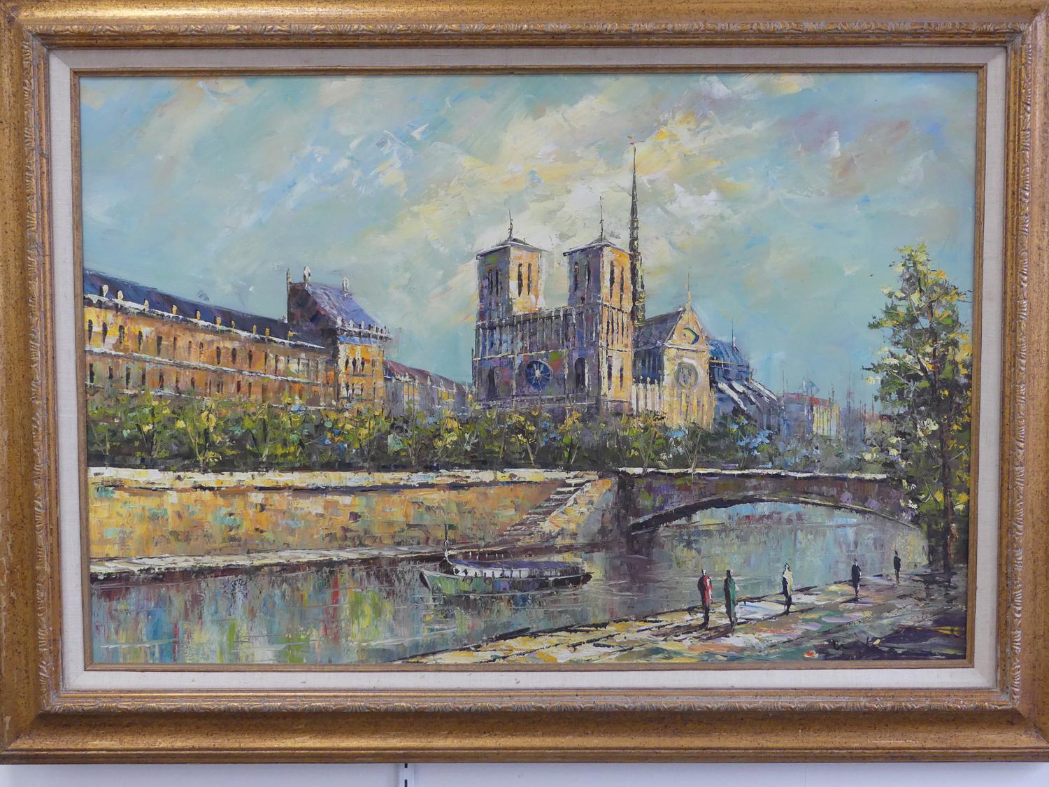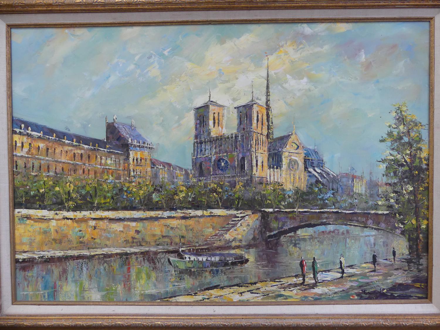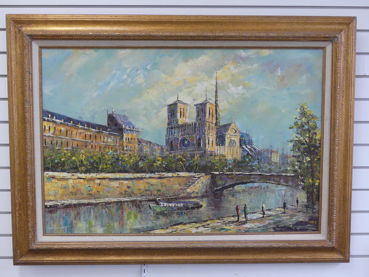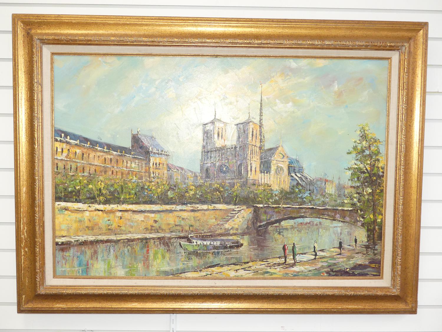 indistinictly signed oil on canvas, 24" x 36", "paris street scene"