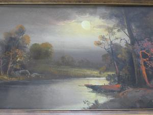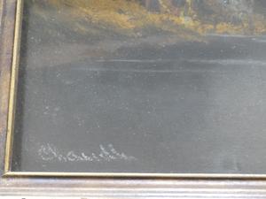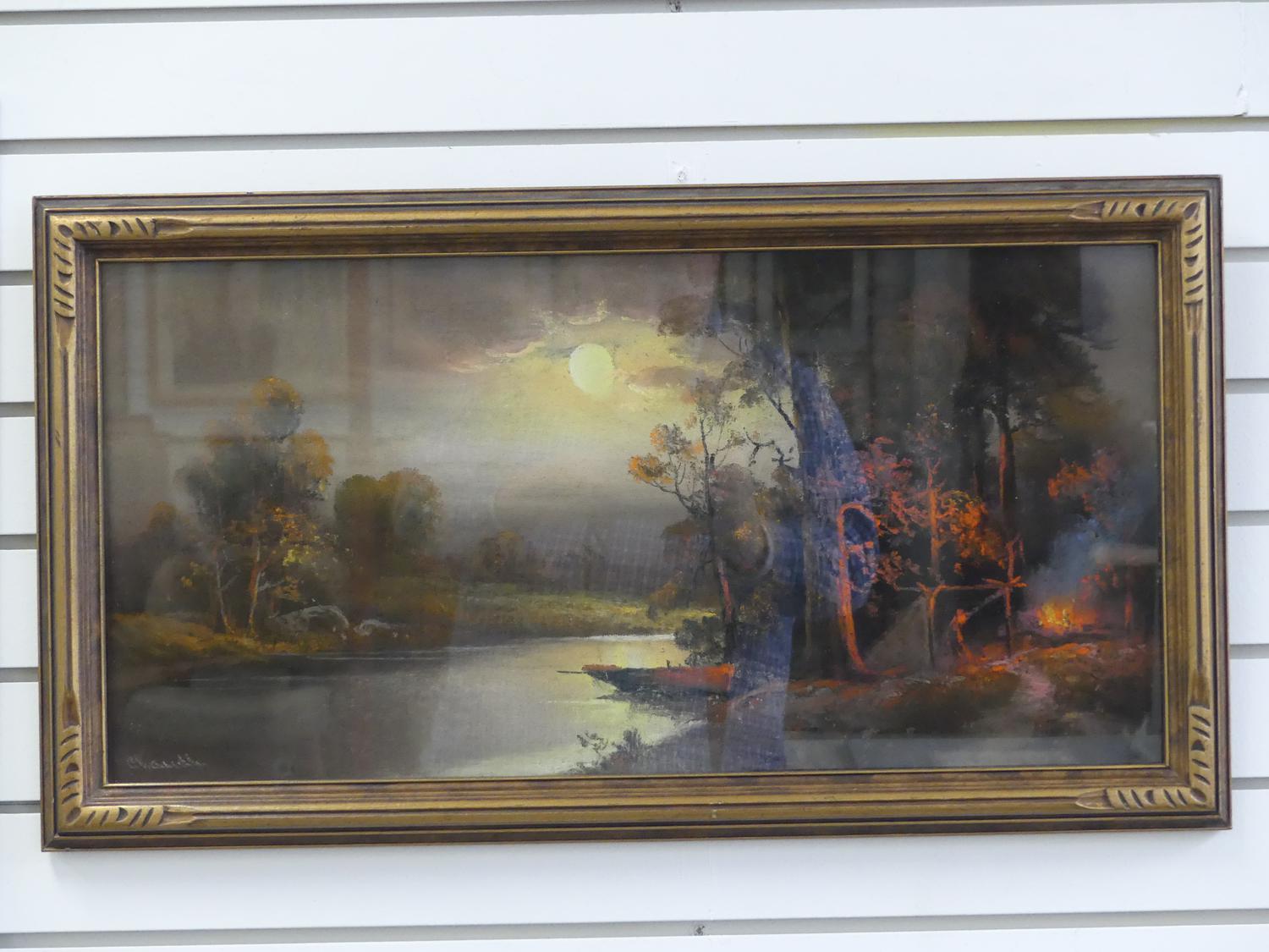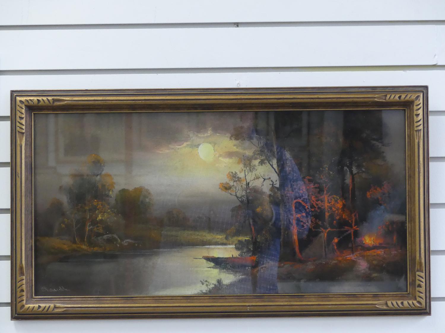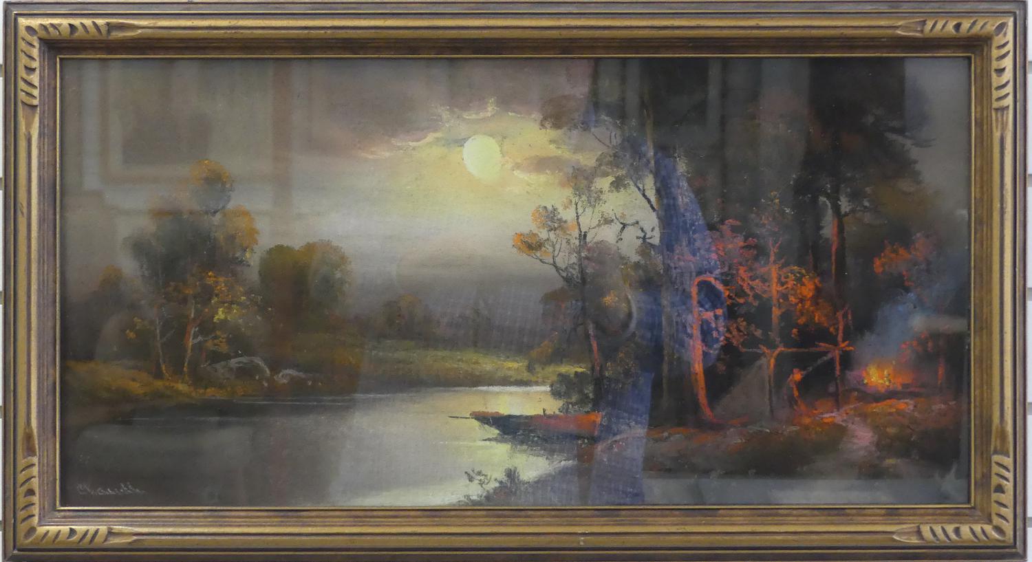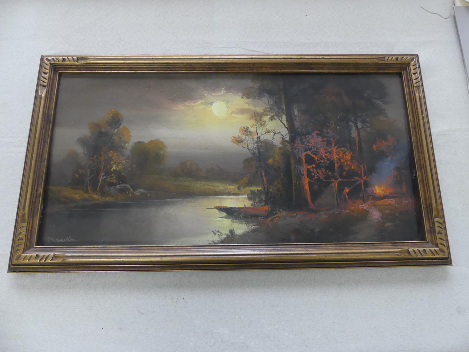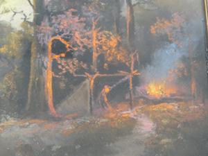 william henry chandler (1854-1928)50100, pastel, 12" x 24", "landscape with setting sun and camp fire"