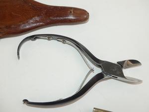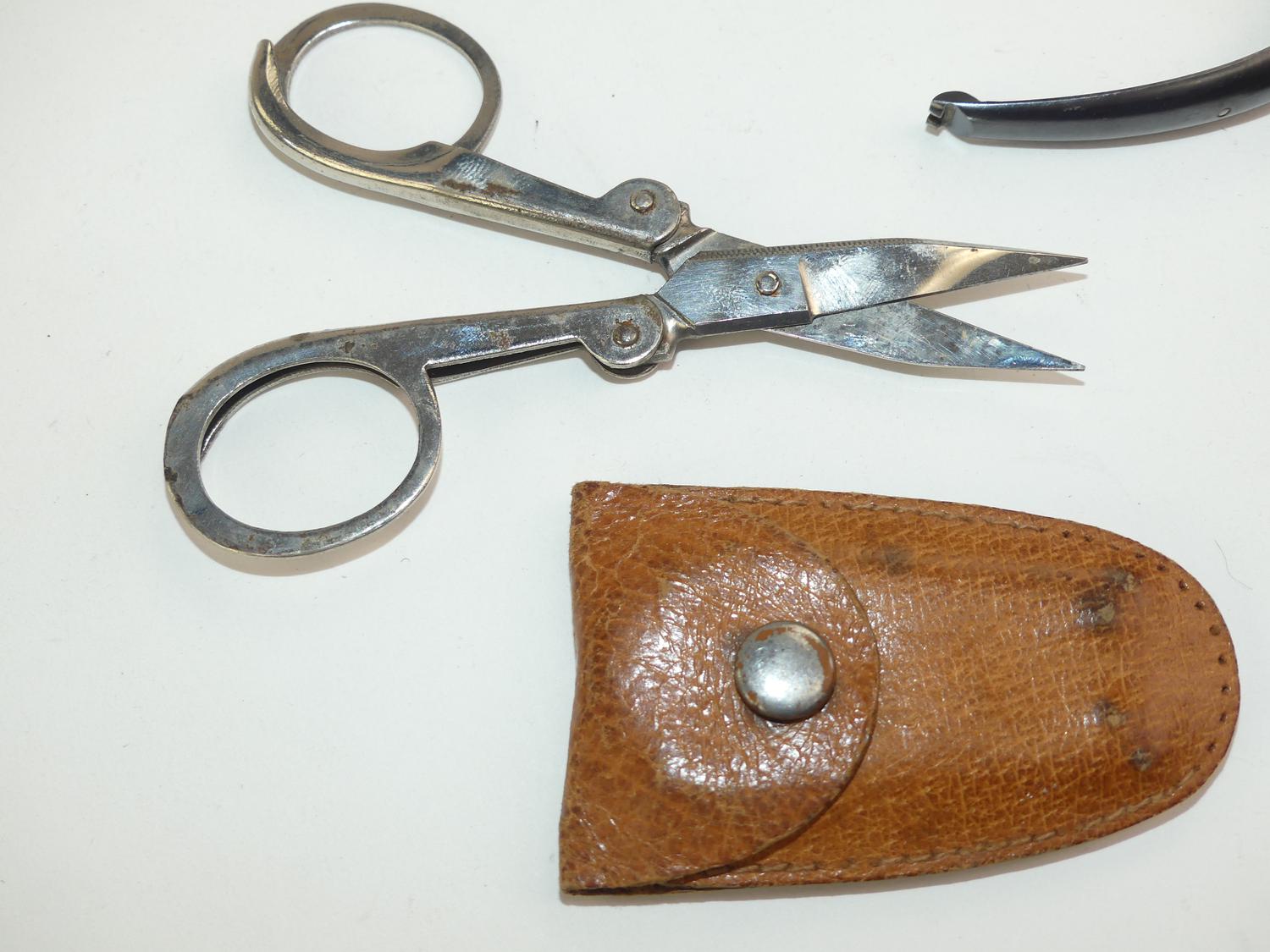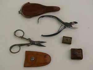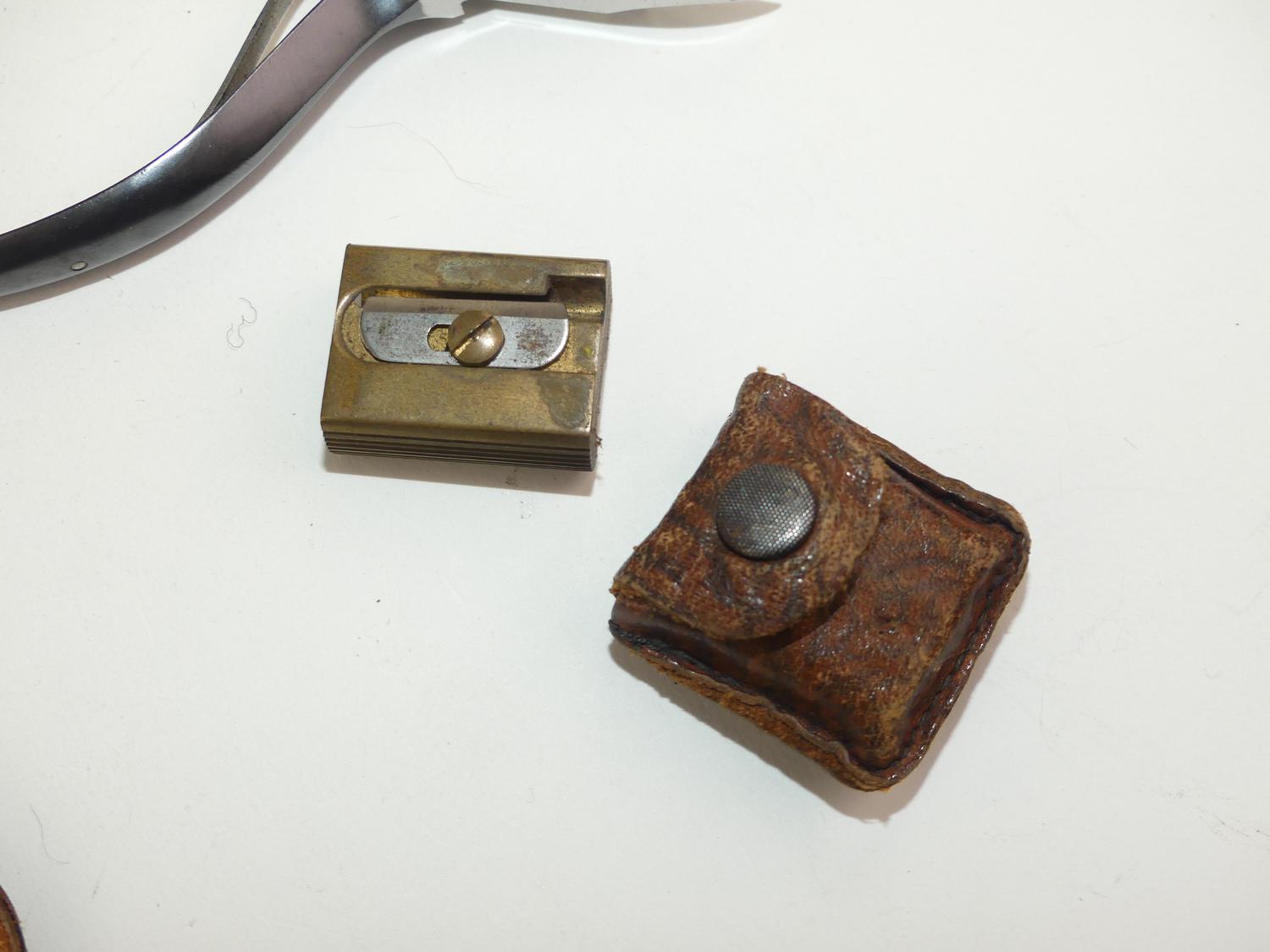 vintage scissors, magnifier and pencil sharpener in leather cases