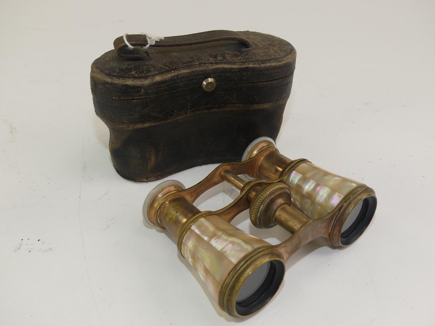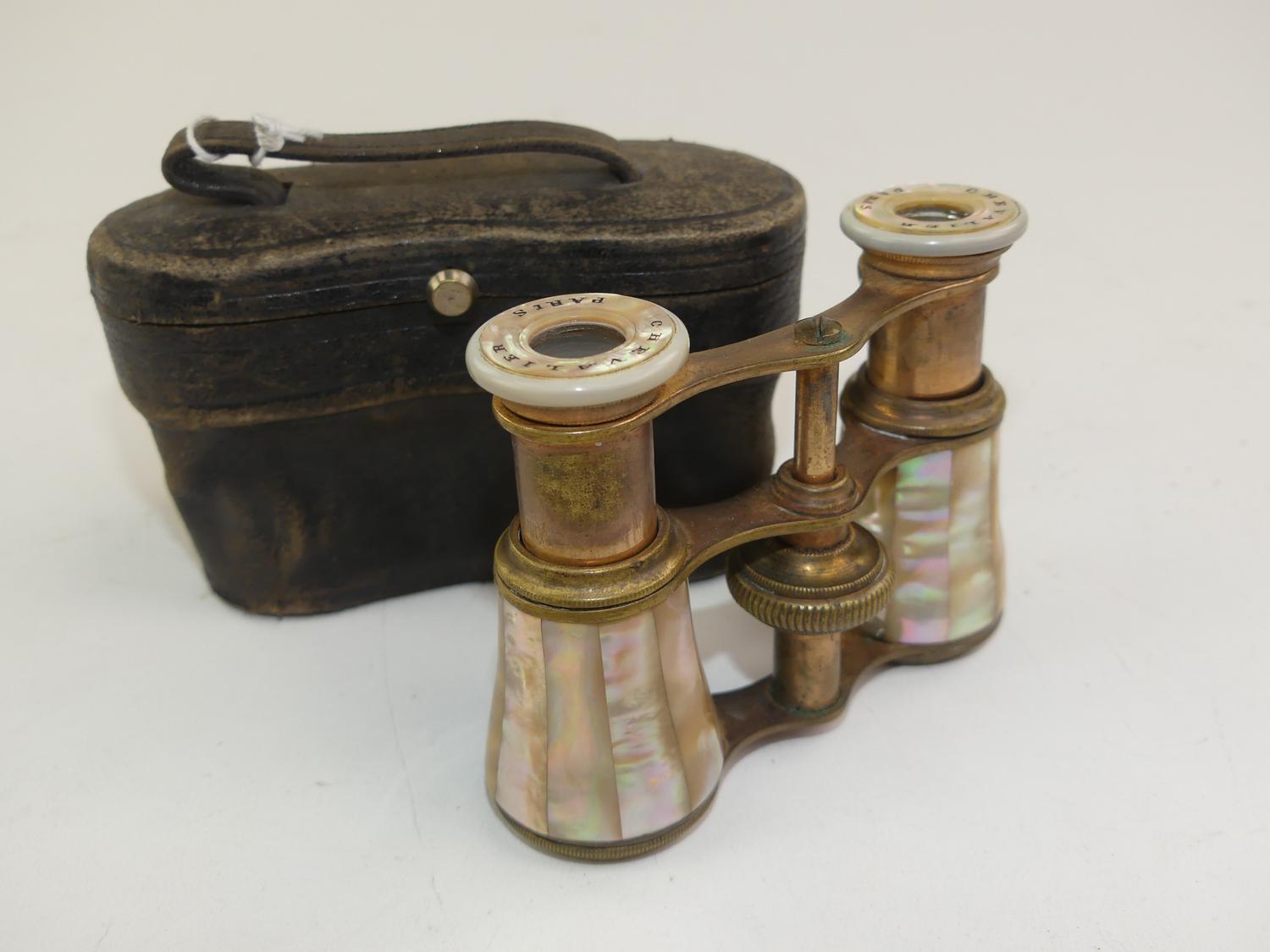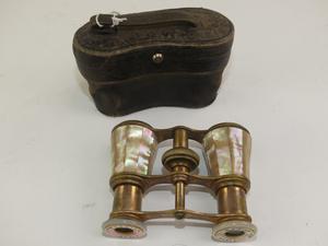 pair of leather cased mother-of-pearl opera glasses, chevalier paris, length 4"