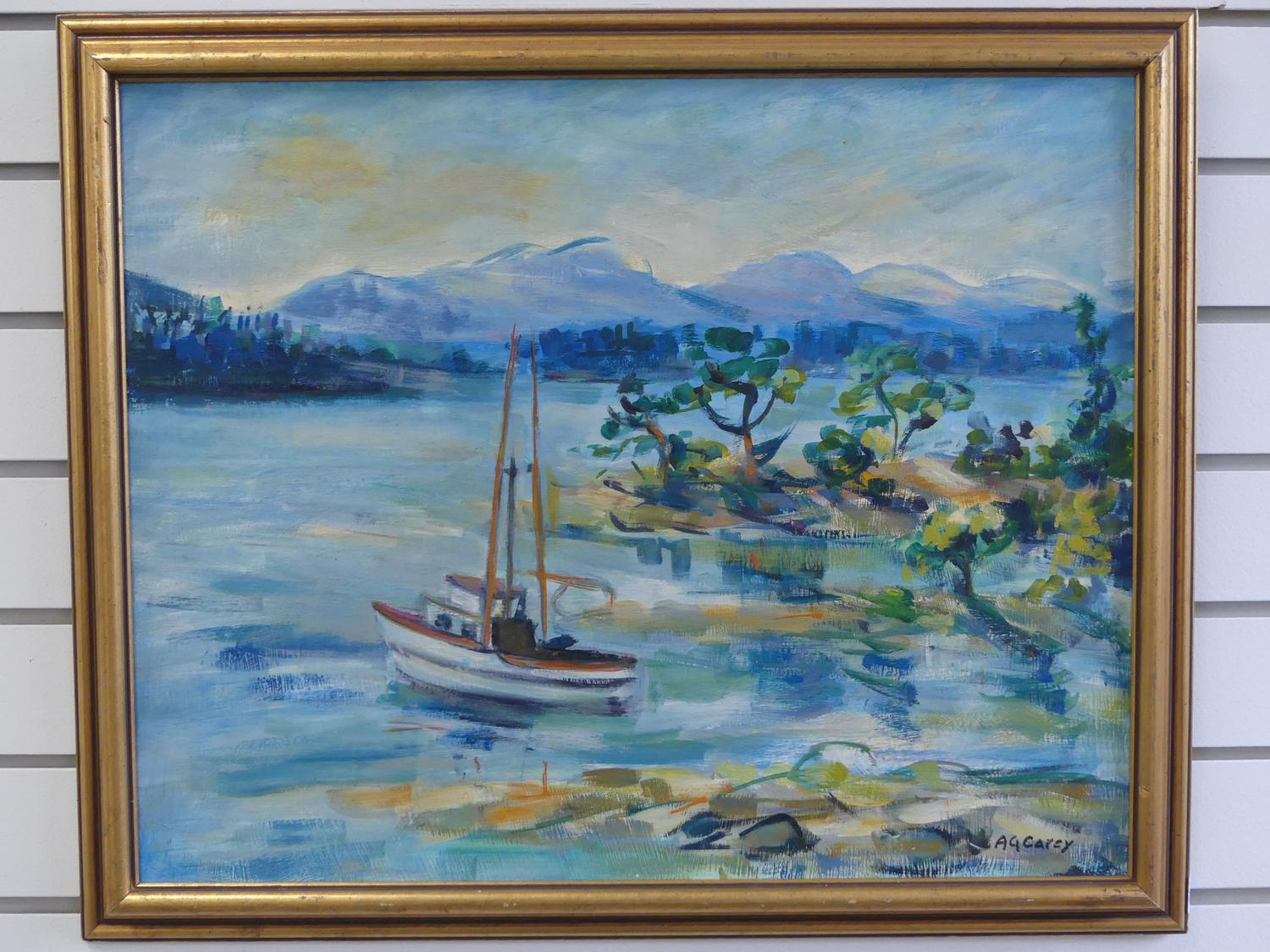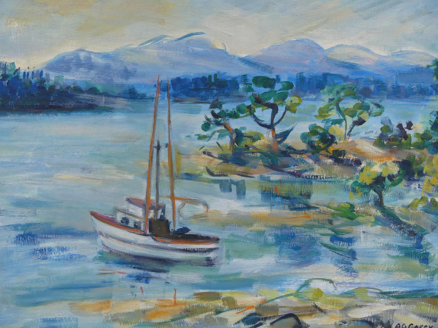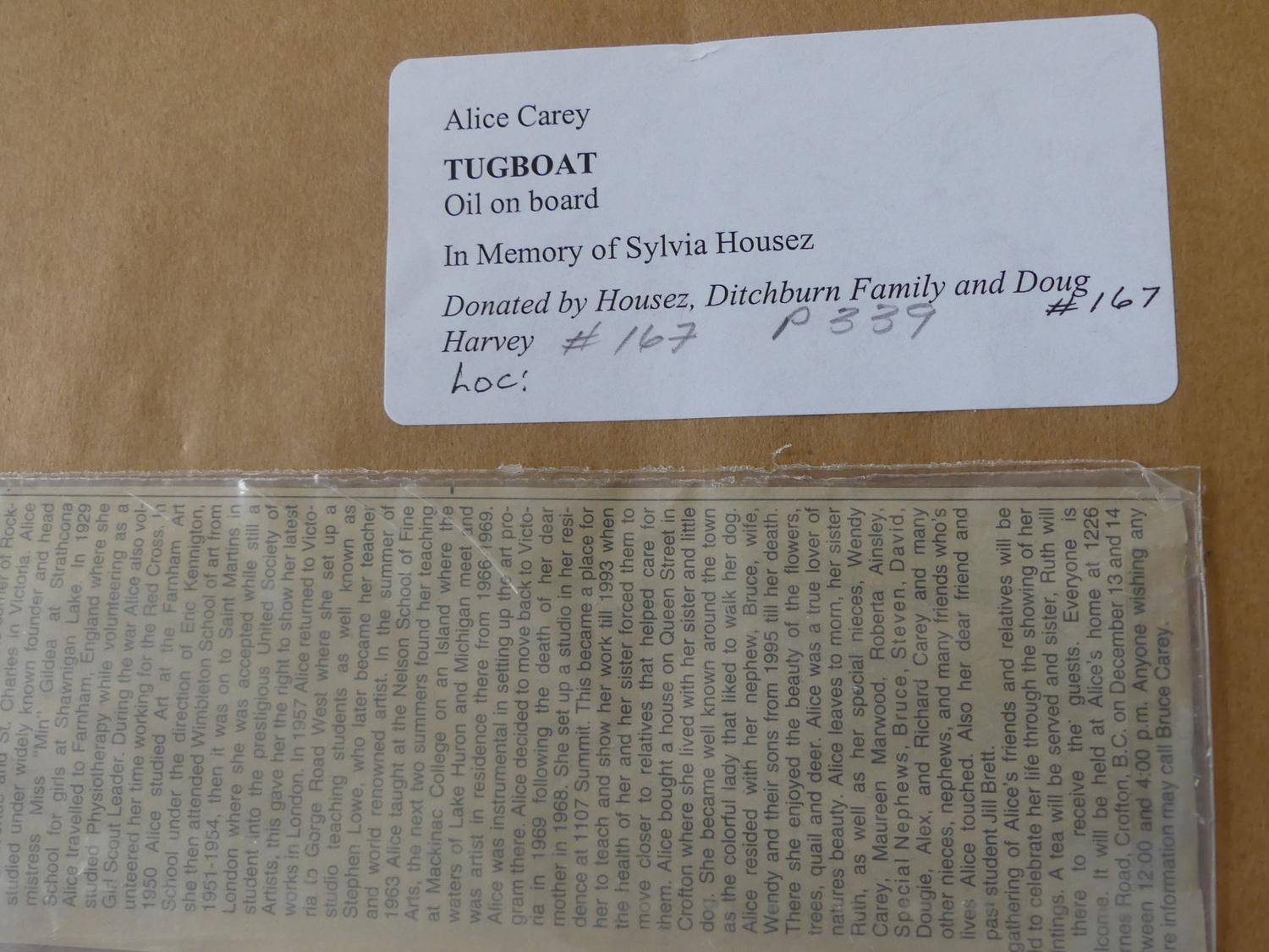 alice carey (1910-1997), oil on board, 16" x 20", "tugboat"