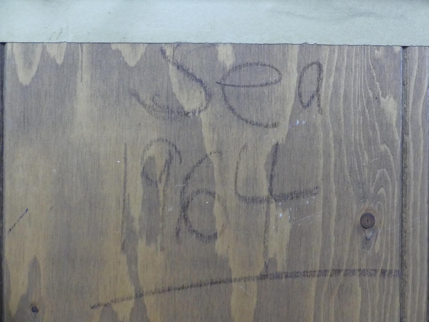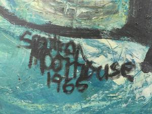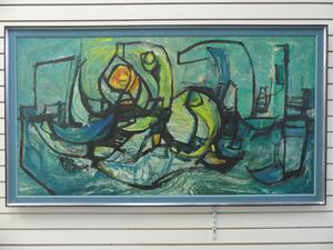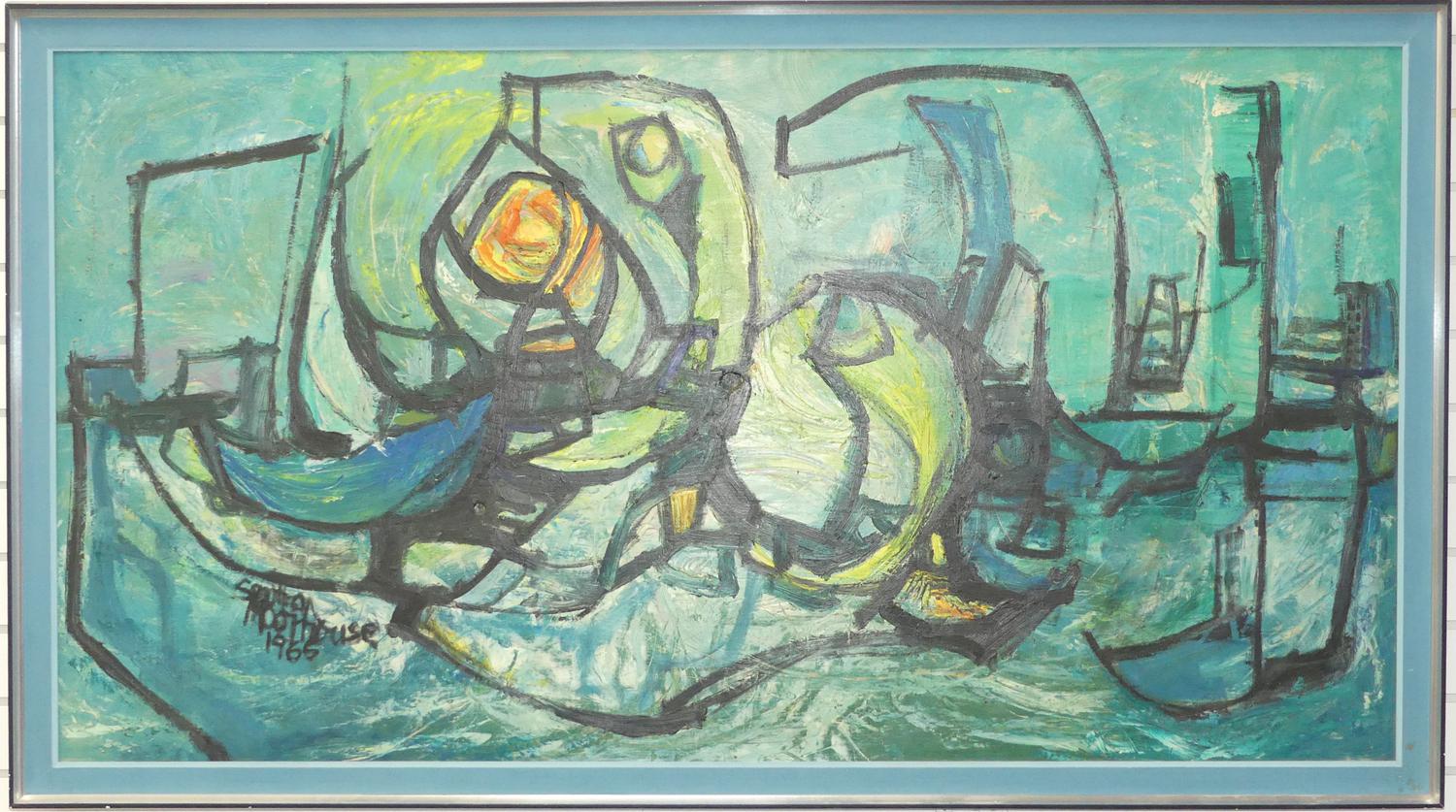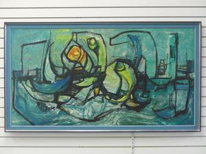 sandra moorhouse-good, oil on board, d.1965, 29" x 55", "abstract harbour scene"