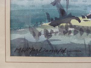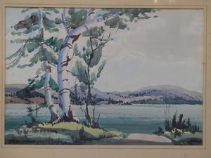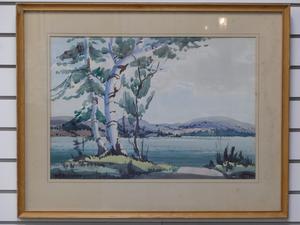 murray william macdonald (1898-1991), watercolour, 14" x 20", "landscape with birch trees and lake"
