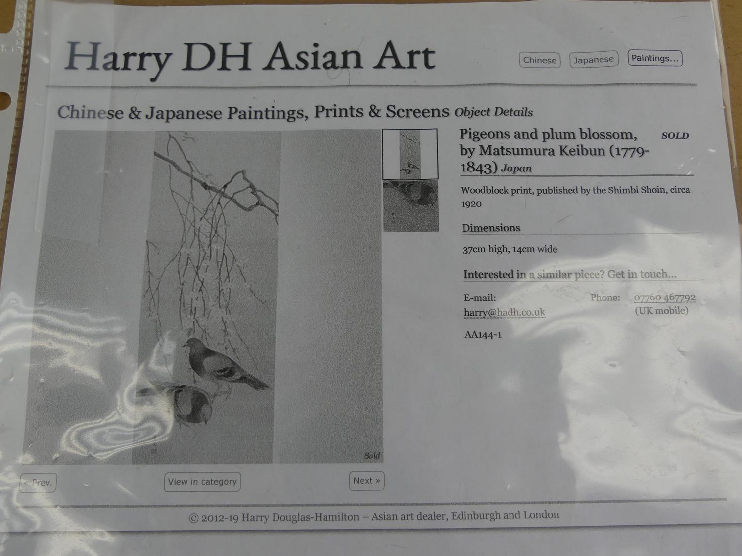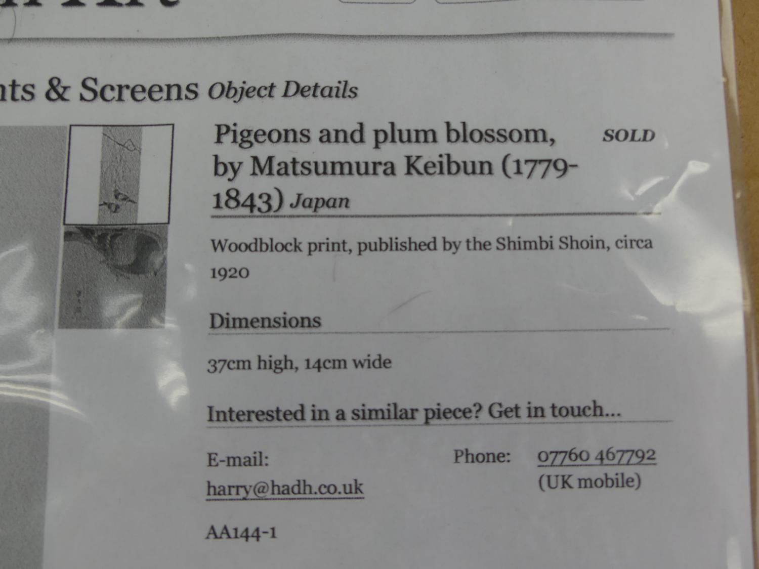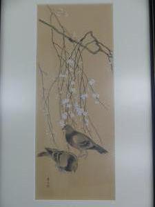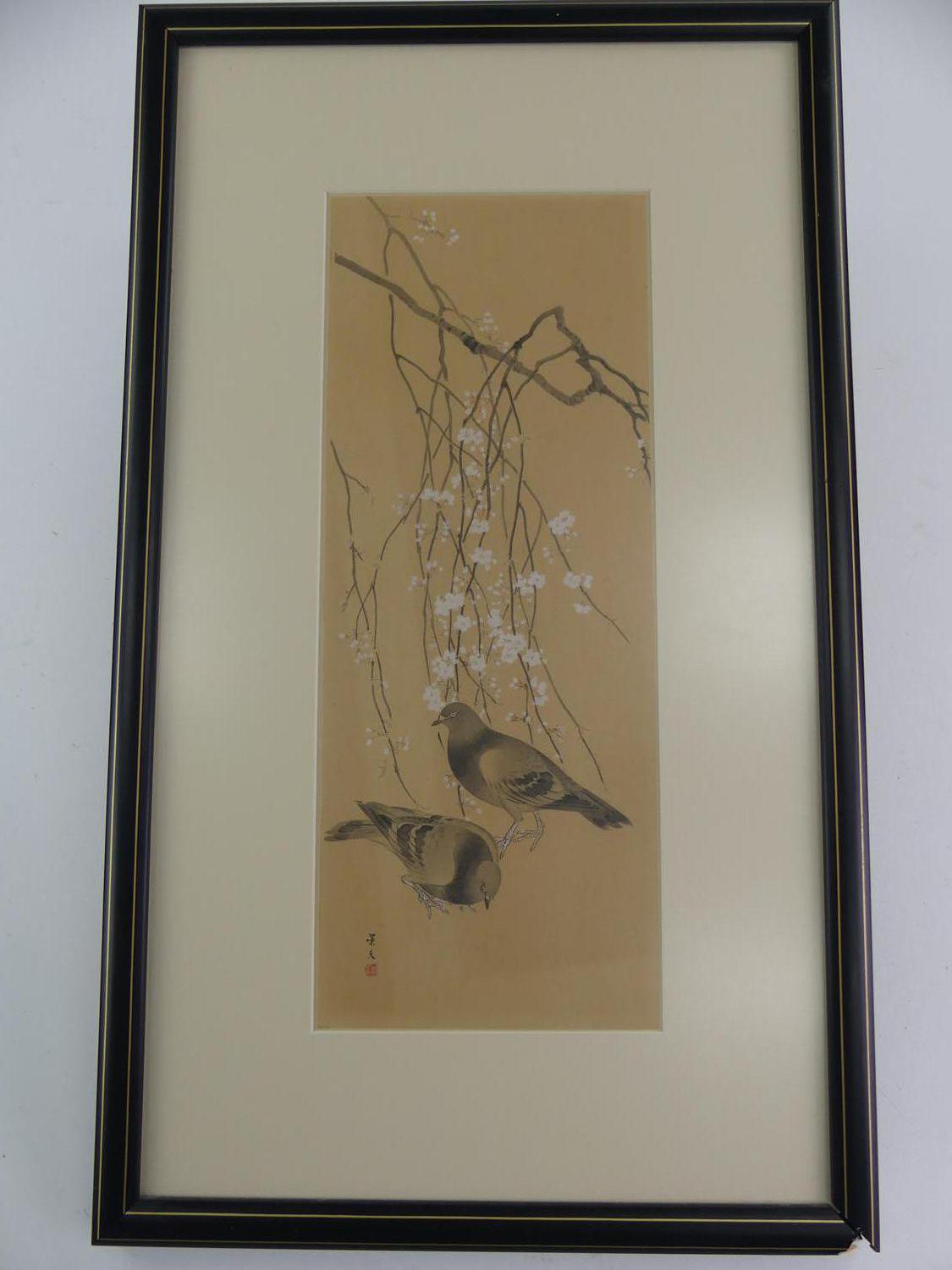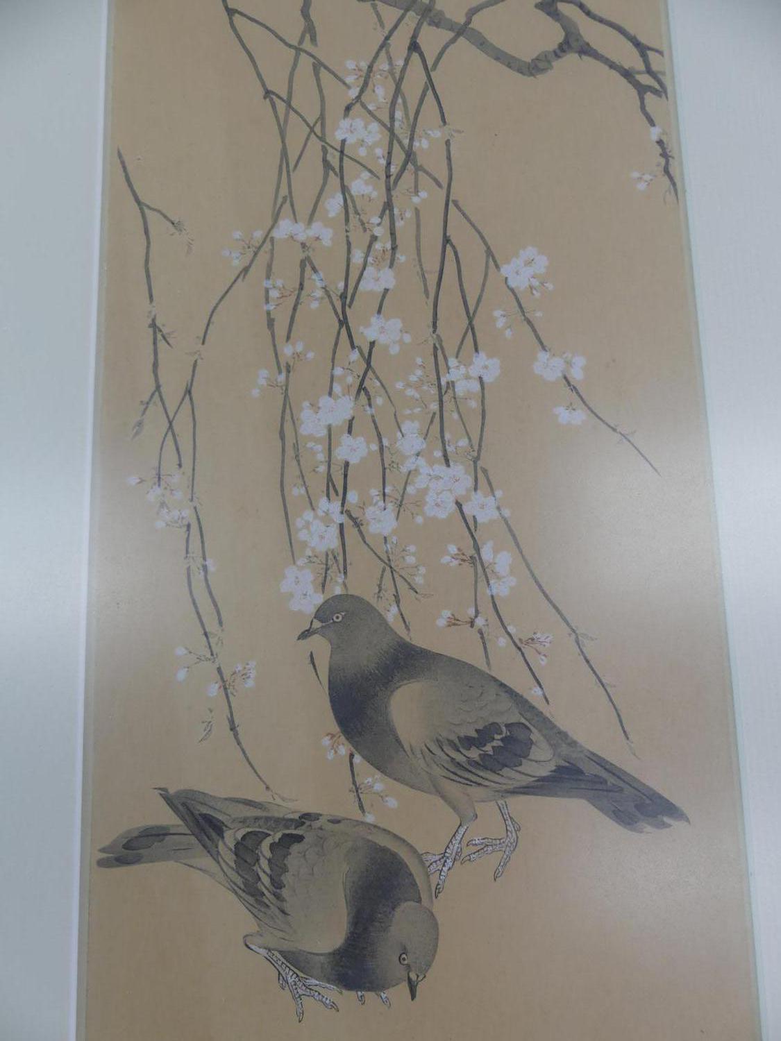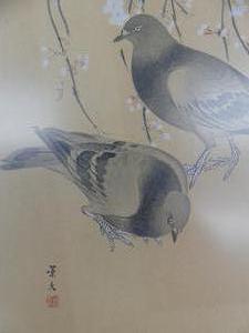 japanese woodblock print, 15" x 6", "pigeons and flowering branches"