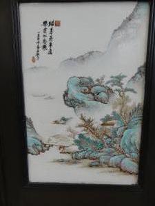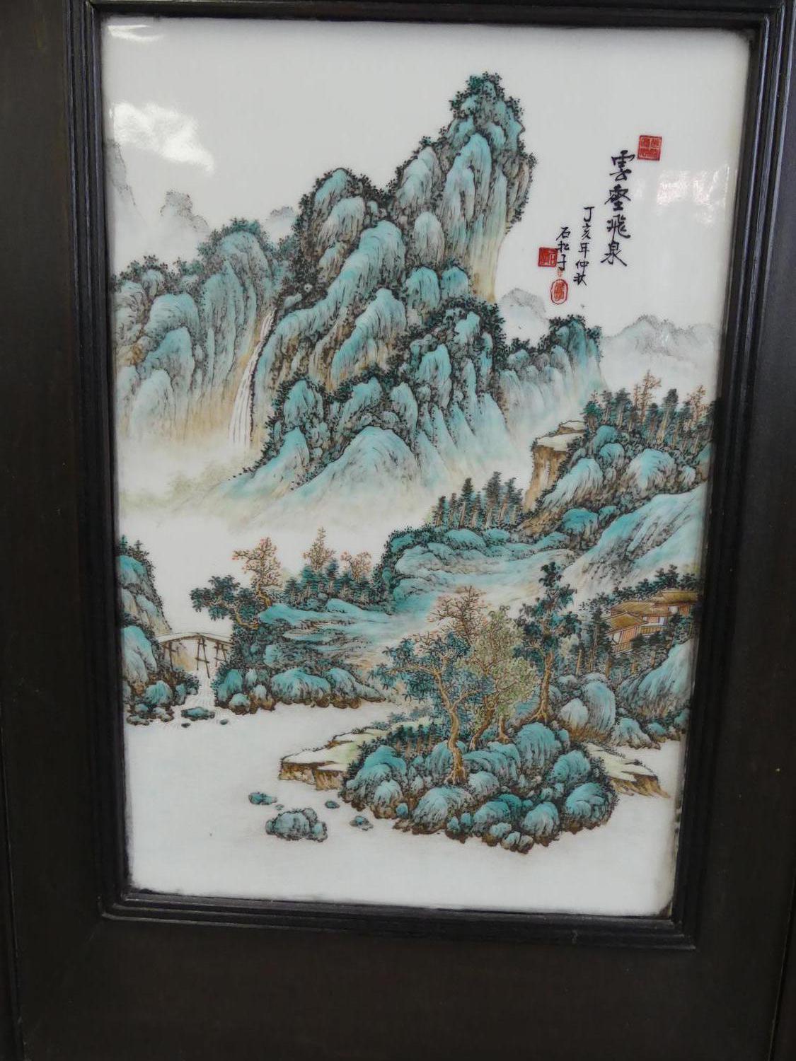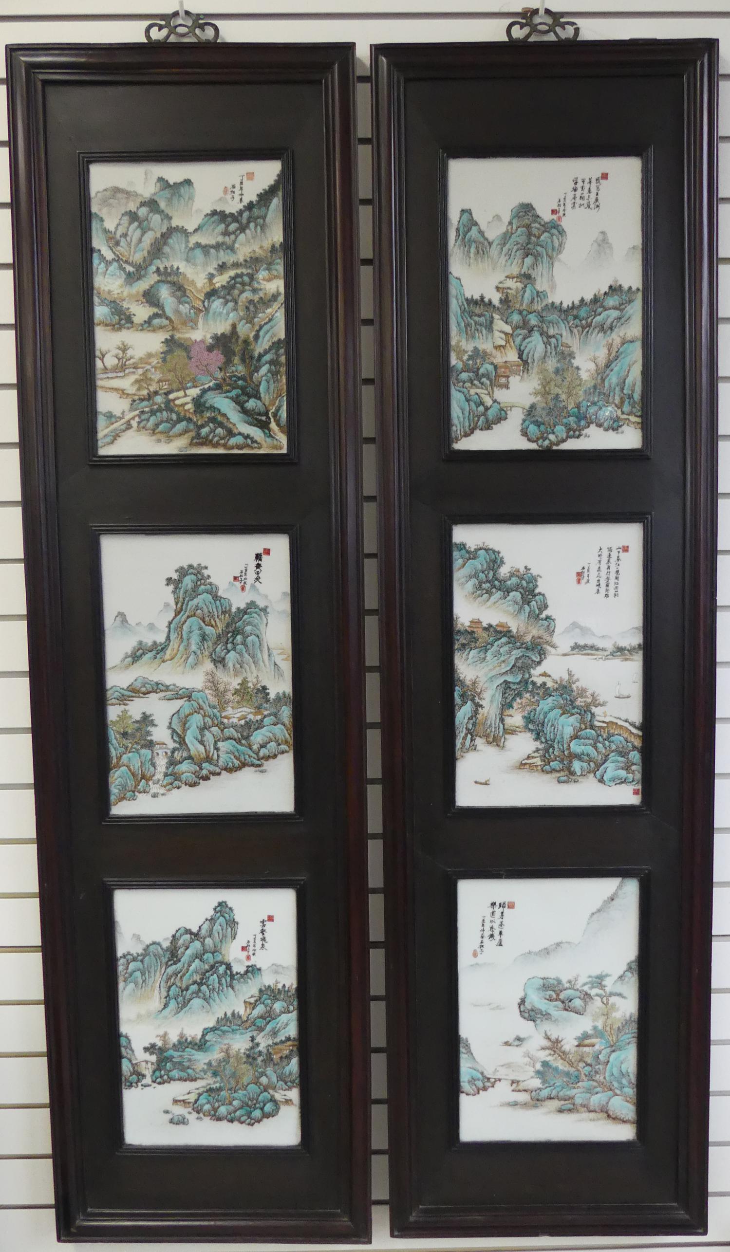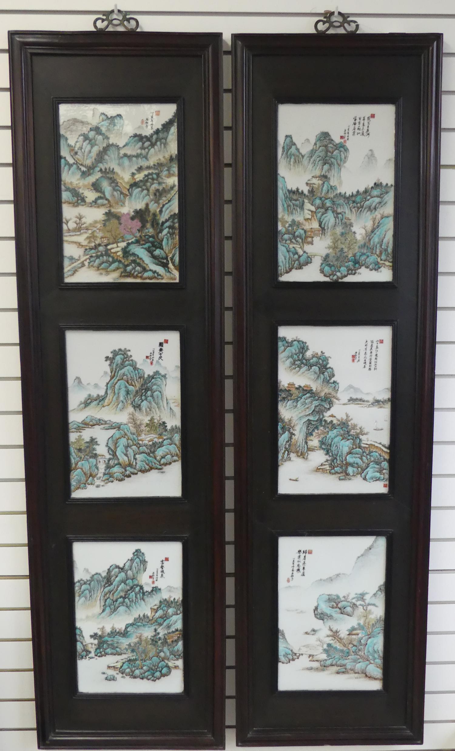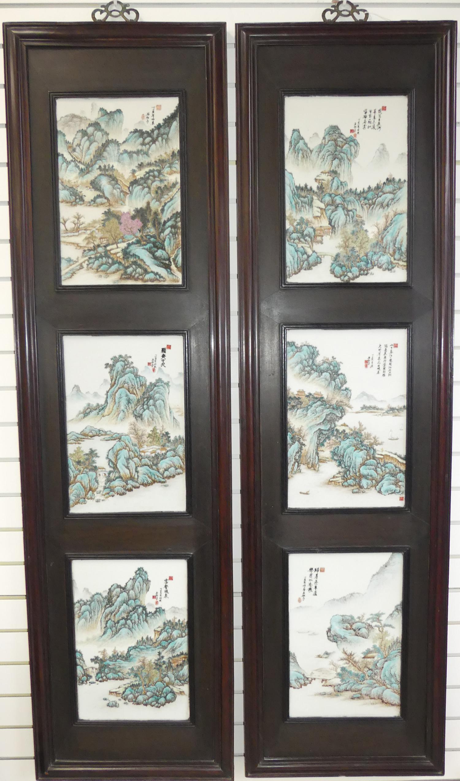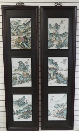 set of six chinese porcelain panels, framed as two large panels 15" x 10", 62" x 17 1/2" overall