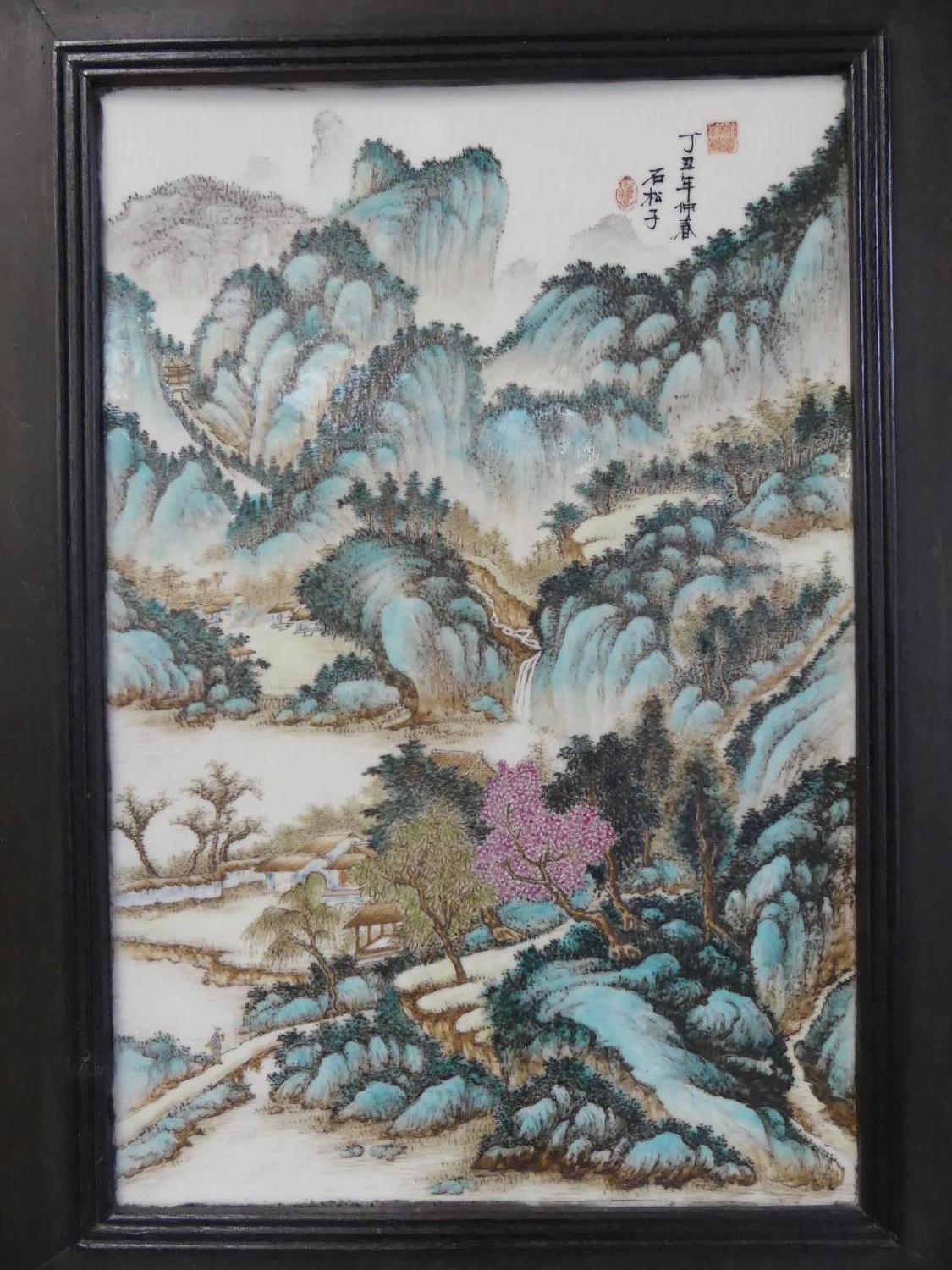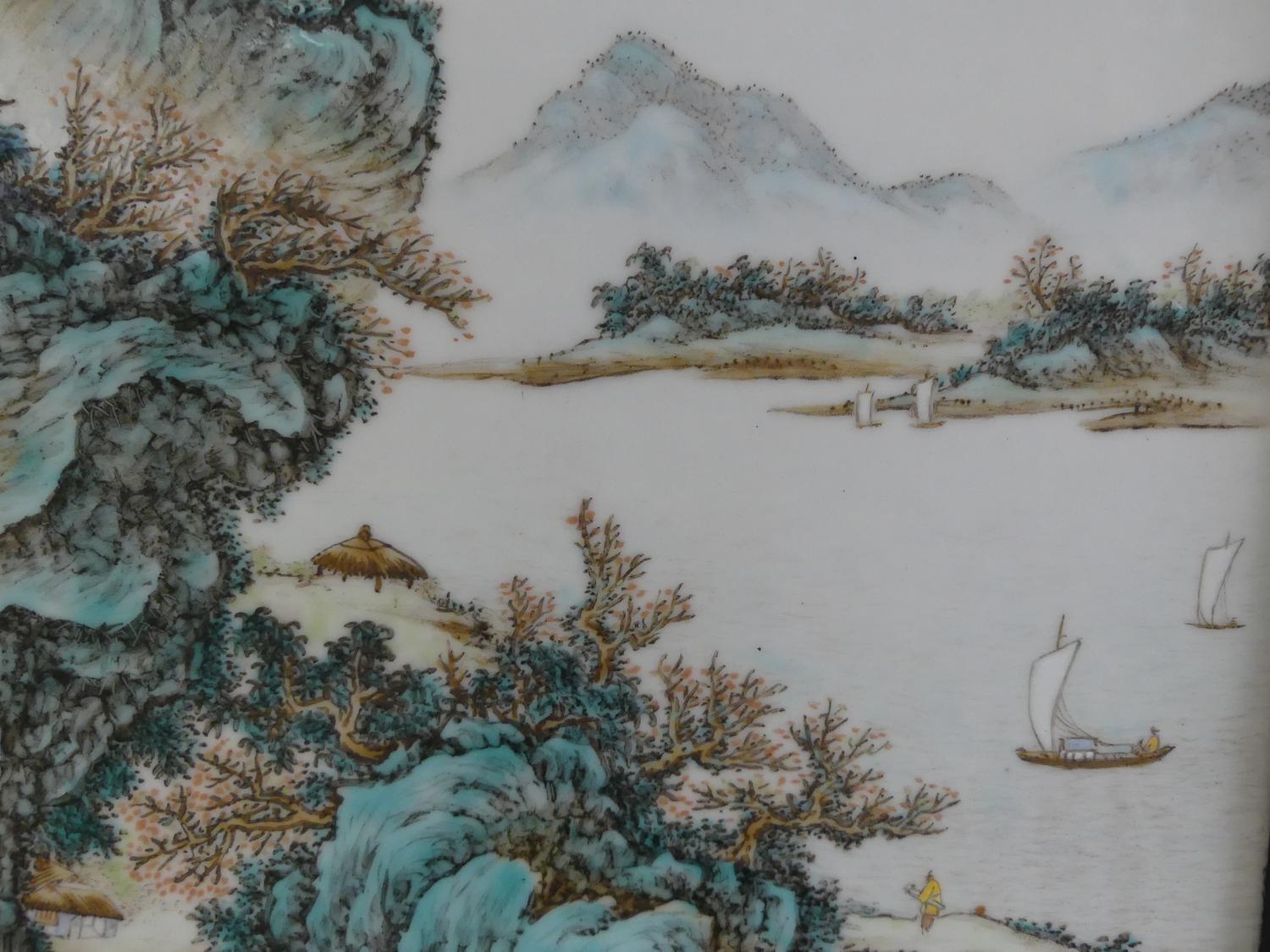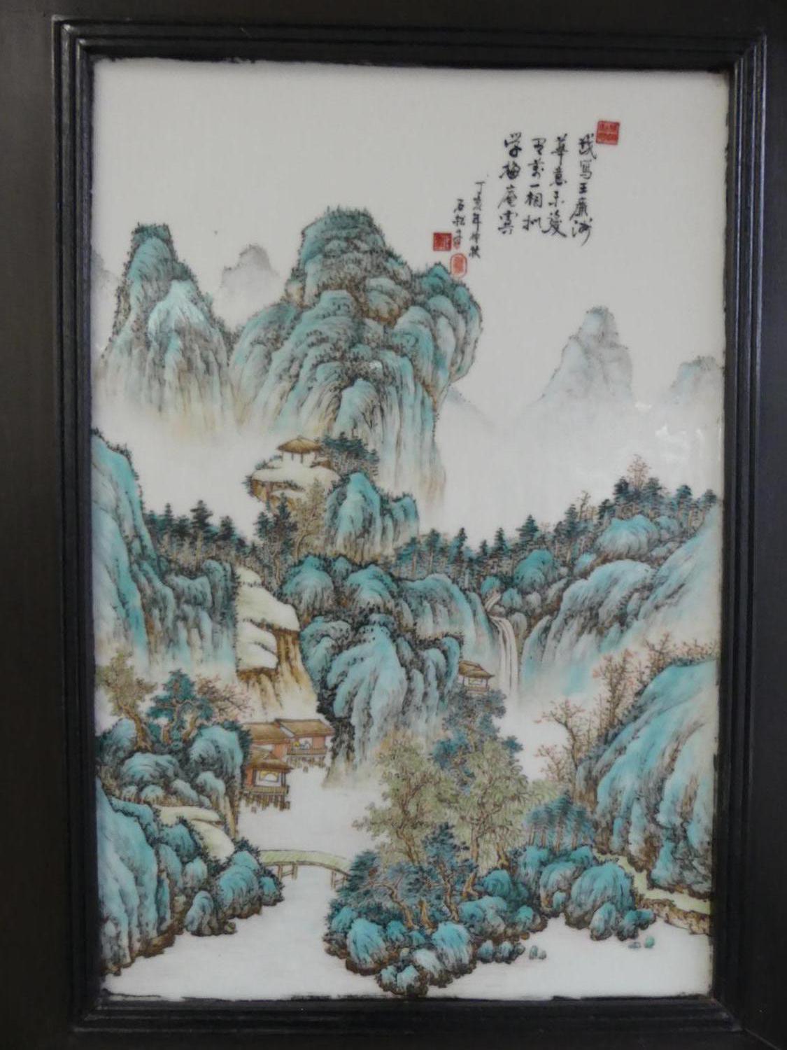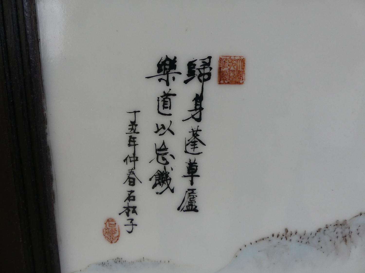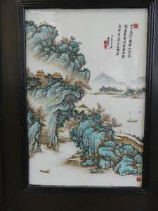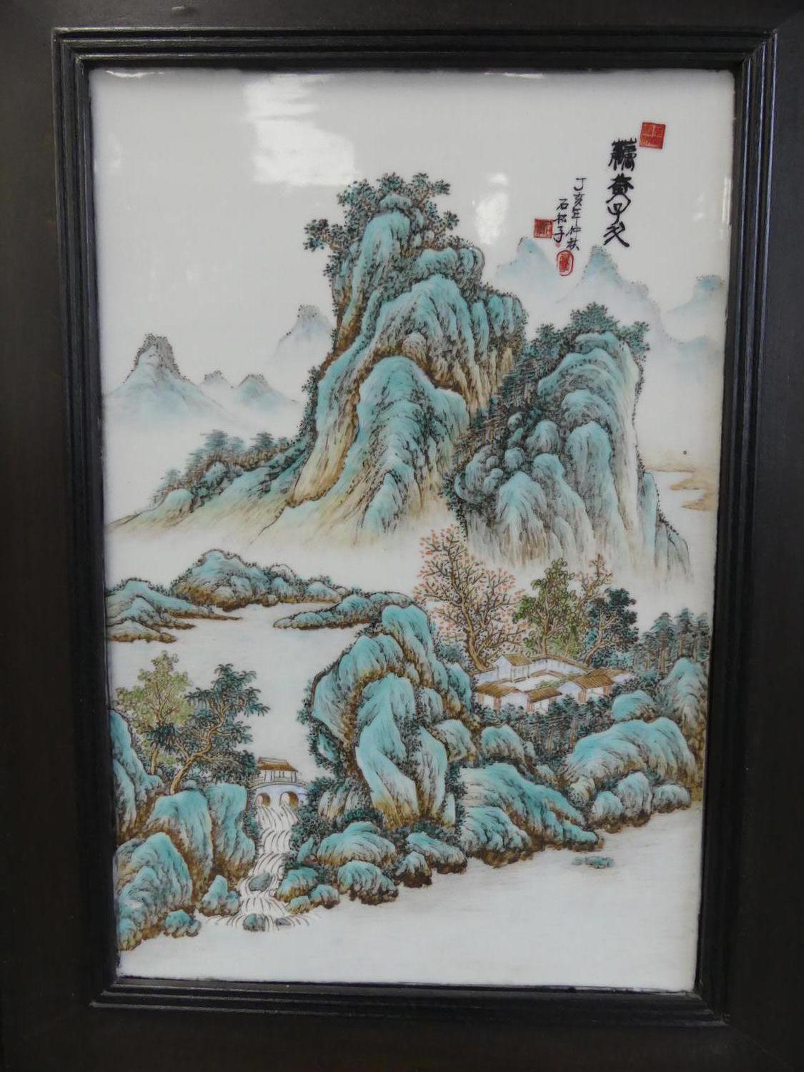 set of six chinese porcelain panels, framed as two large panels 15" x 10", 62" x 17 1/2" overall