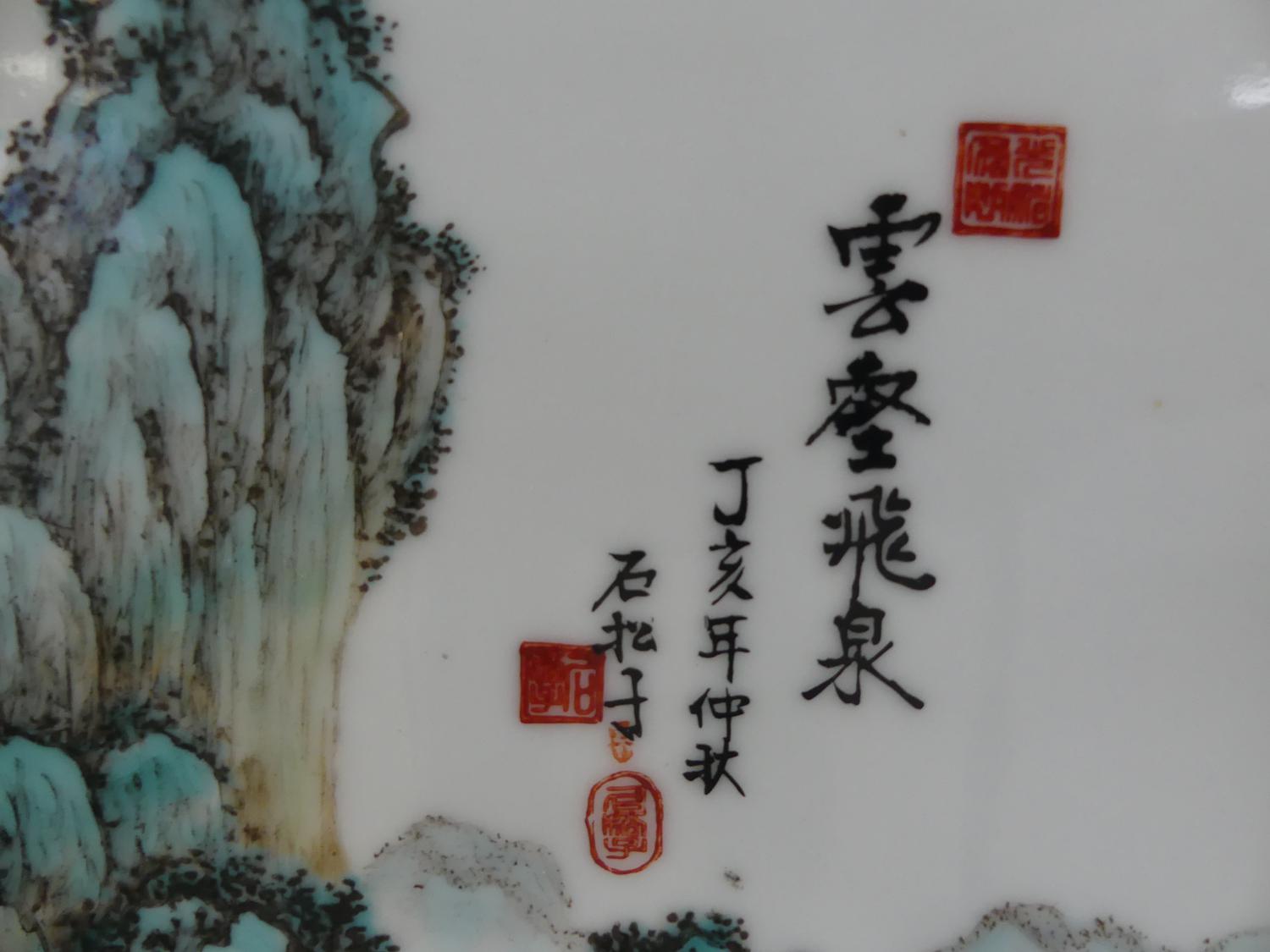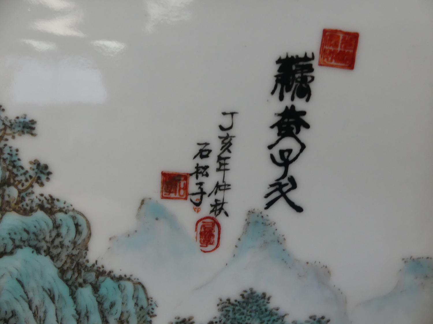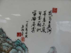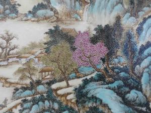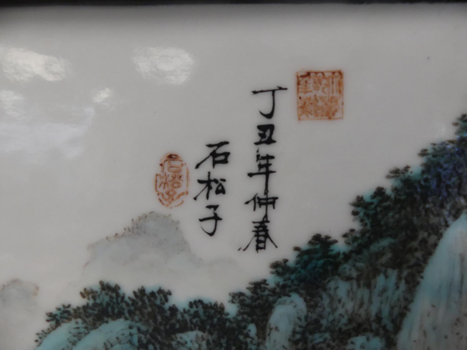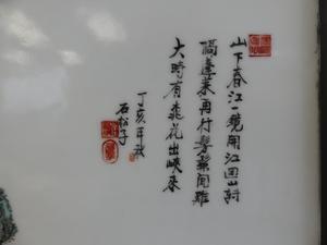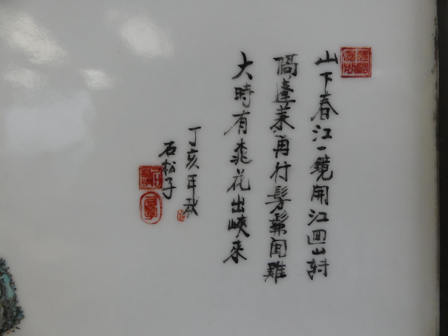 set of six chinese porcelain panels, framed as two large panels 15" x 10", 62" x 17 1/2" overall