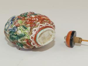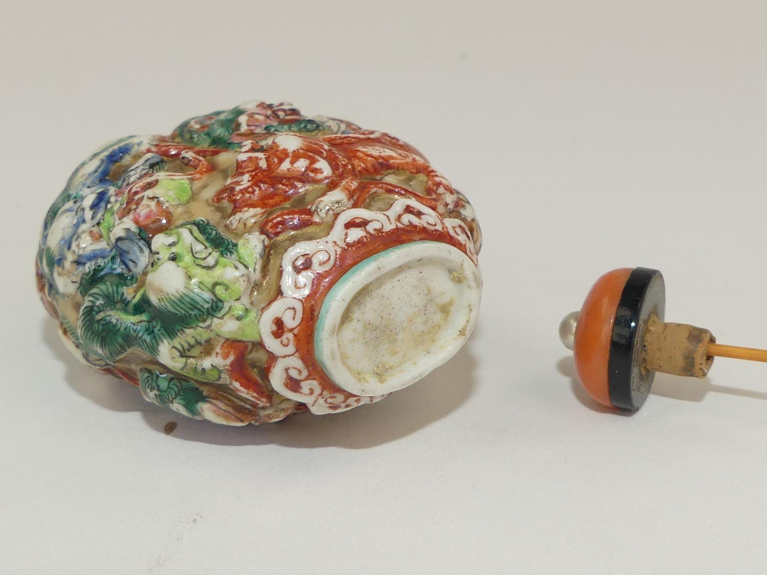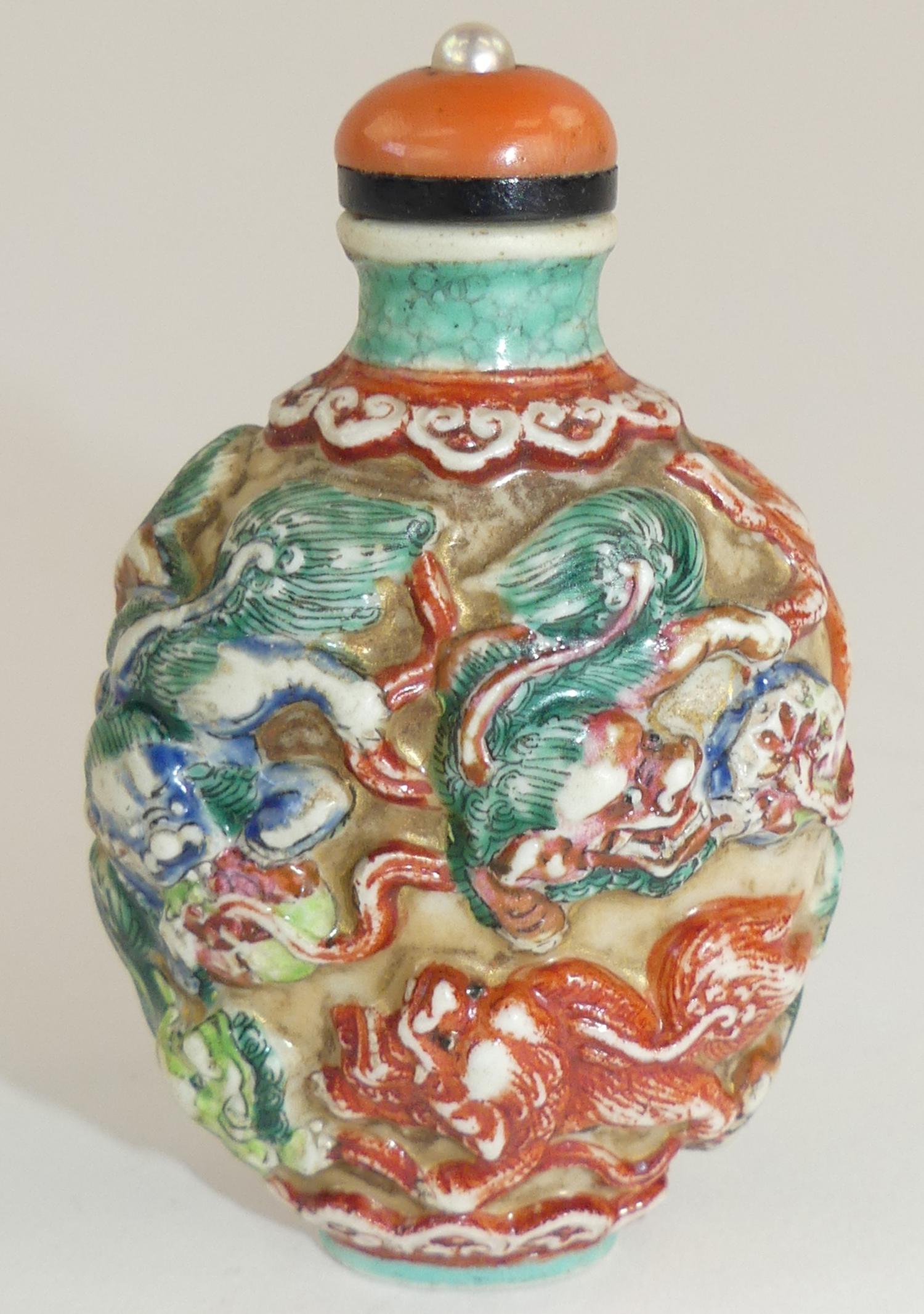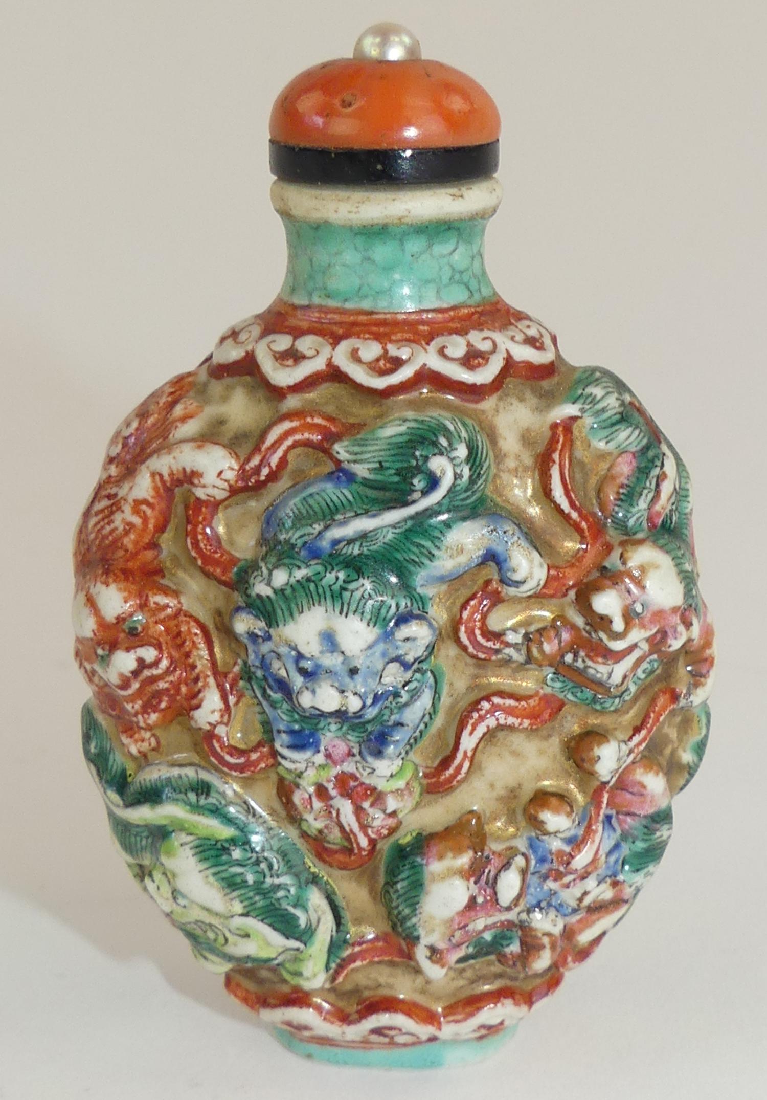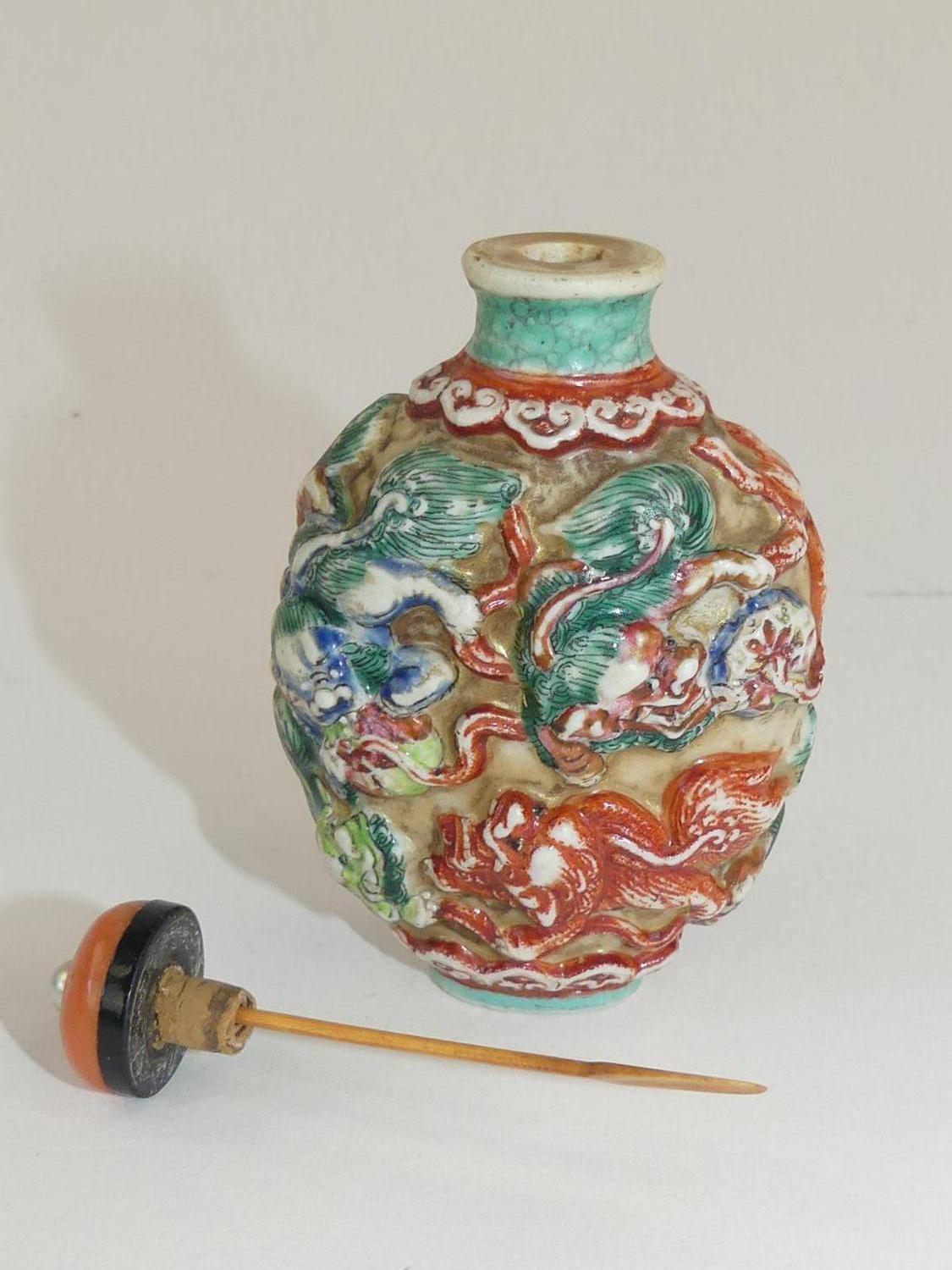 chinese porcleain foo dog decorated snuff bottle, ht 2 3/4"