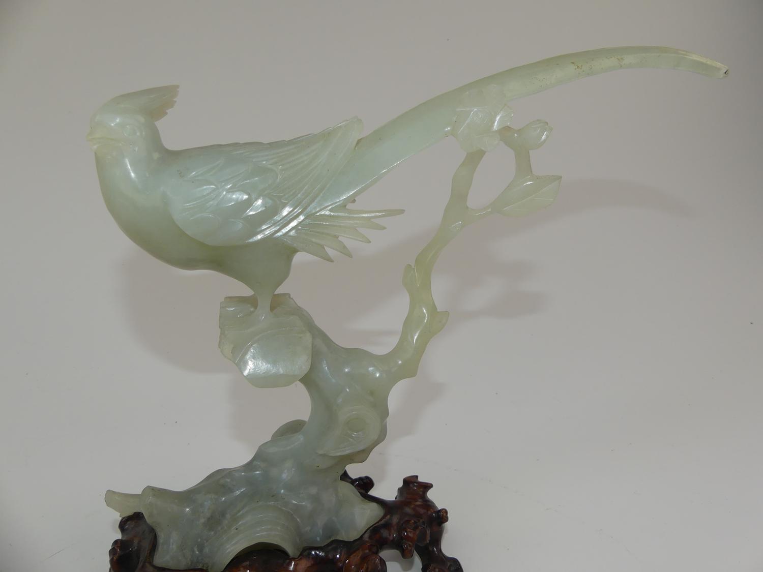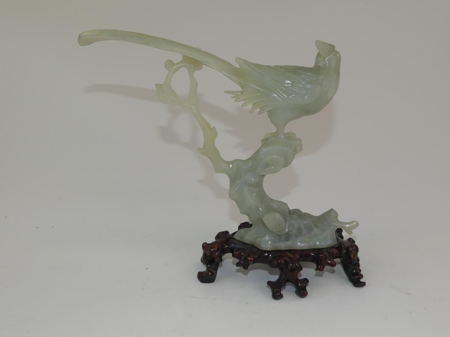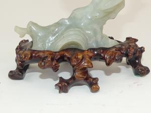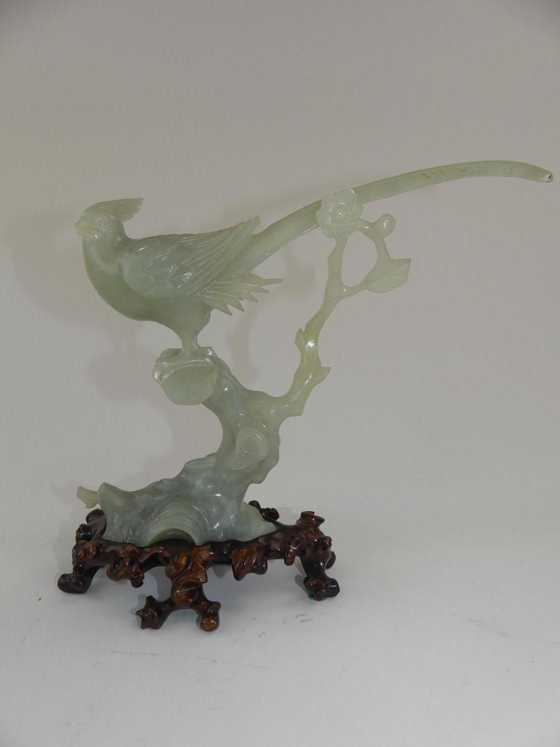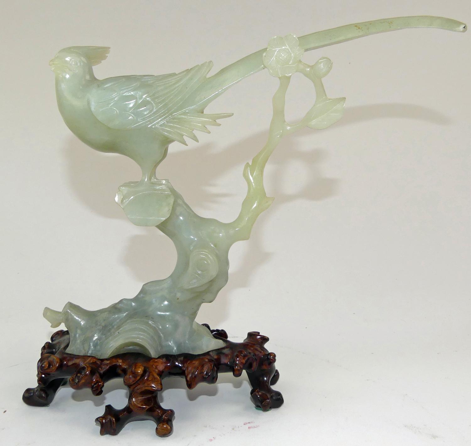 chinese carved jade bird on a branch on stand, 9" x 10" x 4"