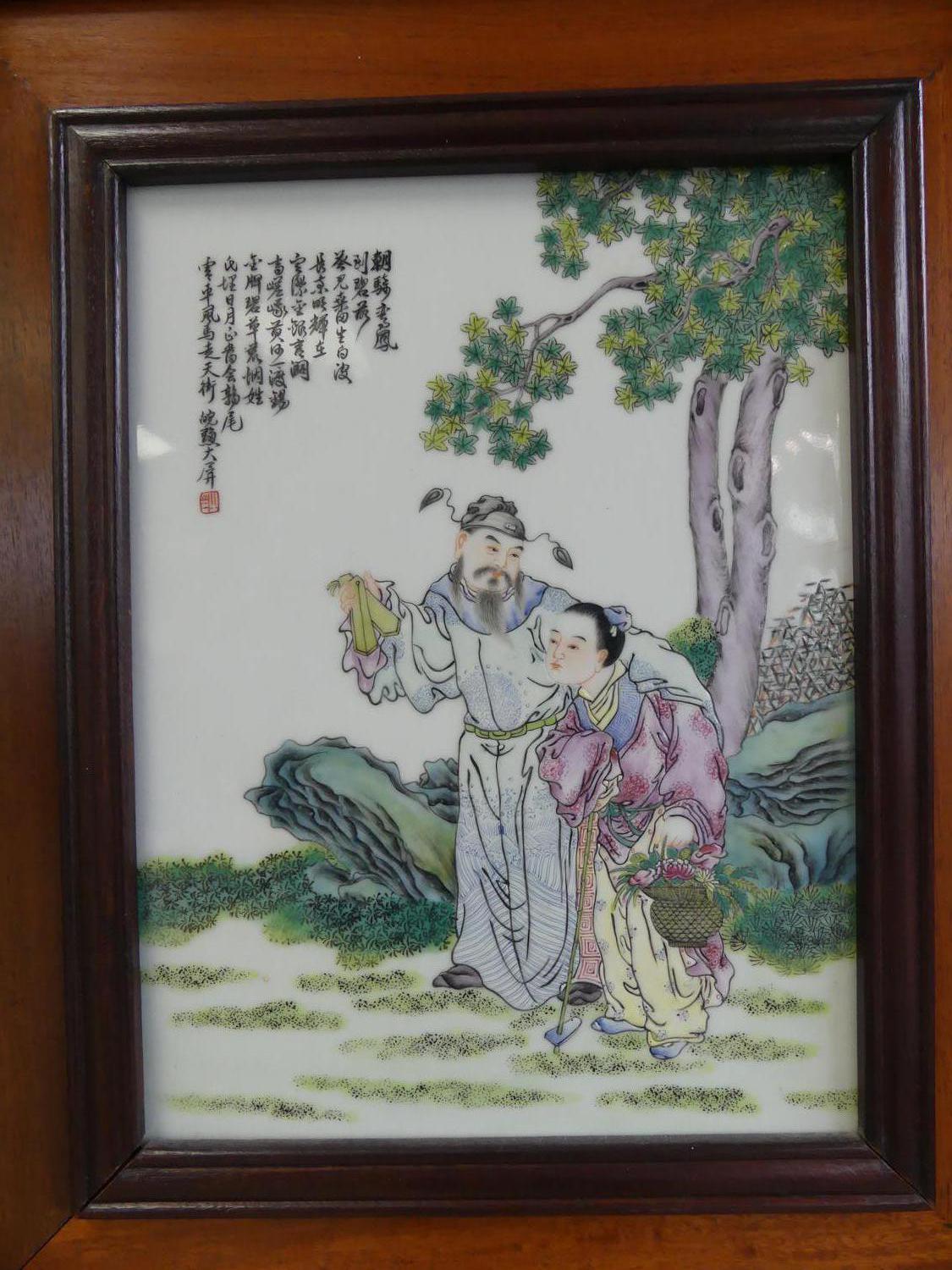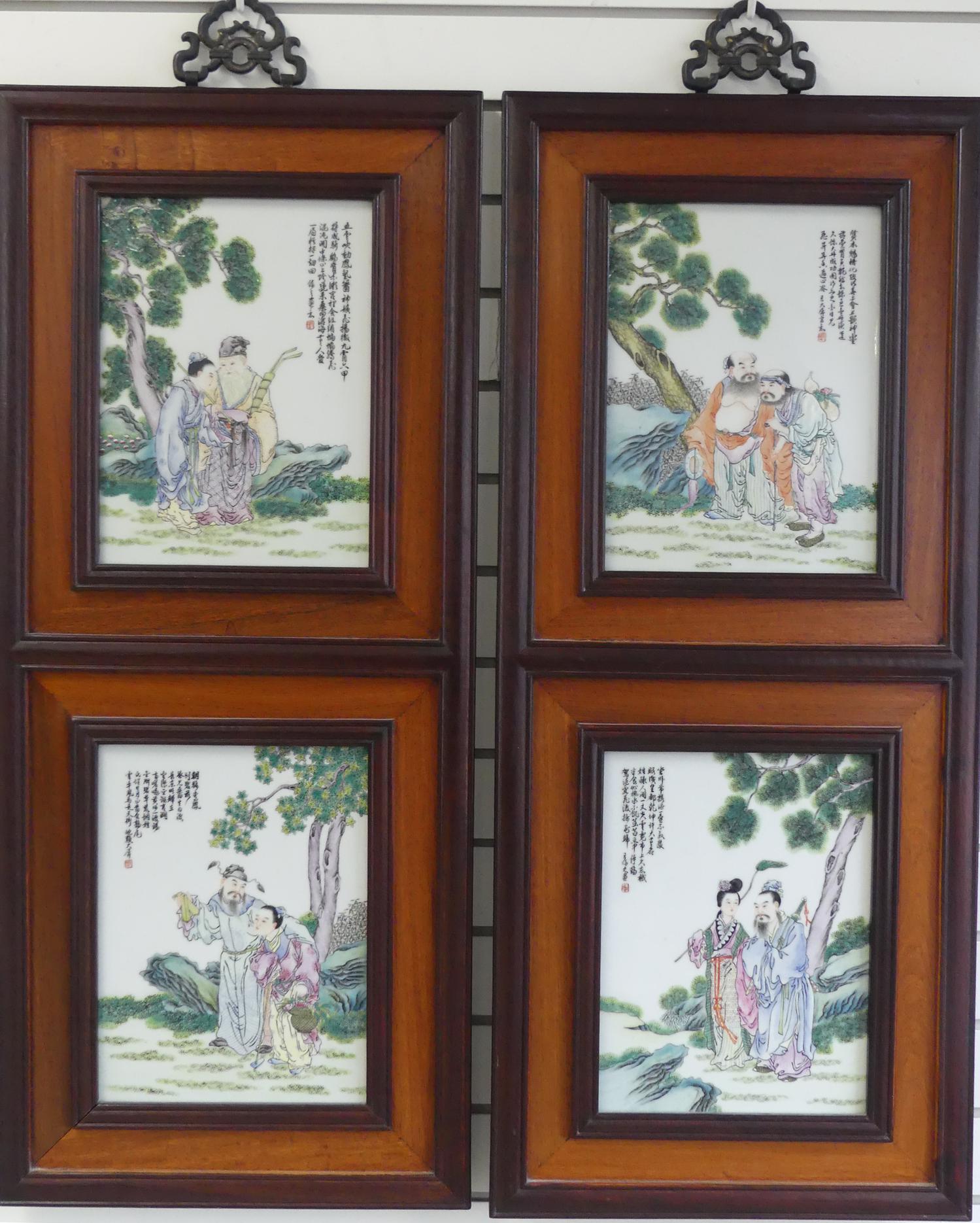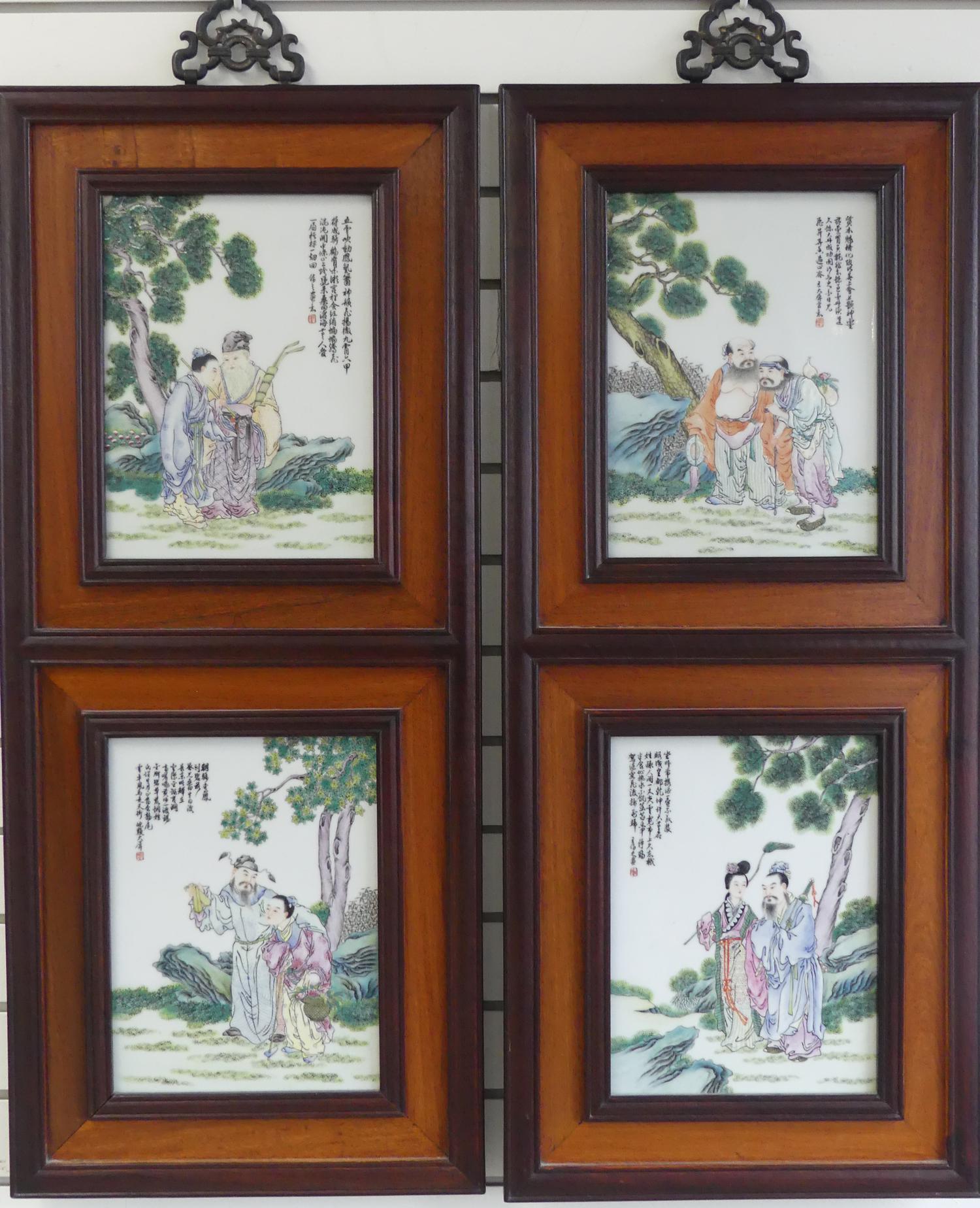 set of four hardwood framed chinese porcleain panels, 12" x 9"
