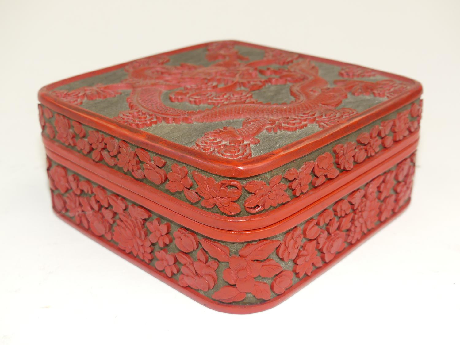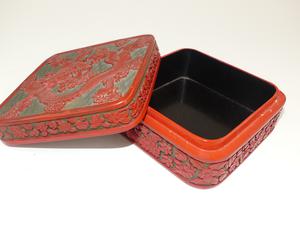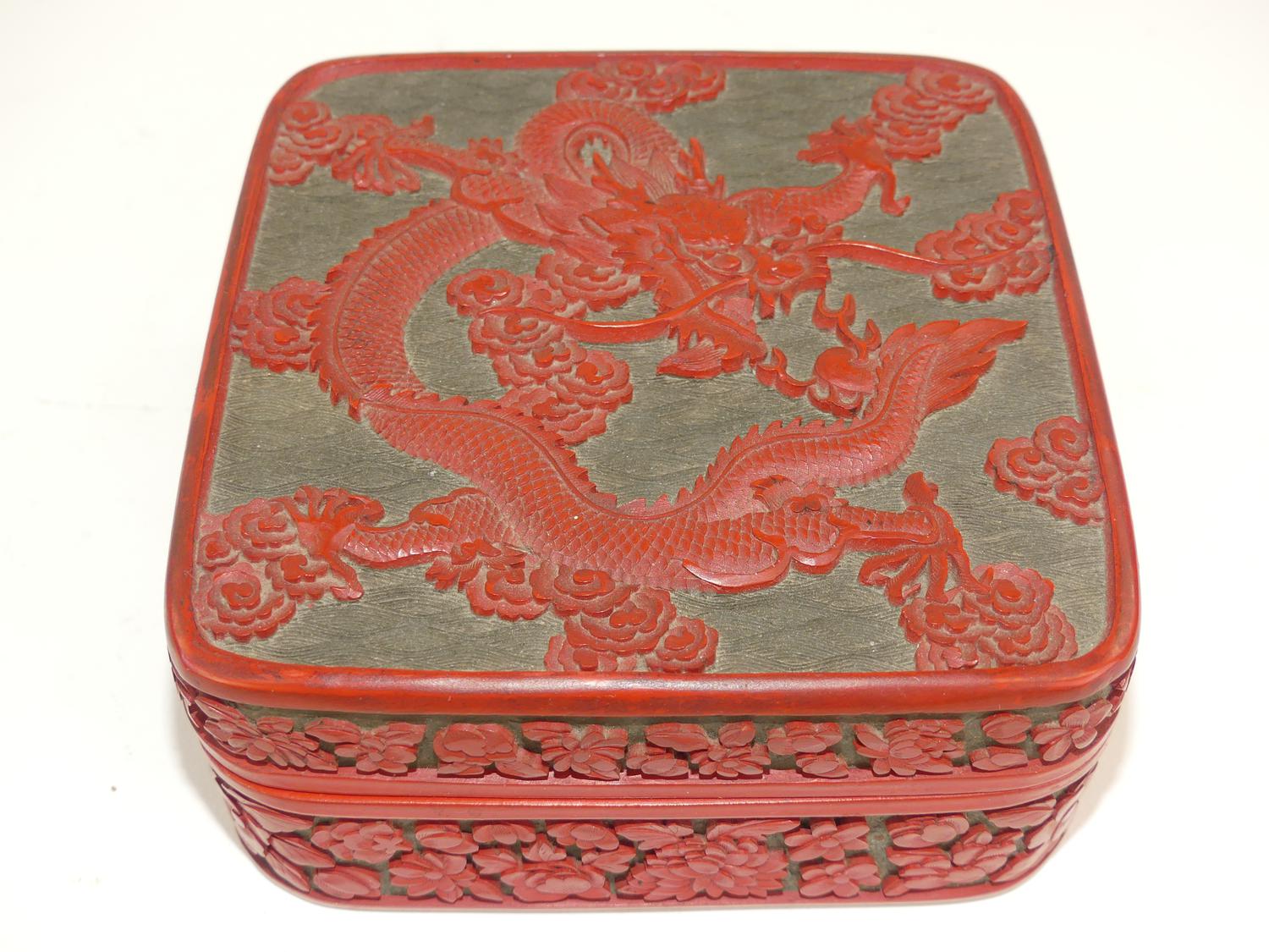 chinese lacquered cinnabar dragon box, 2 1/4" x 5 1/4" x 5 1/4"