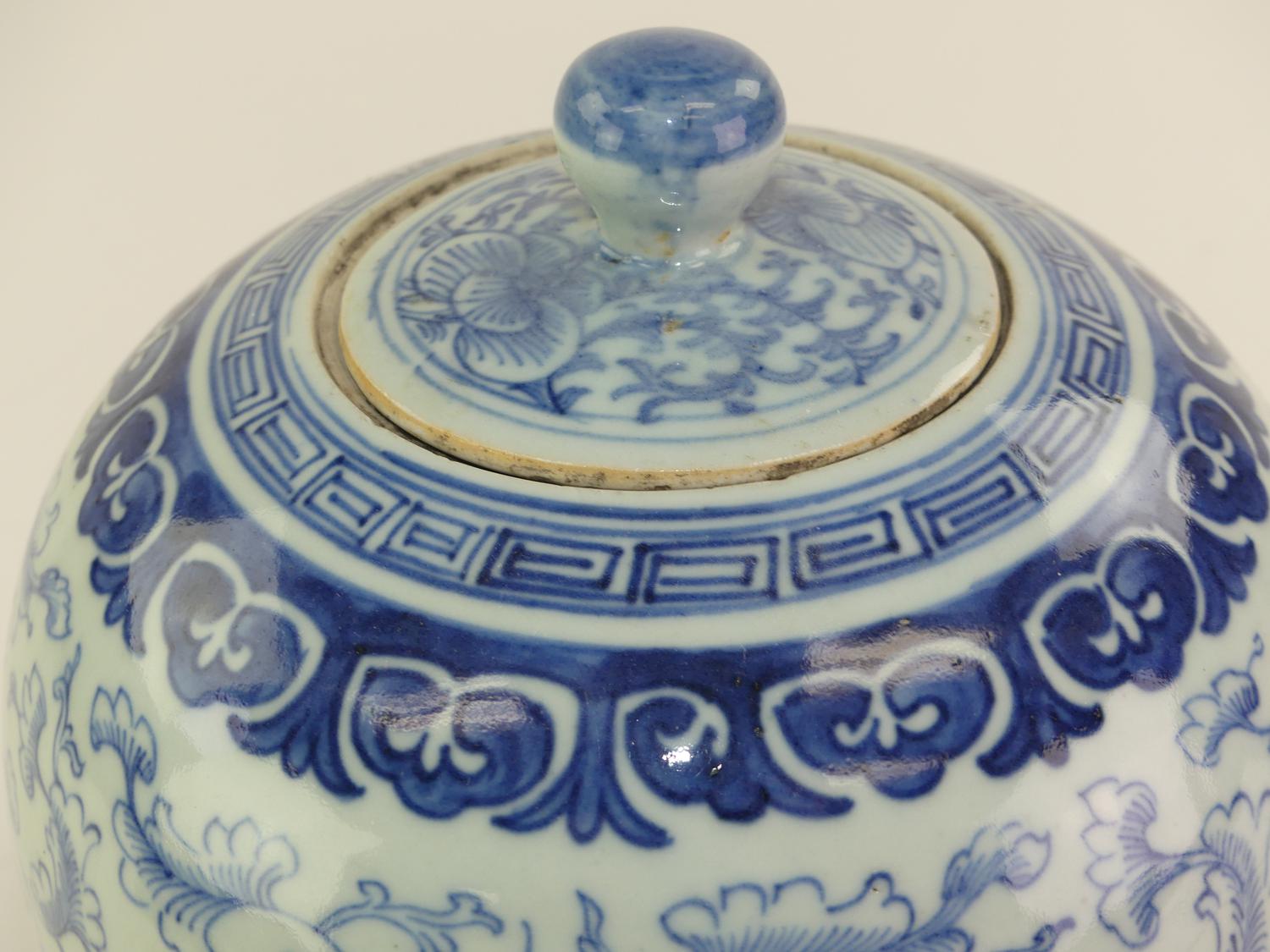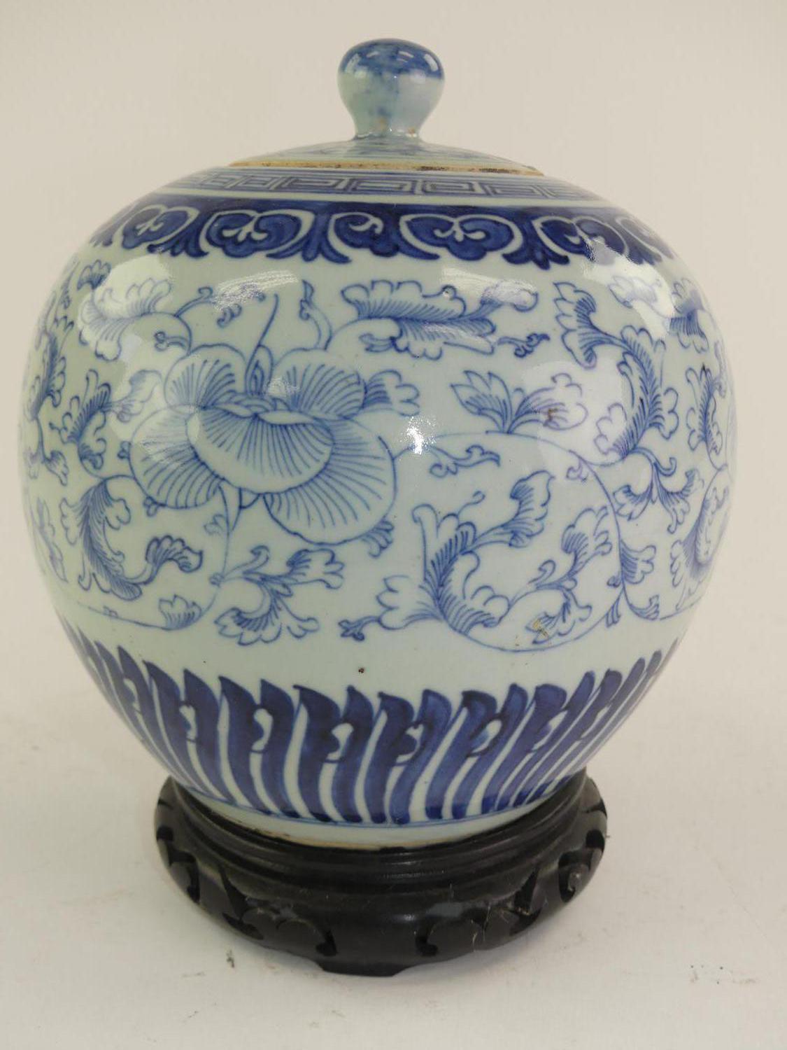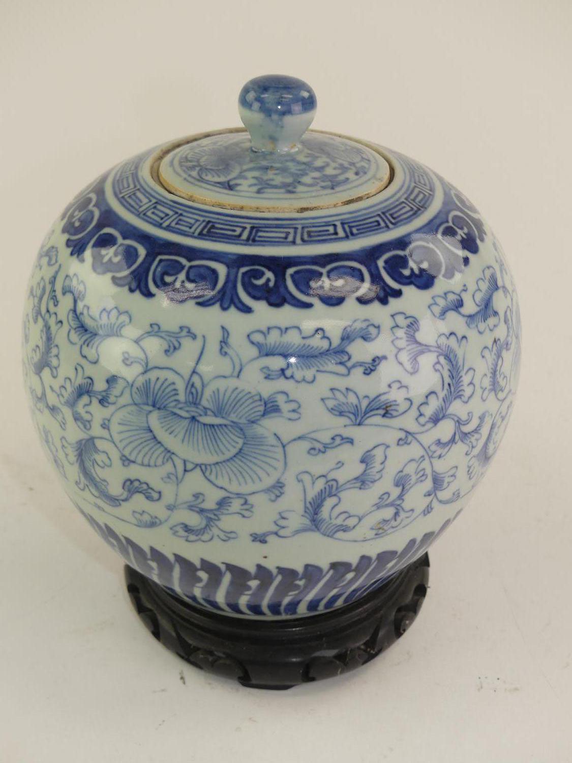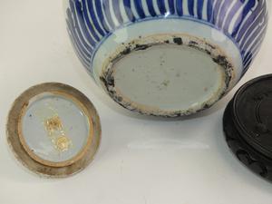 chinese bule and white jardiniere on stand, ht 9 1/2"