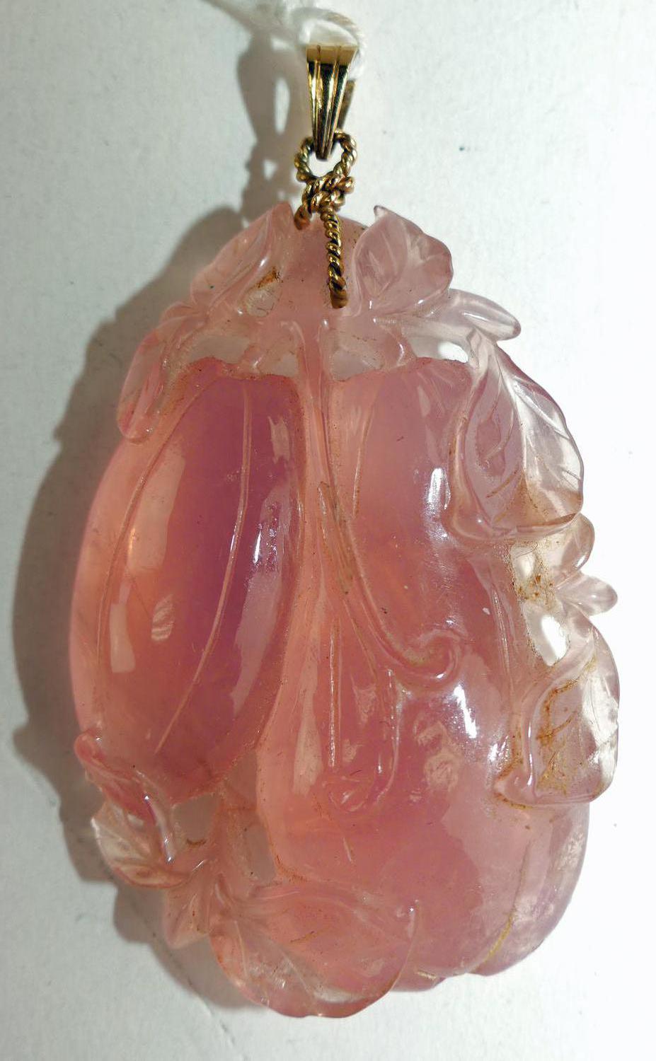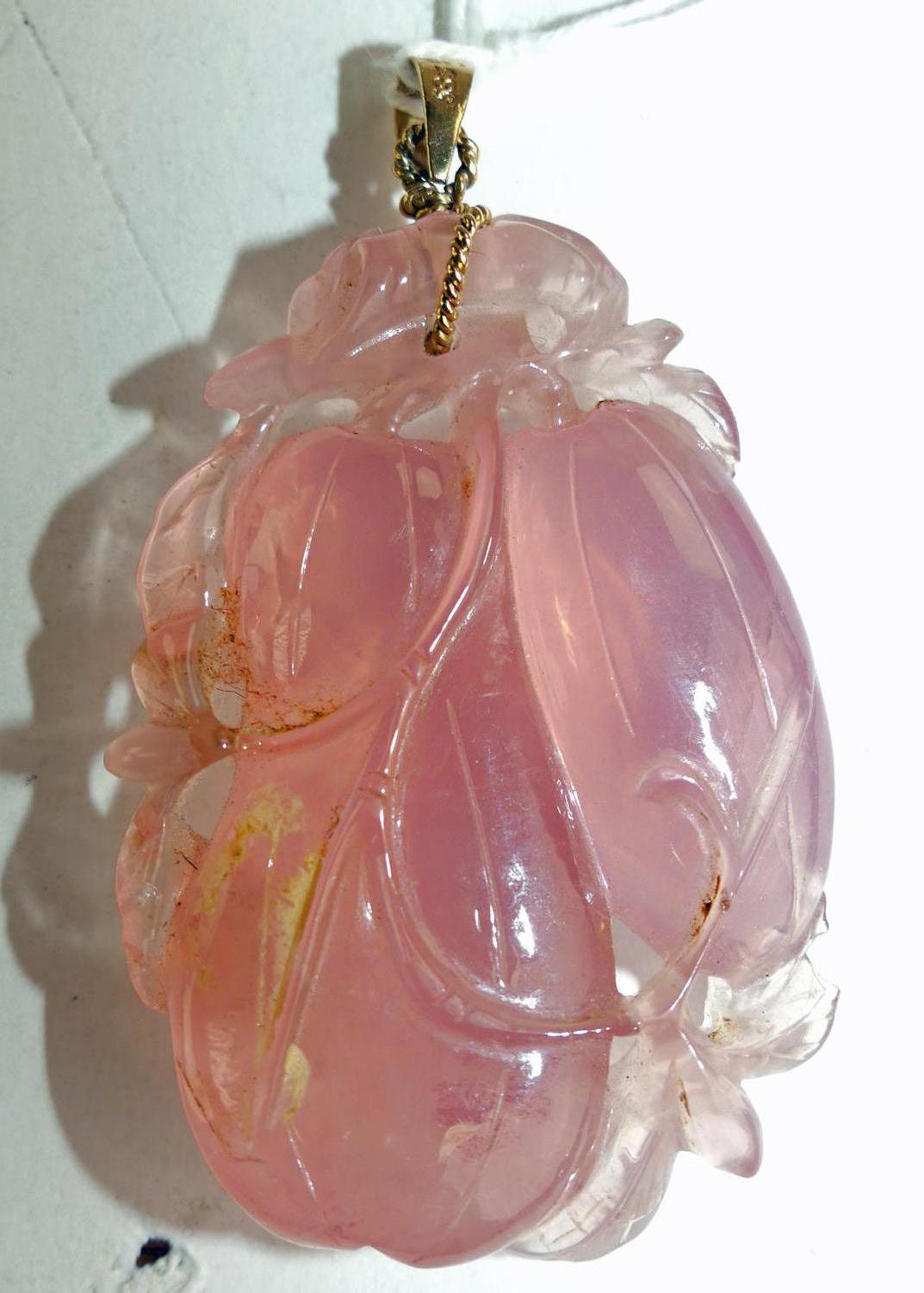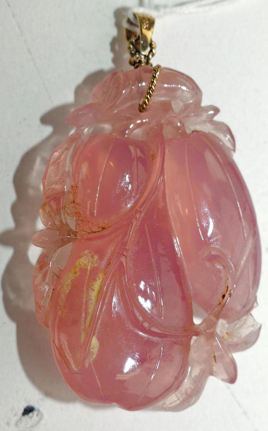 chinese carved pink rose quartz pendant, 14k gold mount. length 2 1/2"