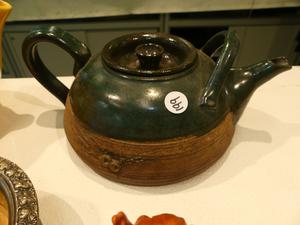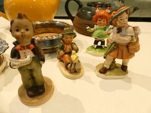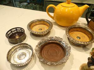 art pottery tea pots, silver plate bottle coasters and four hummel style figures
