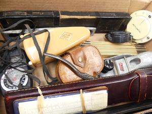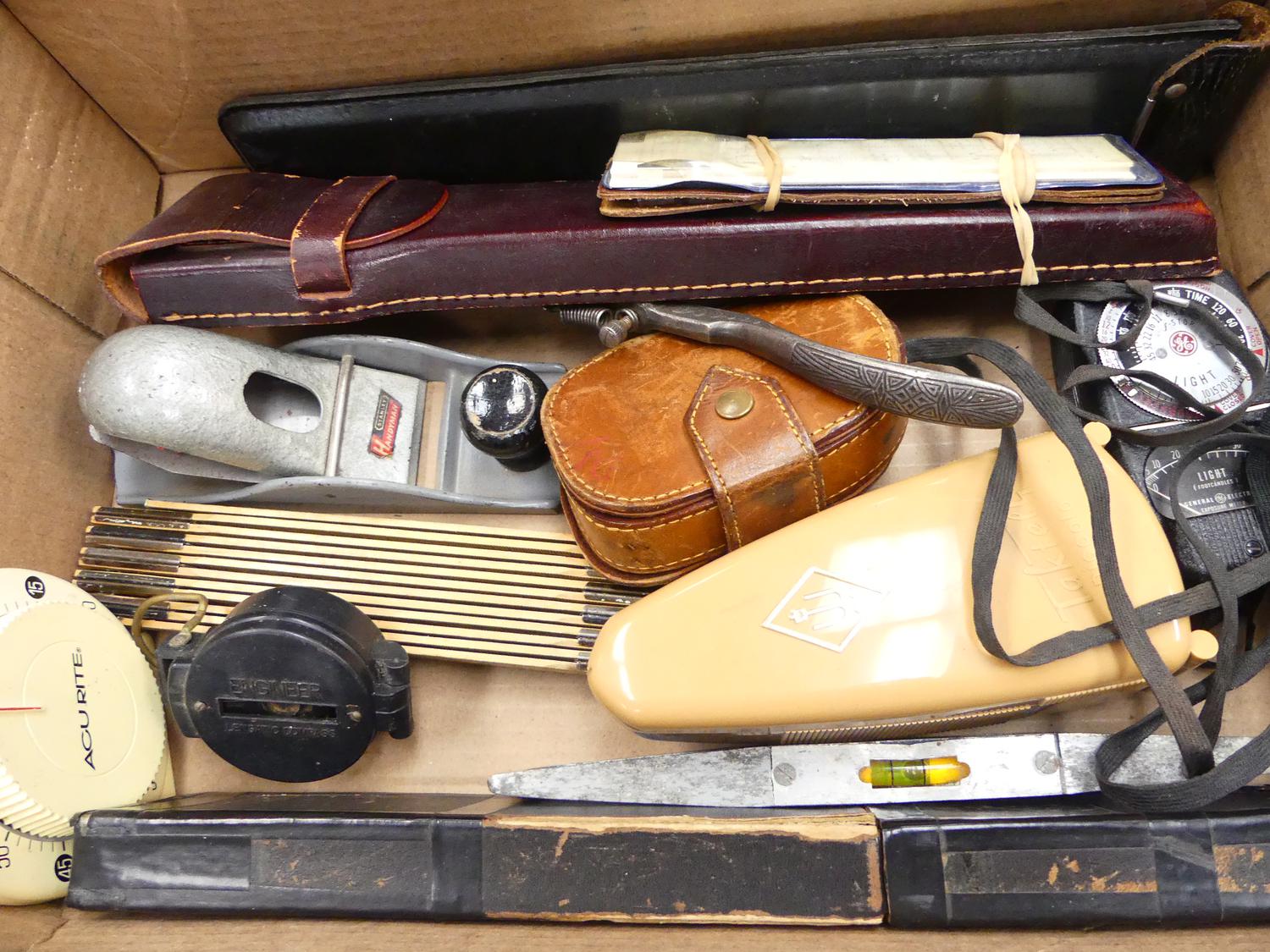 box of vintage measuring tools and other tools