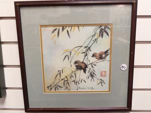 freda wolfe, watercolour, 8" x 8", "birds on bamboo branches"