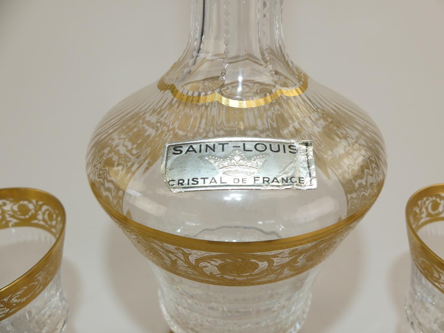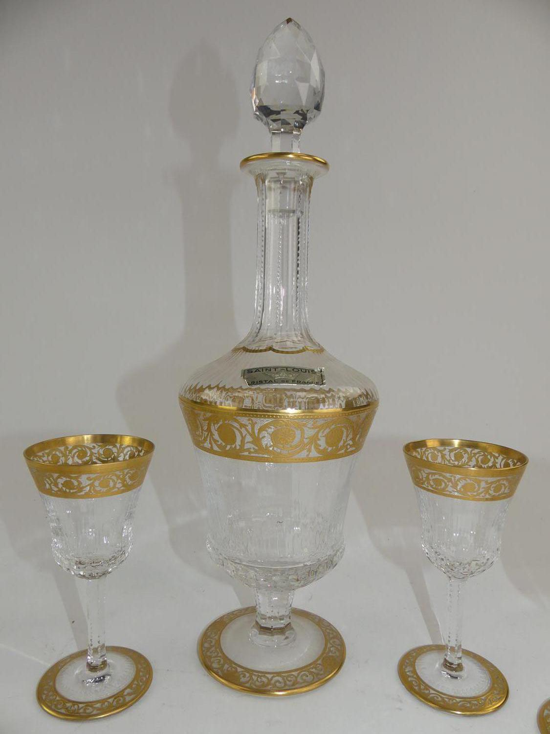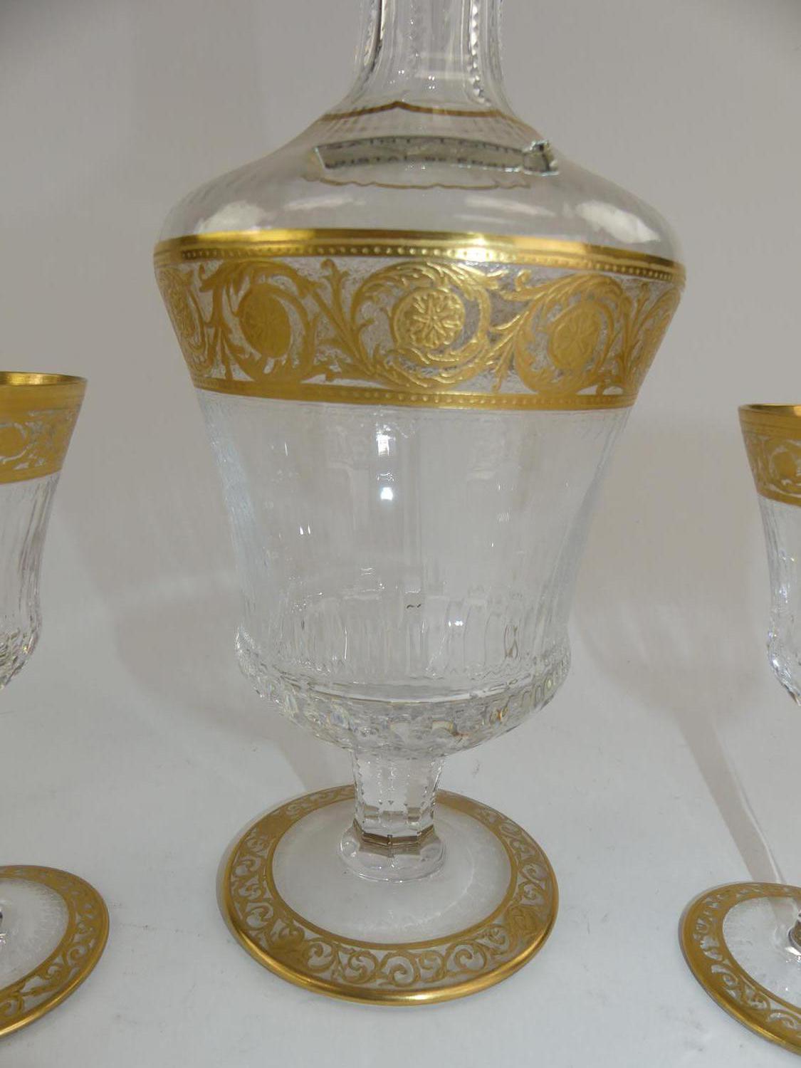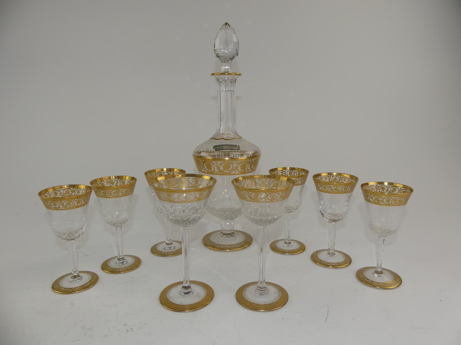 st. louis gilt decorated crystal decanter and eight glasses