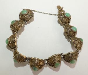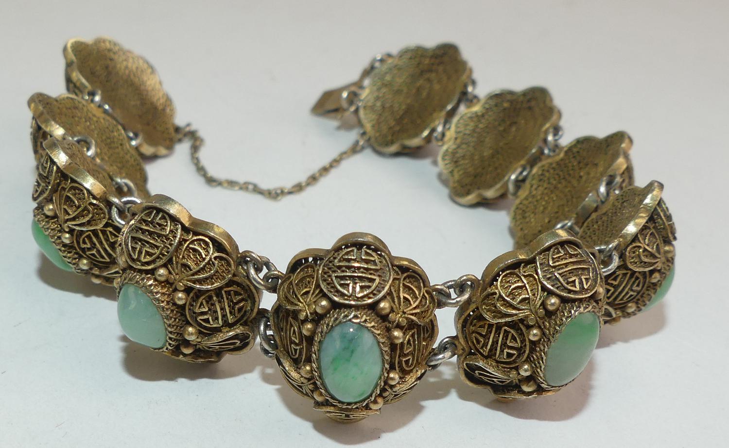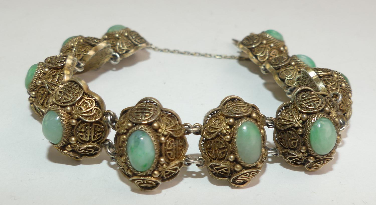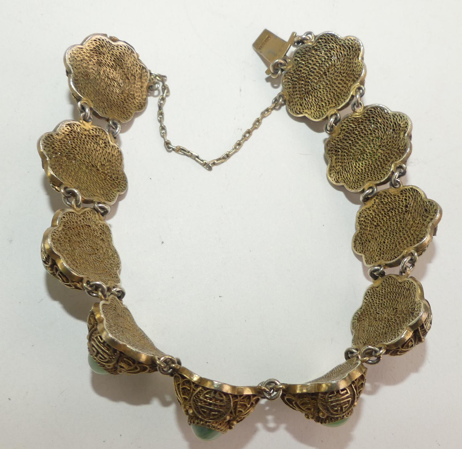 chinese silver vermeil filigree jade bracelet, 7"