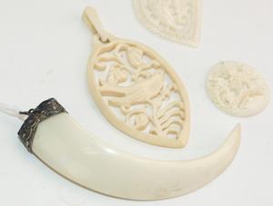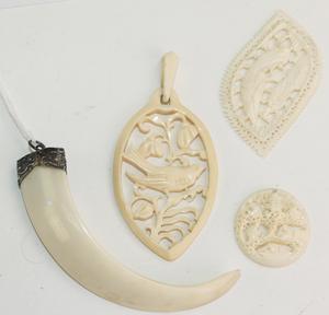 boar tusk pendant, ivory pendant and two ivory carvings