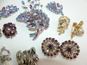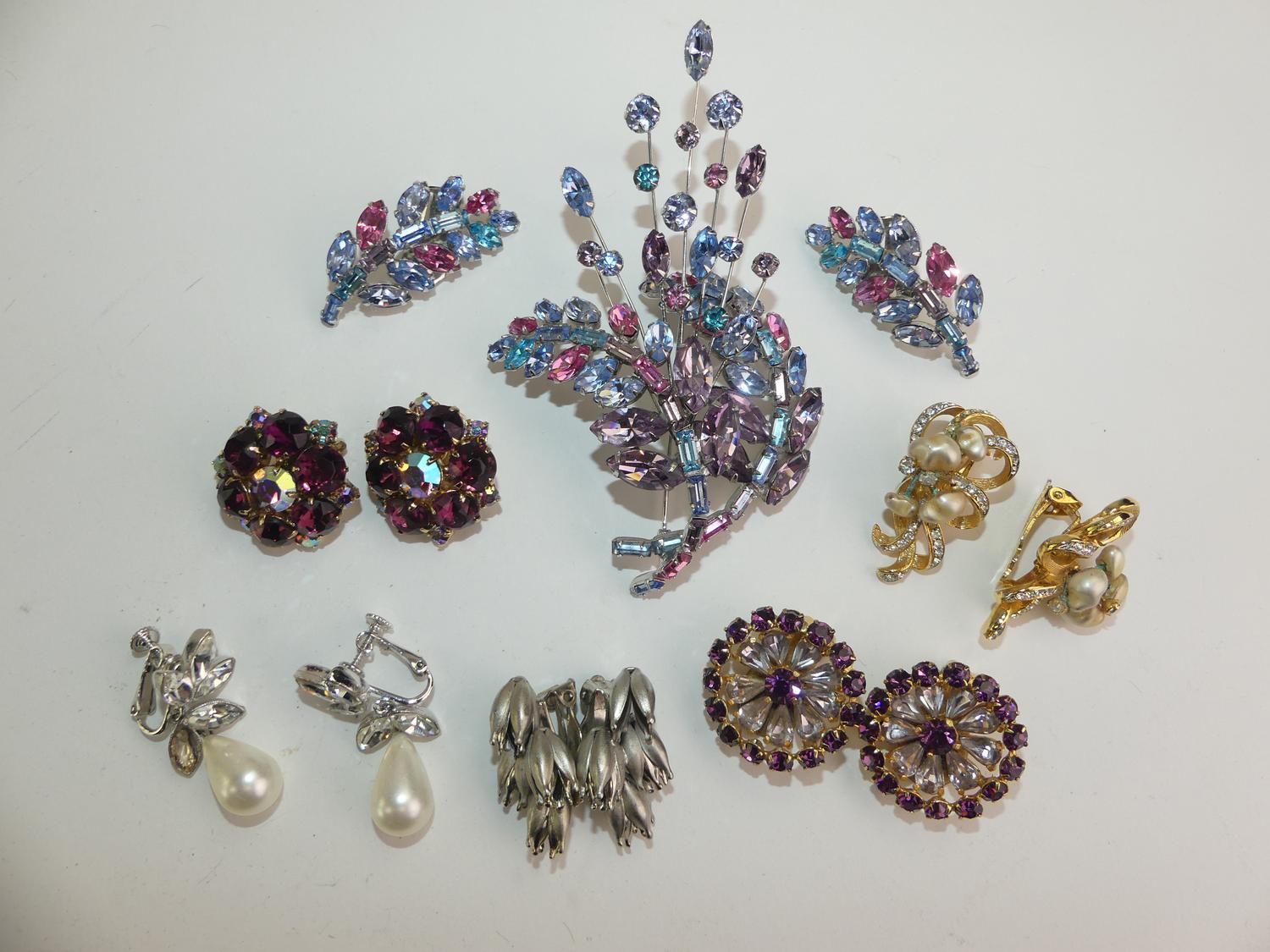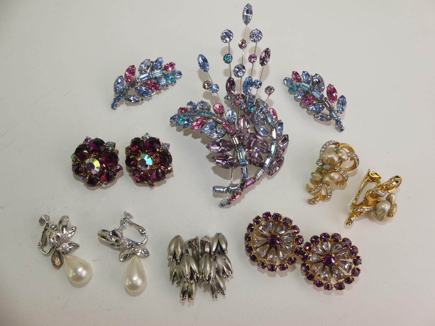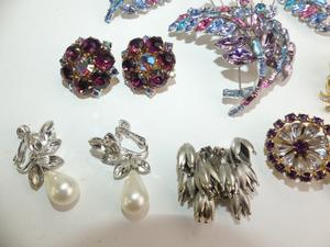 The goldplated pearl earrings are signed Kramer, rest is unsigned, colored brooch is 4"