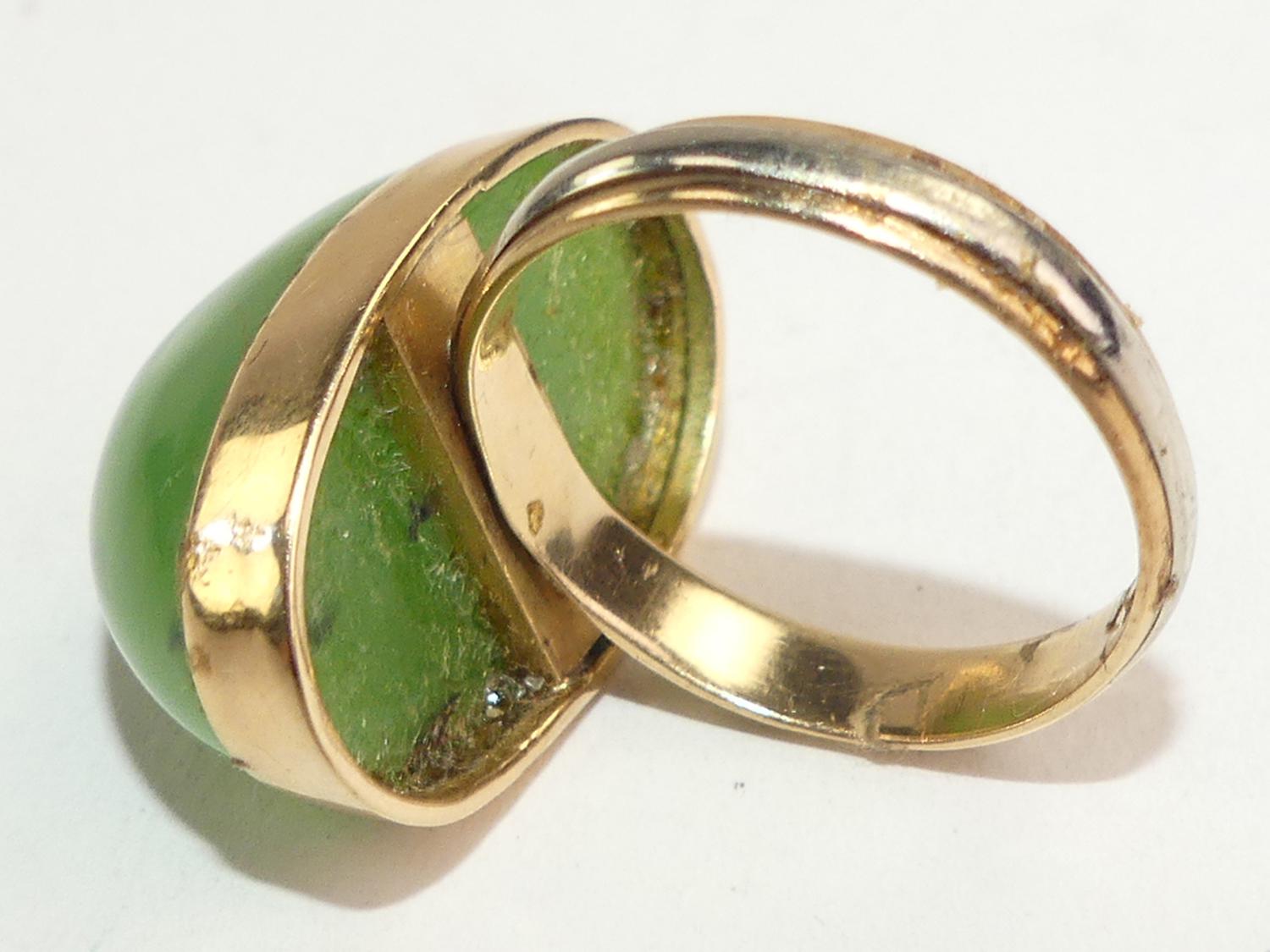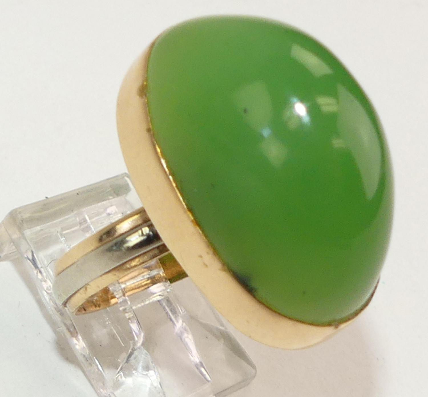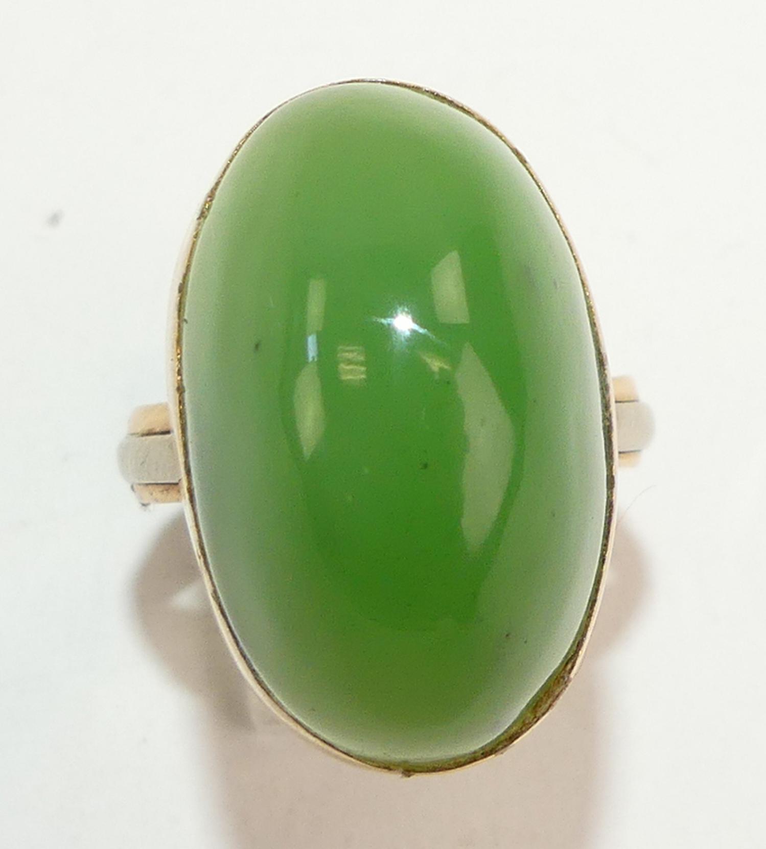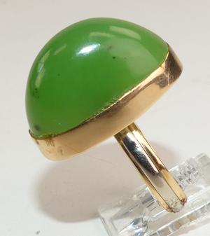 Two tone 14K band put together with a large nephrite cabochon mounted in 14K pink gold. size 10