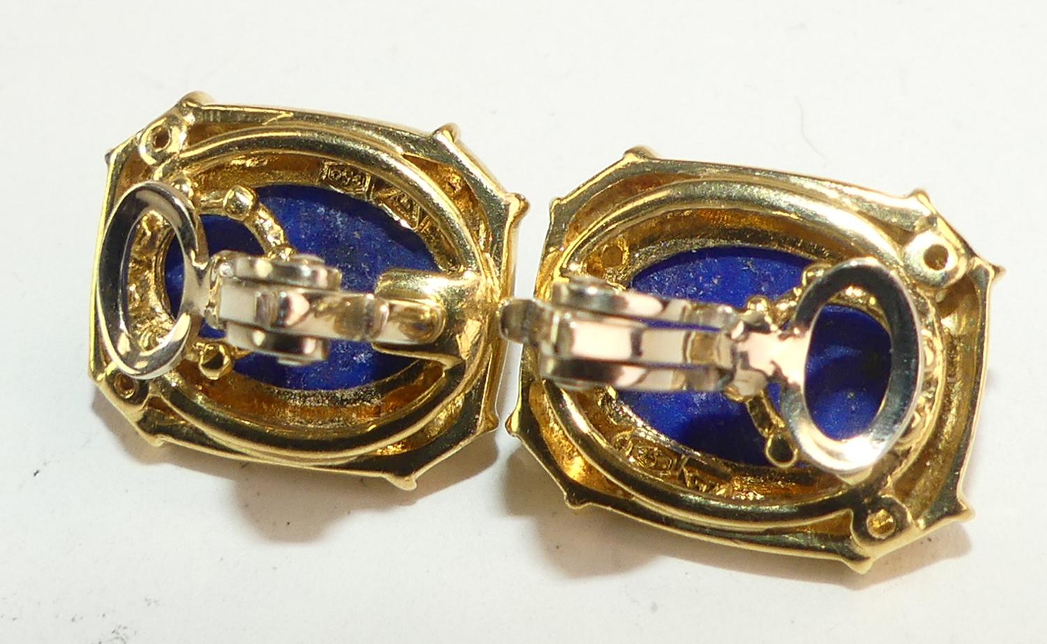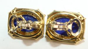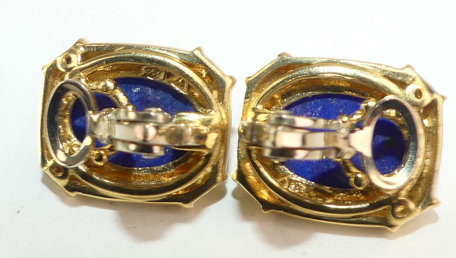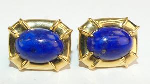 pair of 18k yellow gold lapis lazuli cabochon earrings, 3/4"