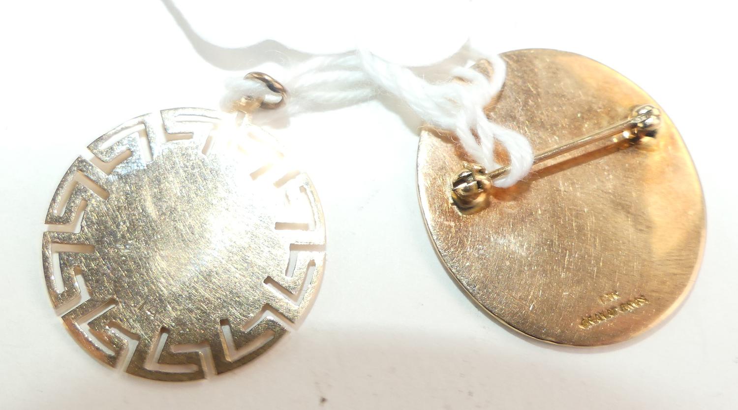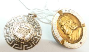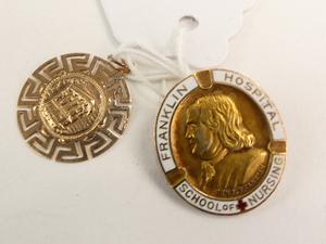two 10k yellow gold pendants, franklin hospital and greek, weiging approx 7 grams