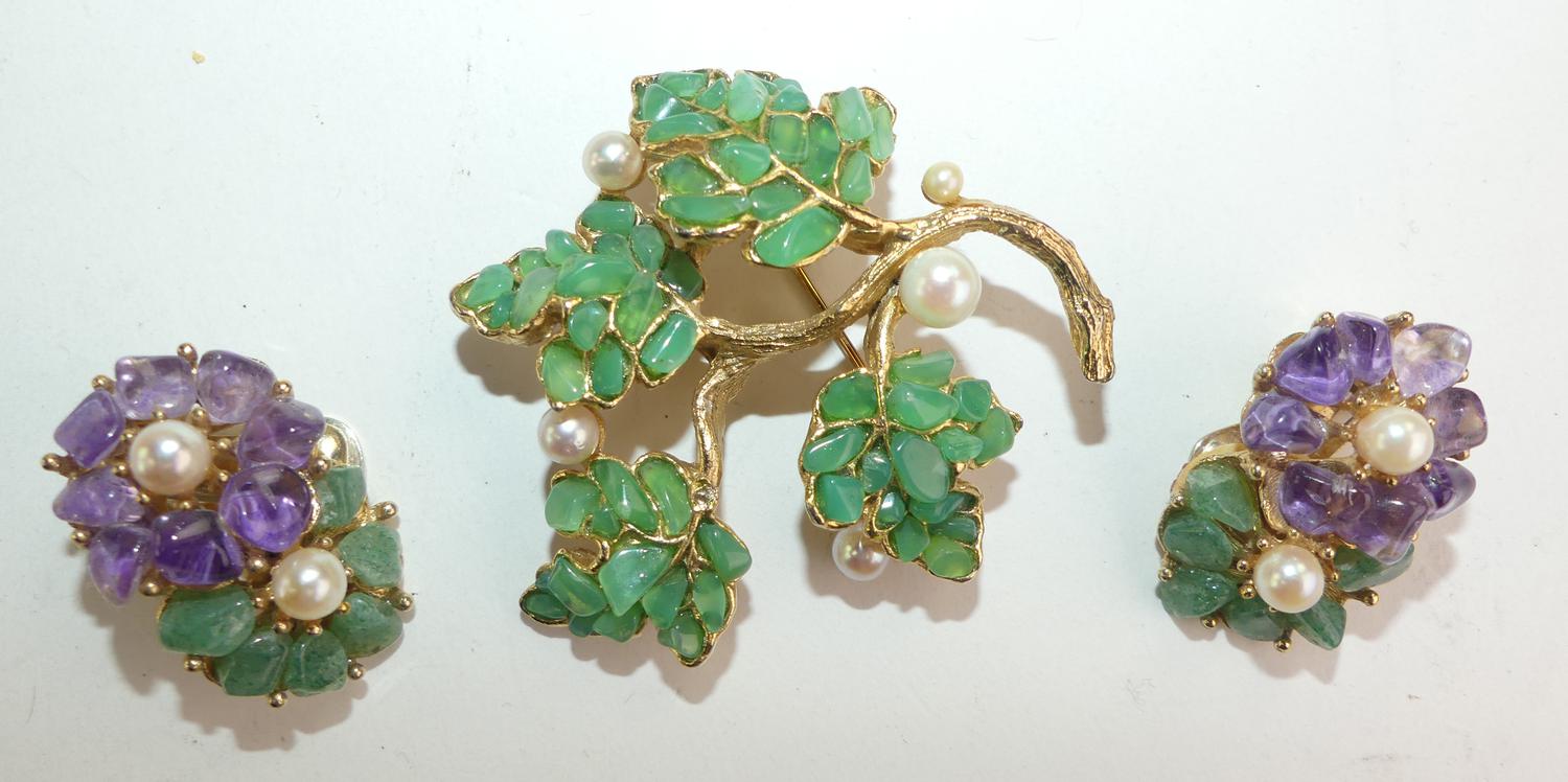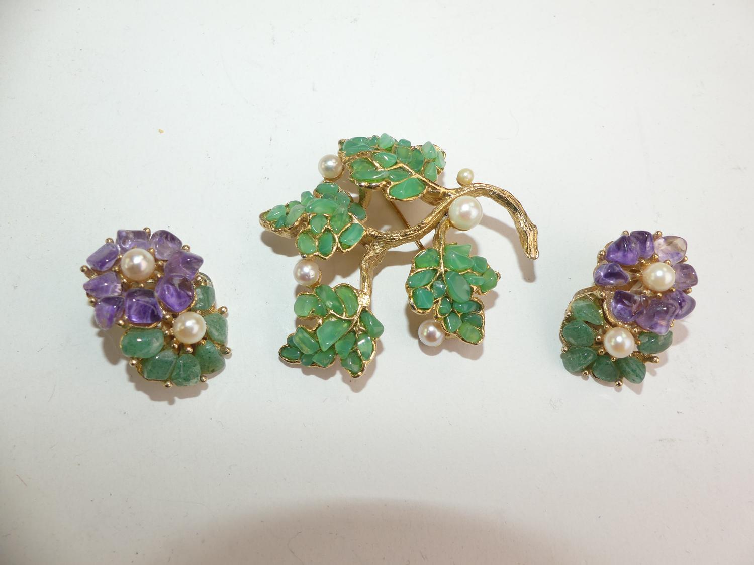pair of raw tumbled amethyst and quartz earrings, brooch