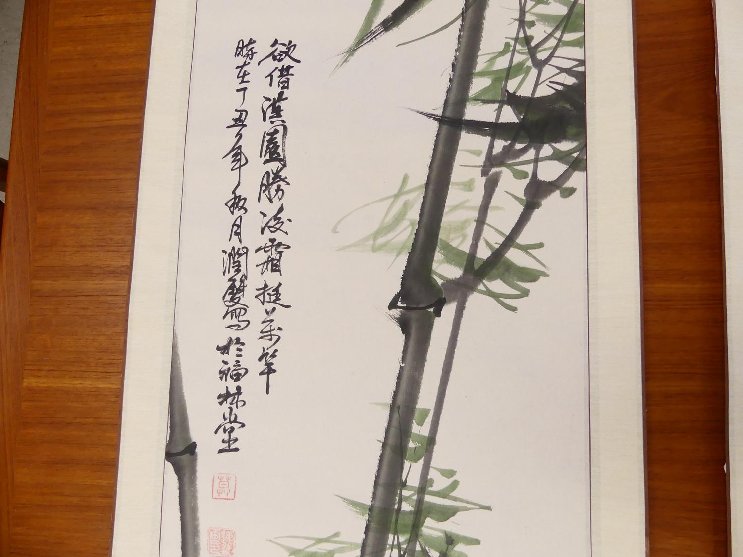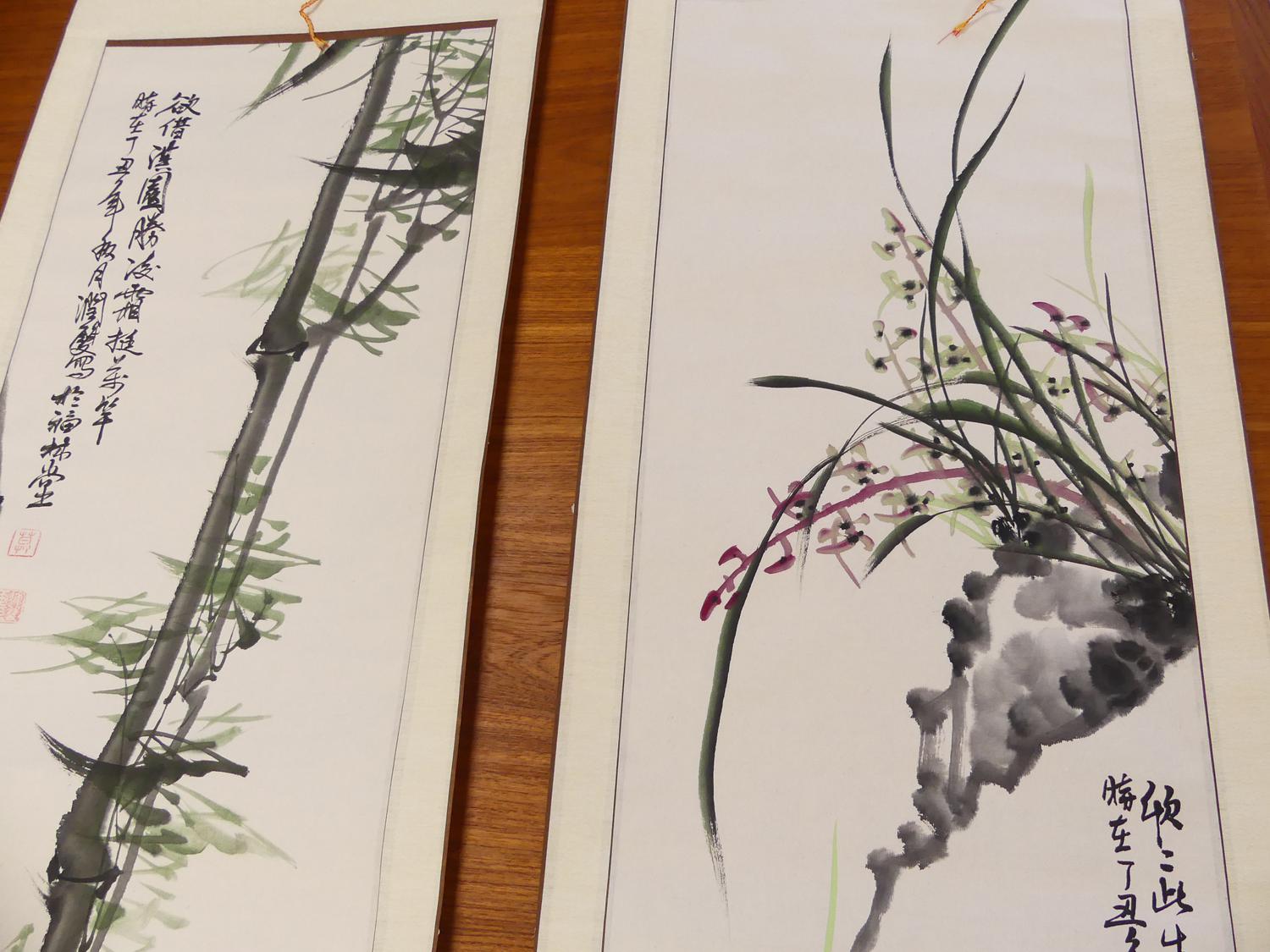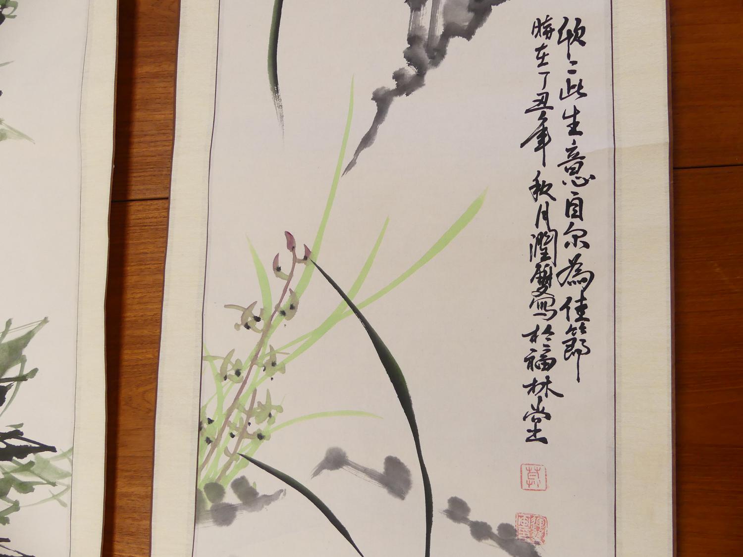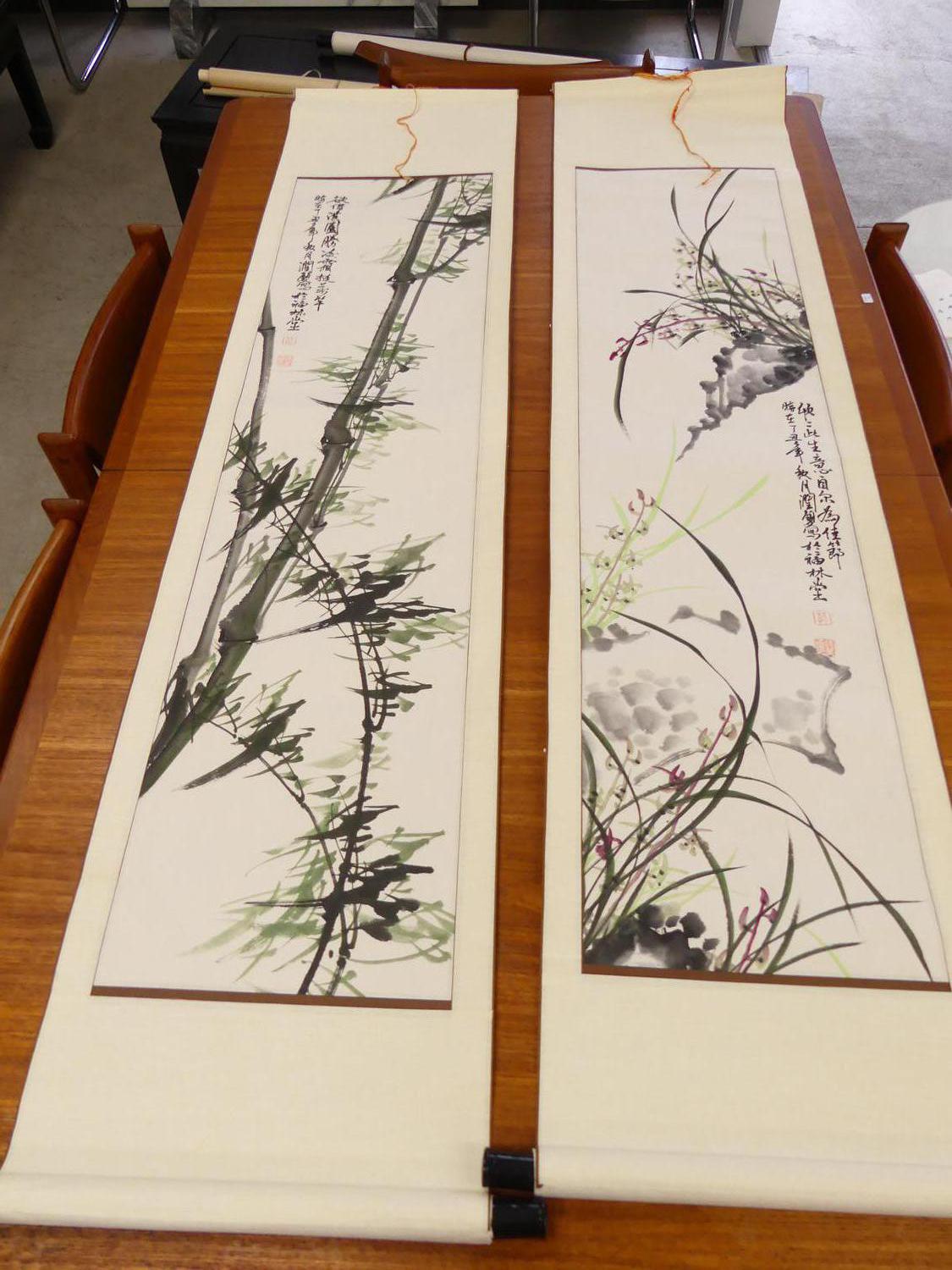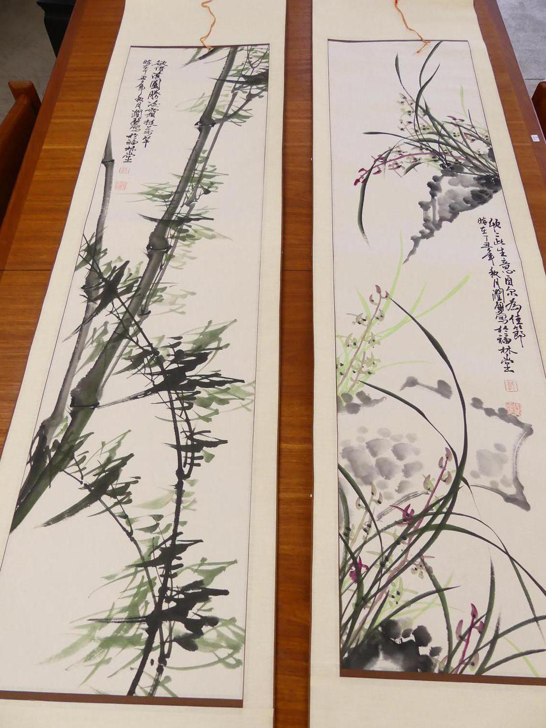 two chinese ink and colour scroll paintings, 68" x 16"