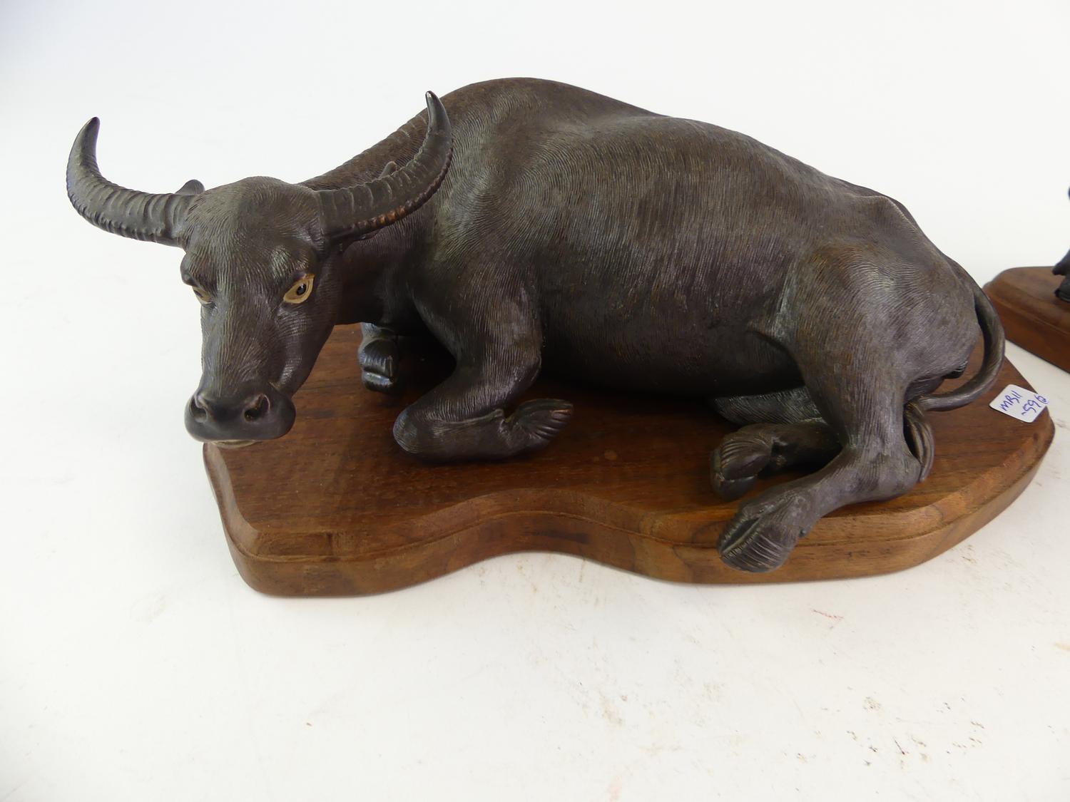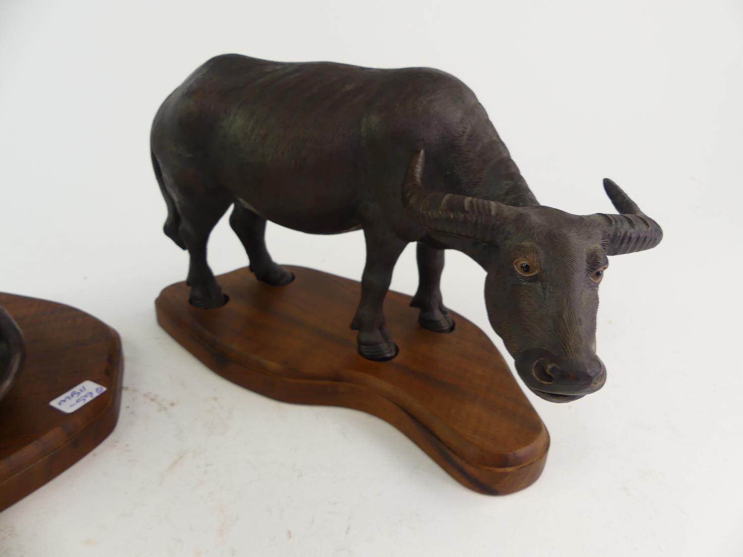 pair of chinese pottery water bufflo on stands, length 11" and smaller