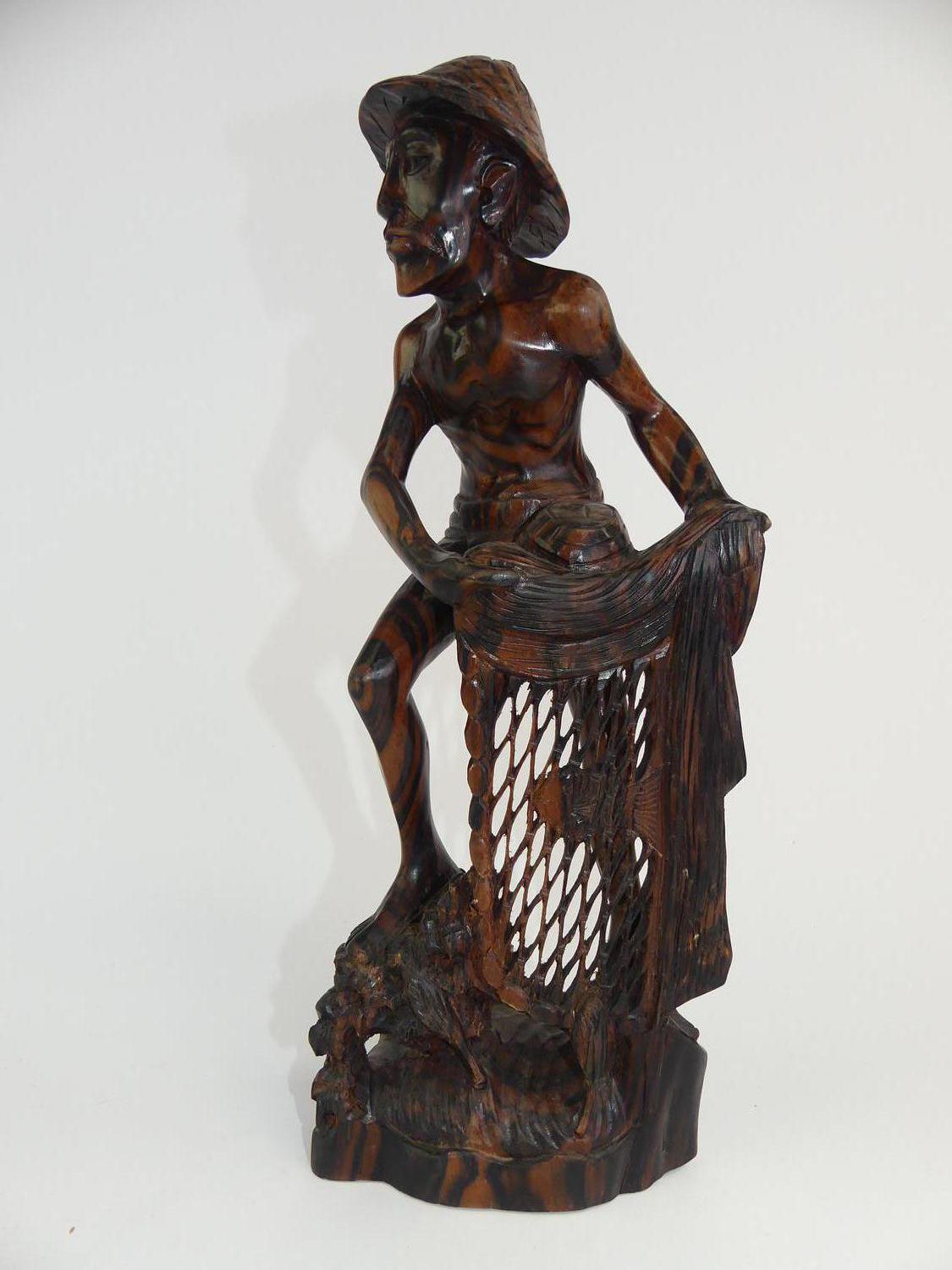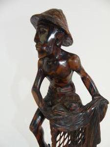 asian carved ebony figure of a fisherman, ht. 14 1/2"