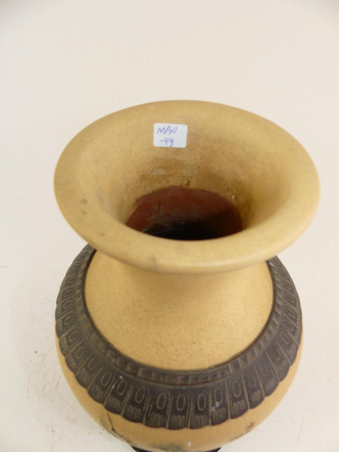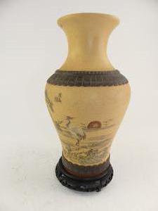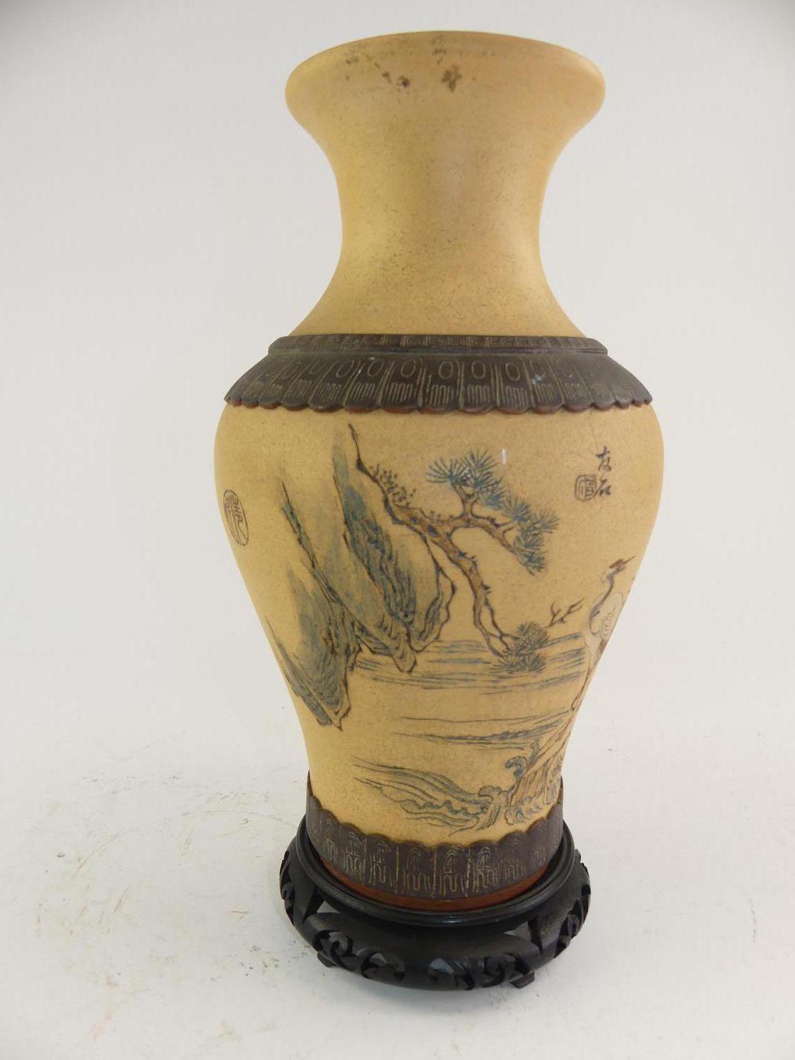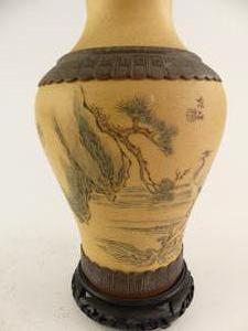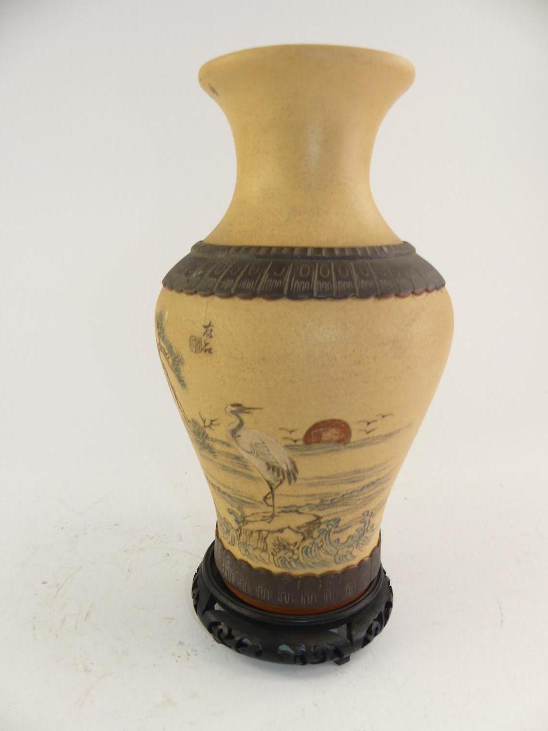 asian painted pottery vase on stand, ht. 14"